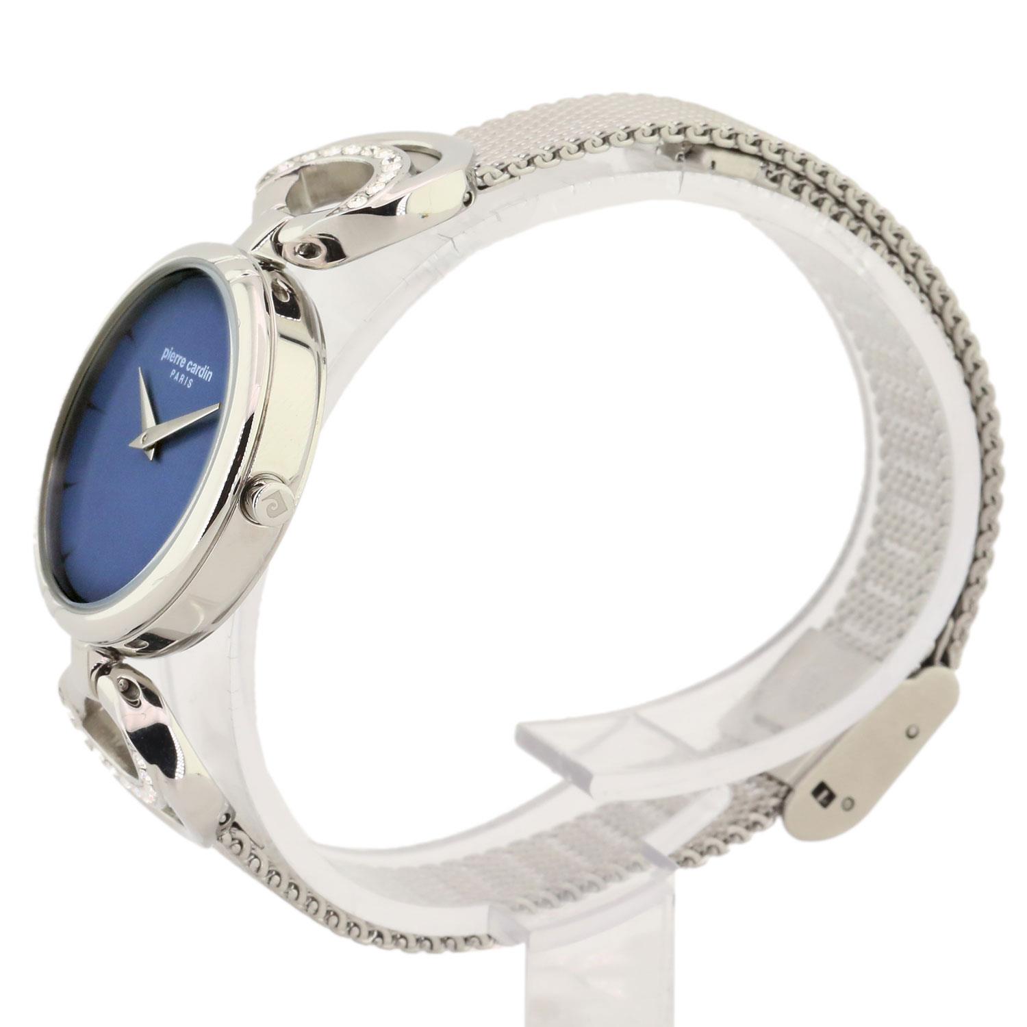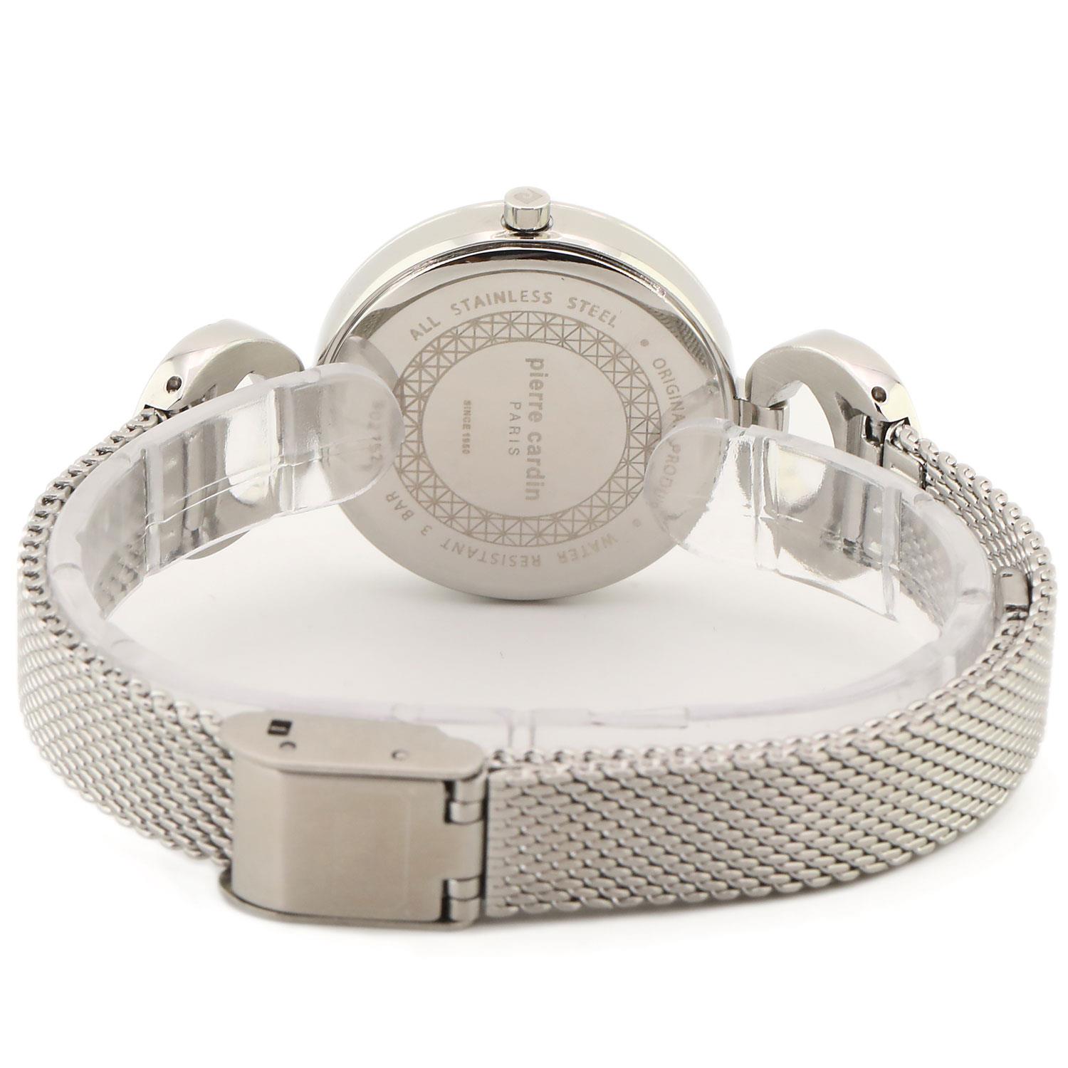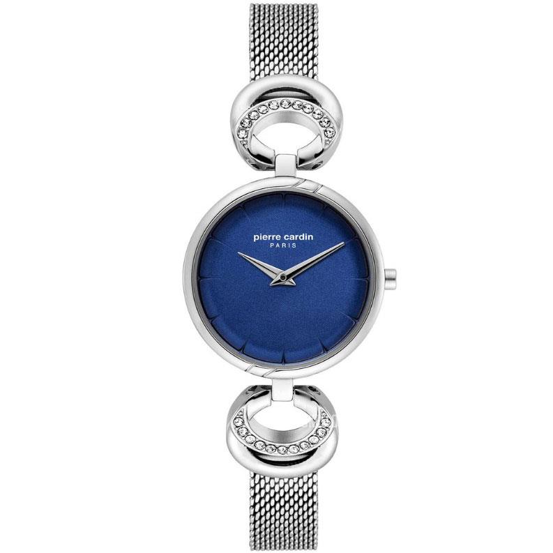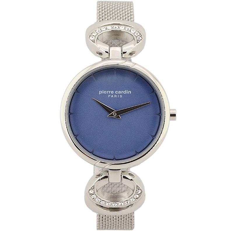 ساعت مچی زنانه پیرکاردین Pierre Cardin با طراحی روزانه بند حصیر بافت استیل و قاب نگین دار استیل با صفحه گرد سرمه ای و موتور ژاپنی با انرژِی باتری و مقاوم در برابر آب تا عمق 30 متر به همراه گارانتی بین المللی