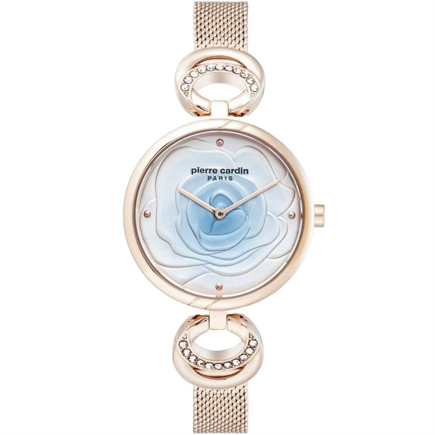 ساعت مچی زنانه پیرکاردین Pierre Cardin با طراحی روزانه بند حصیر بافت مسی و قاب نگین دار مسی با صفحه نقره ای آبی و موتور ژاپنی با انرژِی باتری و مقاوم در برابر آب تا عمق 30 متر به همراه گارانتی بین المللی