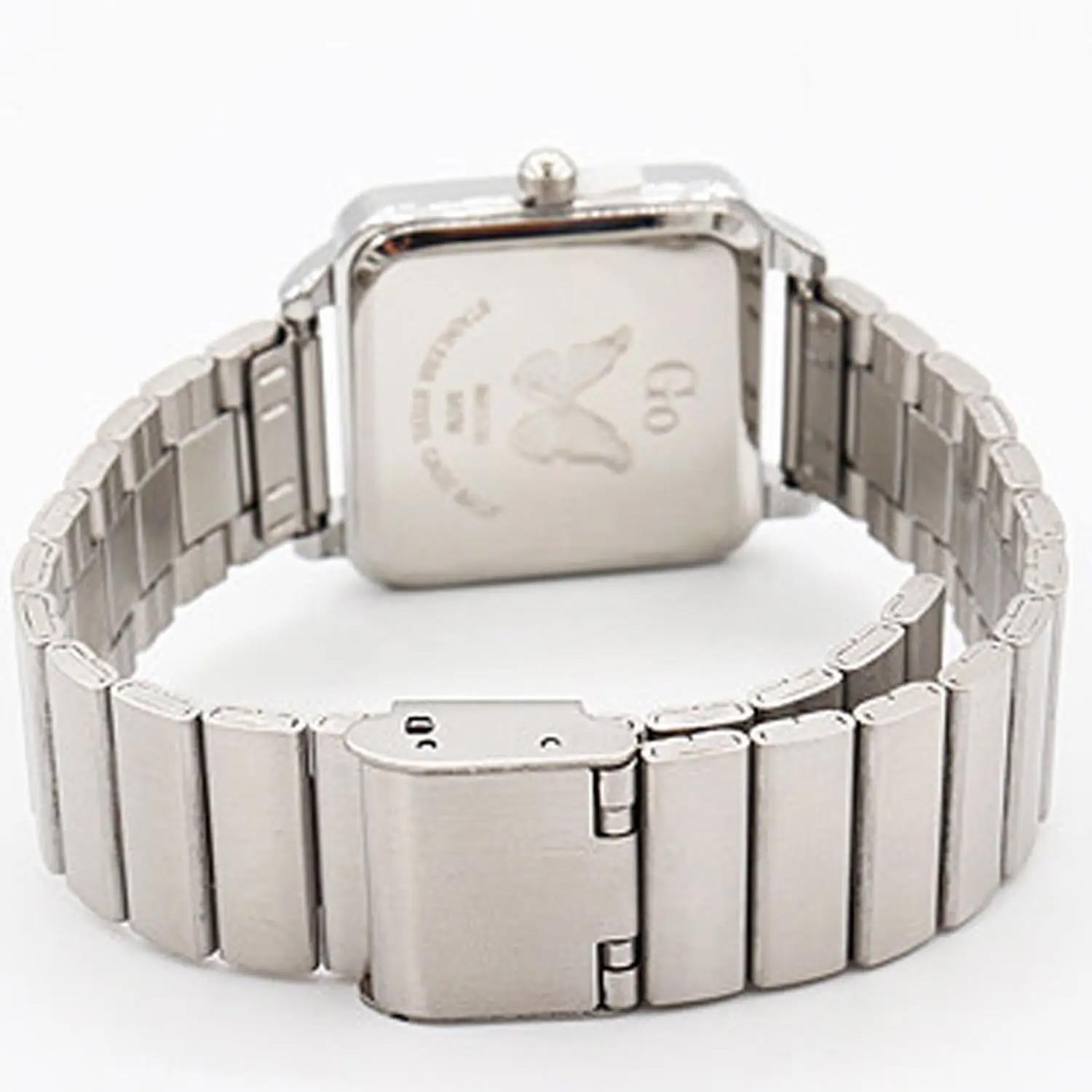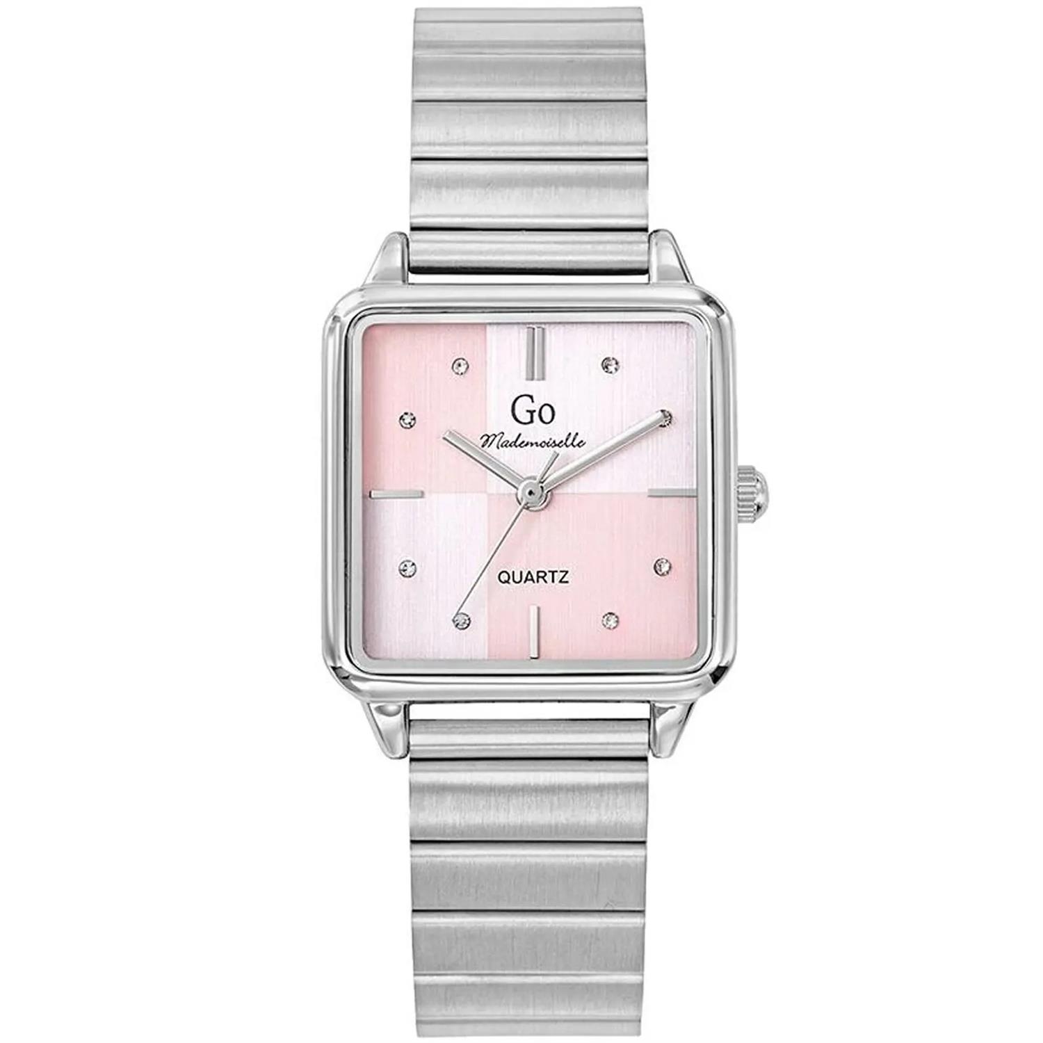 ساعت مچی زنانه جی او go با طراحی روزانه بند استیل و قاب مربعی استیل و صفحه نگین دار صورتی با موتور ژاپنی و انرژی باتری و مقاومت در برابر آب تا عمق 30 متر به همراه دو سال گارانتی بین المللی