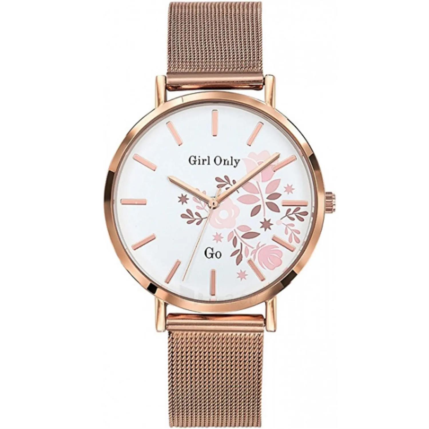 ساعت مچی زنانه جی او go با طراحی روزانه بند حصیر بافت مسی و قاب فلزی مسی و صفحه طرحدار سفید با موتور ژاپنی و انرژی باتری و مقاومت در برابر آب تا عمق 30 متر به همراه دو سال گارانتی بین المللی