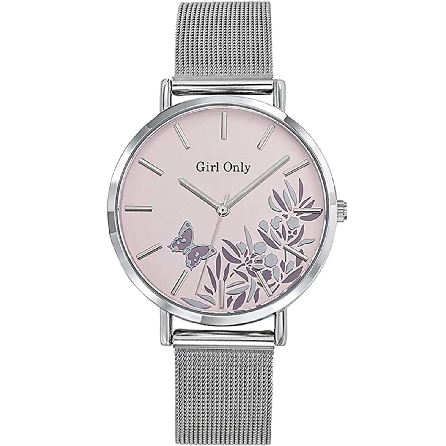 ساعت مچی زنانه جی او go با طراحی روزانه بند حصیر بافت استیل و قاب استیل و صفحه طرحدار صورتی با موتور ژاپنی و انرژی باتری و مقاومت در برابر آب تا عمق 30 متر به همراه دو سال گارانتی بین المللی