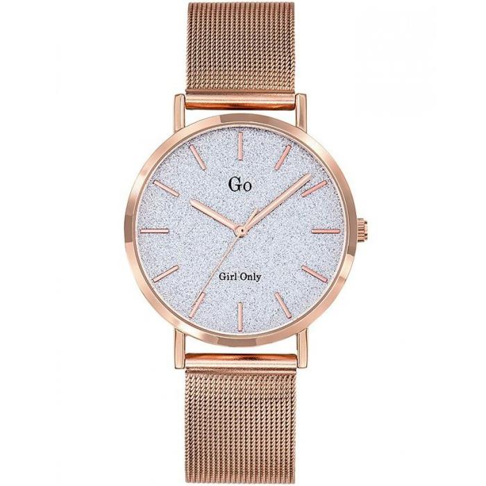 ساعت مچی زنانه جی او go با طراحی روزانه بند حصیر بافت مسی و قاب گرد مسی و صفحه گرد نقره ای با موتور ژاپنی و انرژی باتری و مقاومت در برابر آب تا عمق 30 متر به همراه دو سال گارانتی بین المللی