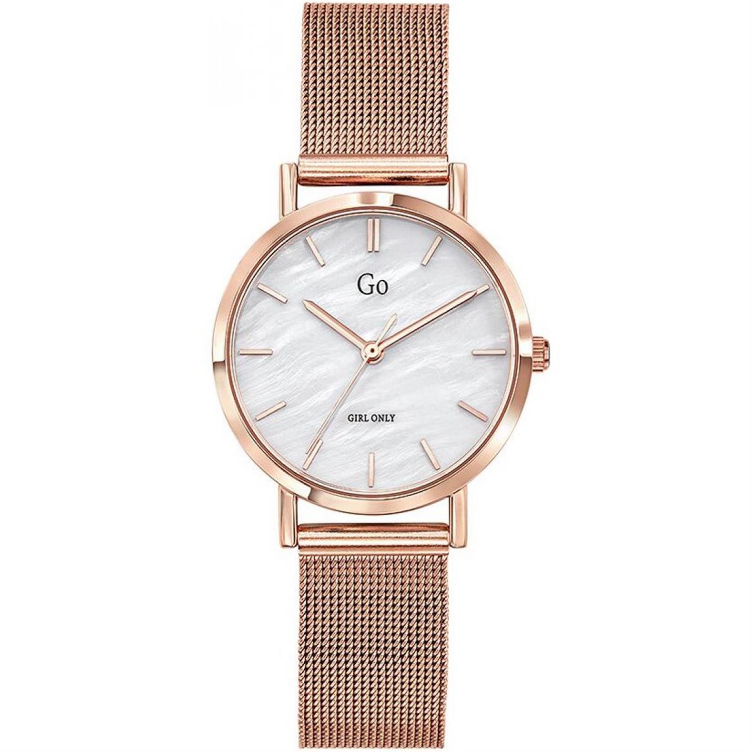 ساعت مچی زنانه جی او go با طراحی روزانه بند حصیر بافت مسی و قاب مسی و صفحه گرد سفید صدفی با موتور ژاپنی و انرژی باتری و مقاومت در برابر آب تا عمق 30 متر به همراه دو سال گارانتی بین المللی
