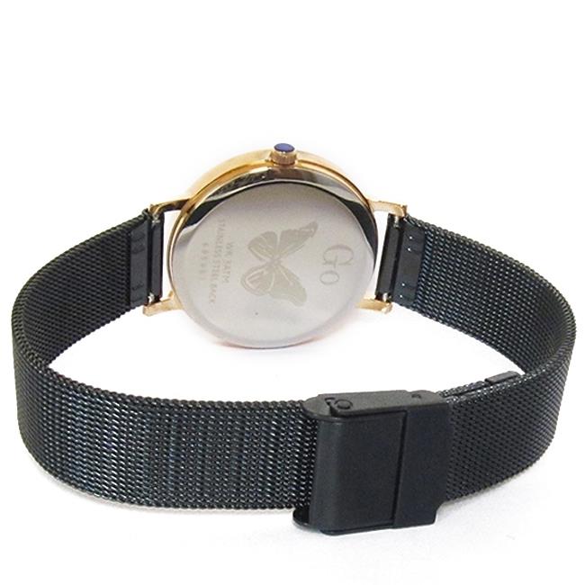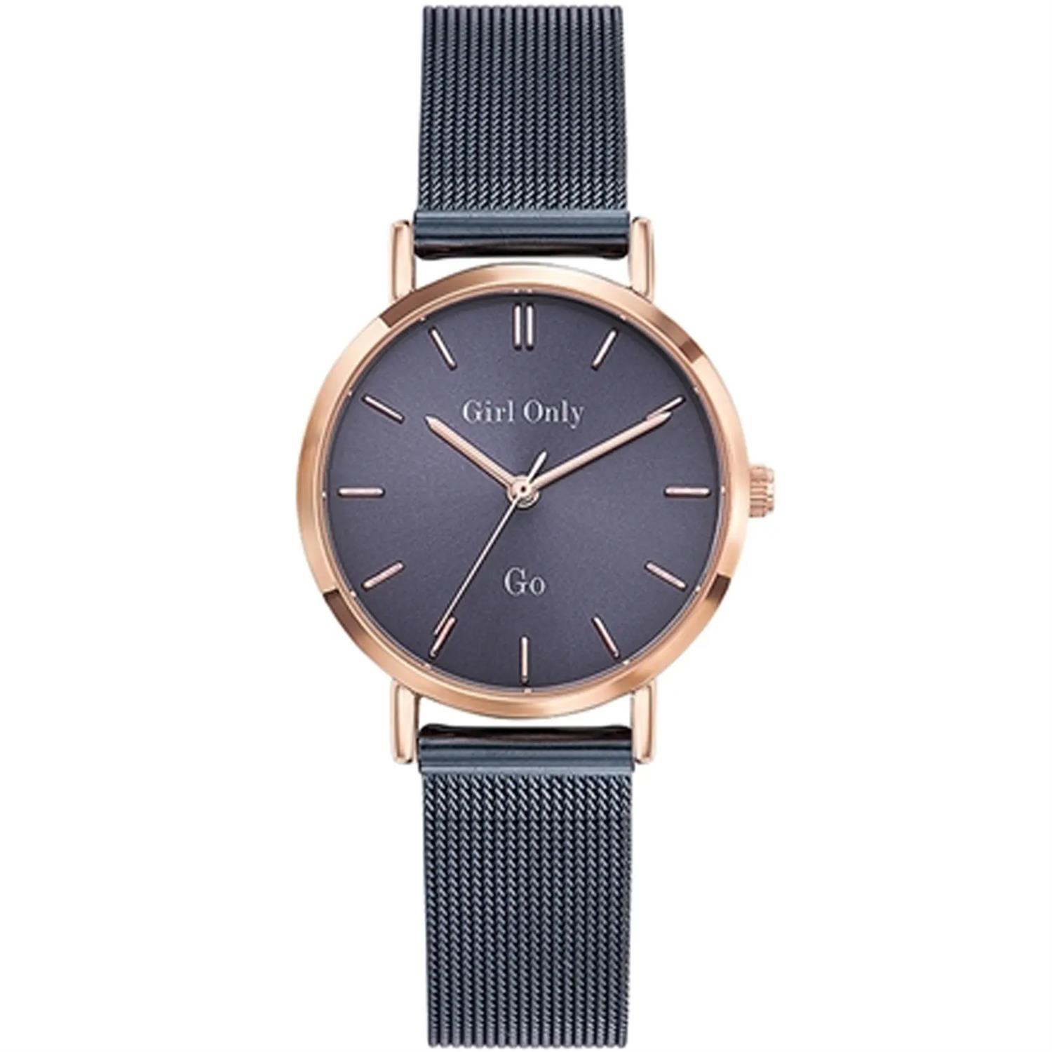 ساعت مچی زنانه جی او go با طراحی روزانه بند حصیر بافت سرمه ای و قاب فلزی مسی و صفحه گرد سرمه ای با موتور ژاپنی و انرژی باتری و مقاومت در برابر آب تا عمق 30 متر به همراه دو سال گارانتی بین المللی