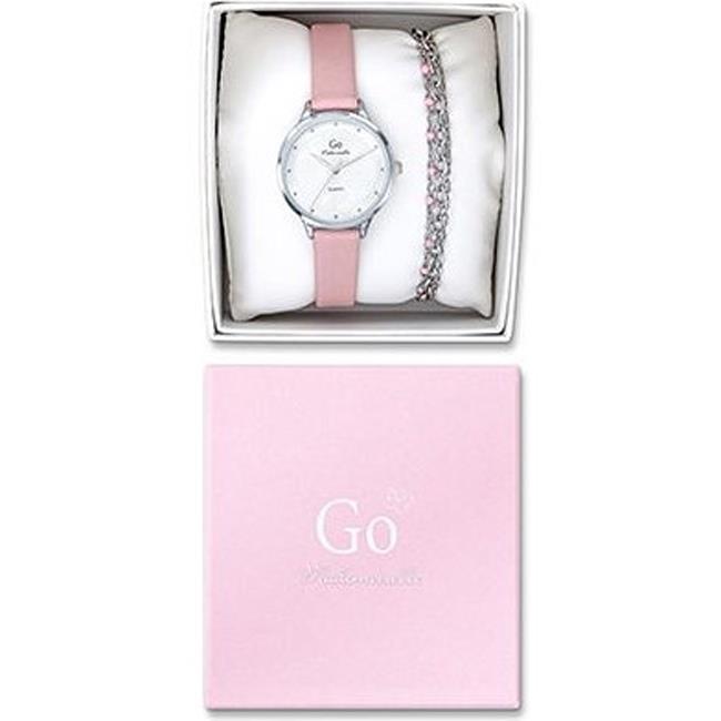 ساعت مچی زنانه جی او go با طراحی روزانه بند چرمی صورتی و قاب فلزی و صفحه گرد سفید با موتور ژاپنی و انرژی باتری و مقاومت در برابر آب تا عمق 30 متر به همراه دو سال گارانتی بین المللی