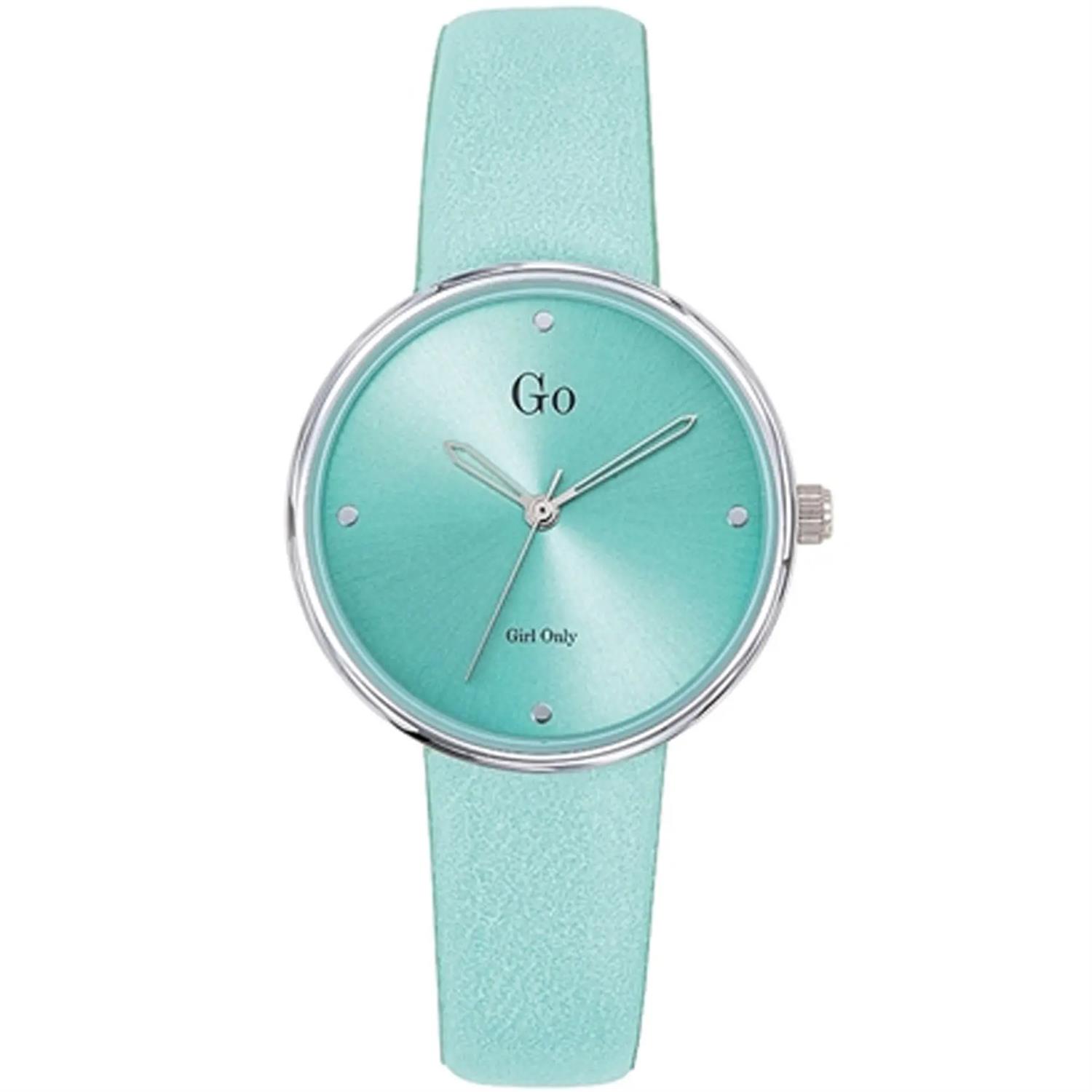 ساعت مچی زنانه جی او go با طراحی روزانه بند چرمی آبی و قاب فلزی نقره ای و صفحه گرد آبی با موتور ژاپنی و انرژی باتری و مقاومت در برابر آب تا عمق 30 متر به همراه دو سال گارانتی بین المللی