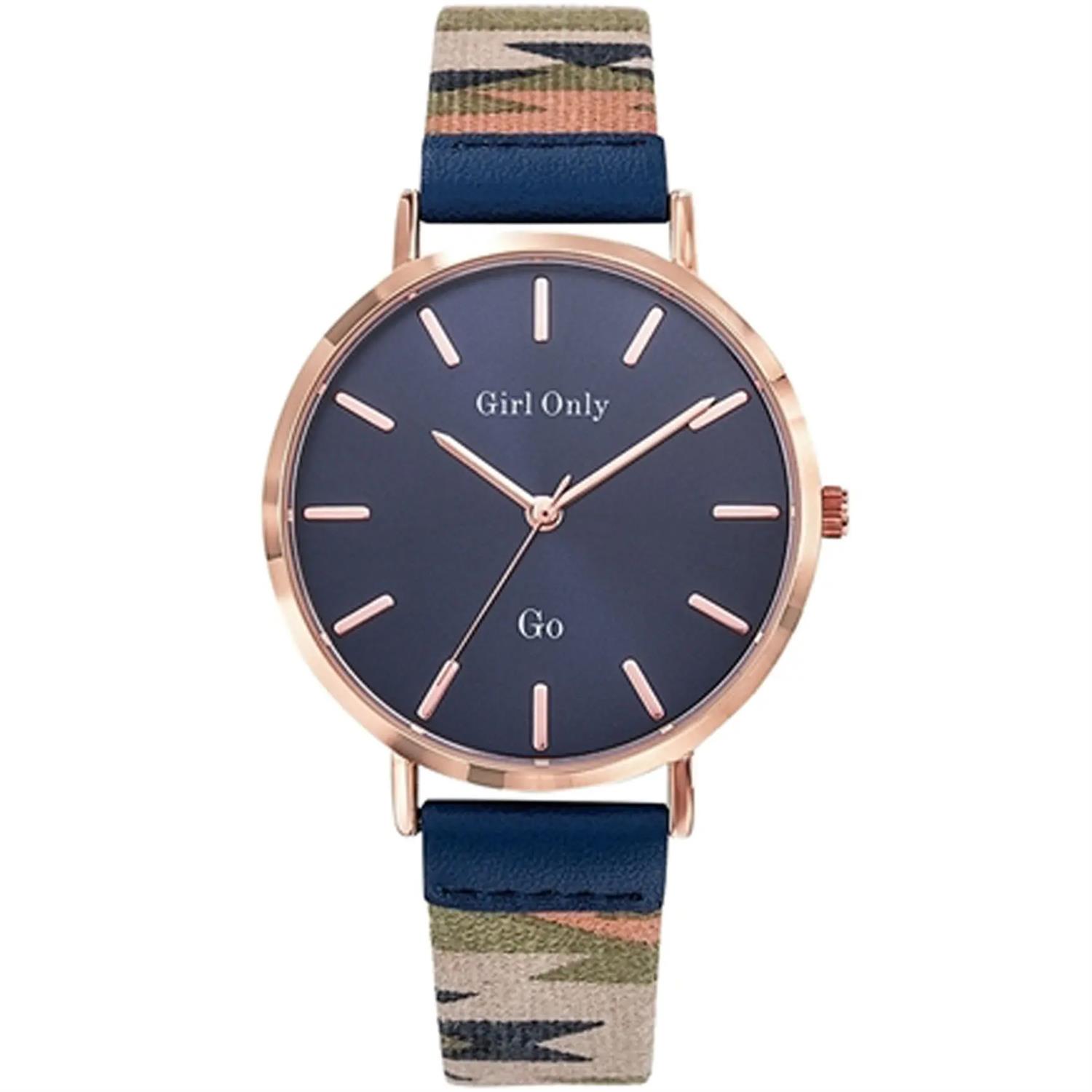ساعت مچی زنانه جی او go با طراحی روزانه بند چرمی چند رنگ و قاب فلزی مسی و صفحه گرد سرمه ای با موتور ژاپنی و انرژی باتری و مقاومت در برابر آب تا عمق 30 متر به همراه دو سال گارانتی بین المللی