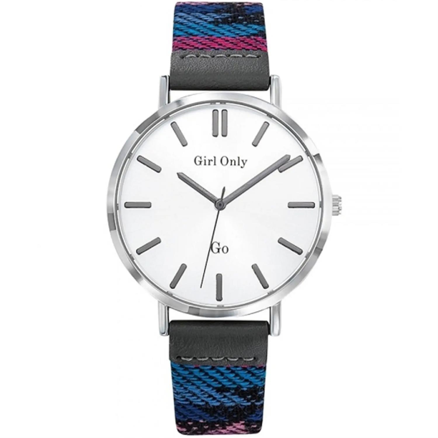 ساعت مچی زنانه جی او go با طراحی روزانه بند چرمی چند رنگ و قاب فلزی و صفحه گرد سفید با موتور ژاپنی و انرژی باتری و مقاومت در برابر آب تا عمق 30 متر به همراه دو سال گارانتی بین المللی