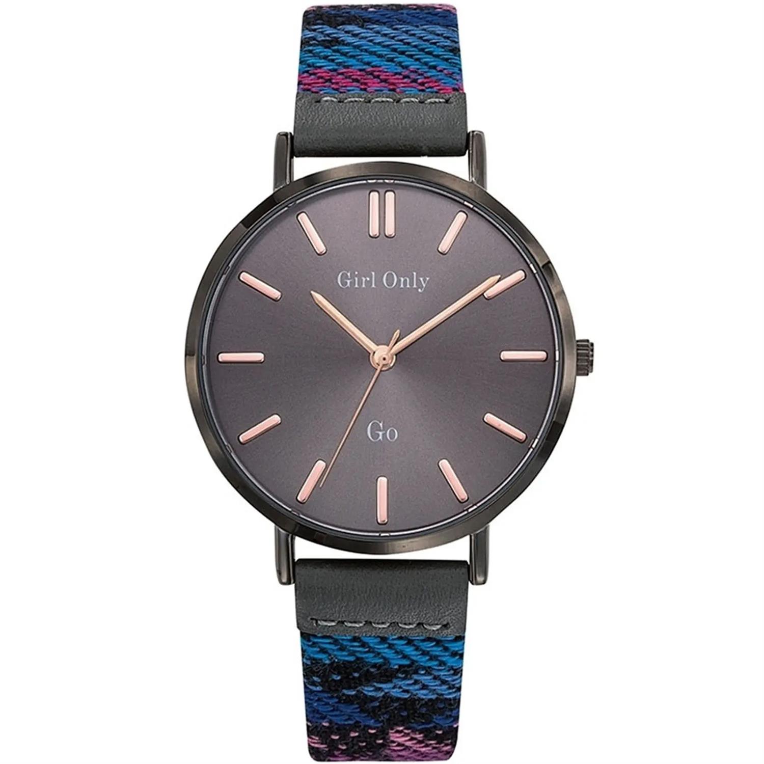 ساعت مچی زنانه جی او go با طراحی روزانه بند چرمی چند رنگ و قاب فلزی طوسی و صفحه گرد طوسی با موتور ژاپنی و انرژی باتری و مقاومت در برابر آب تا عمق 30 متر به همراه دو سال گارانتی بین المللی