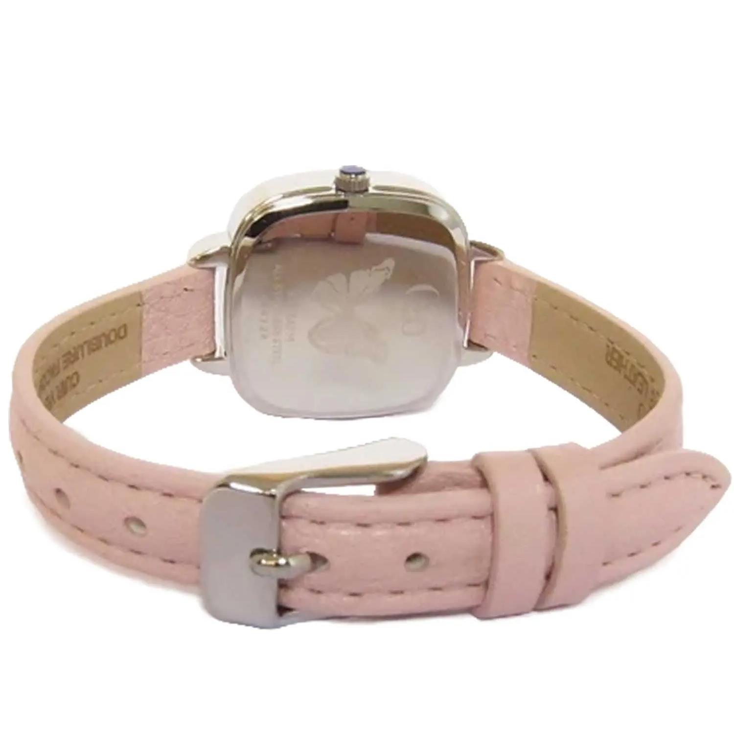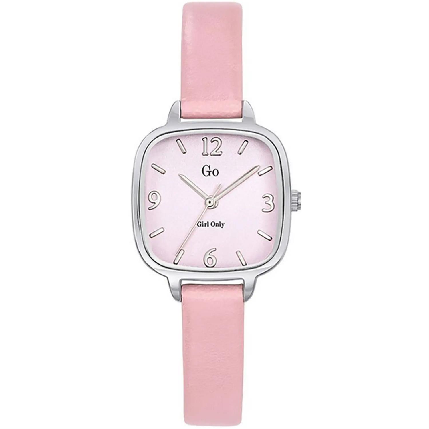 ساعت مچی زنانه جی او go با طراحی روزانه بند چرمی صورتی و قاب فلزی و صفحه مربع صورتی با موتور ژاپنی و انرژی باتری و مقاومت در برابر آب تا عمق 30 متر به همراه دو سال گارانتی بین المللی
