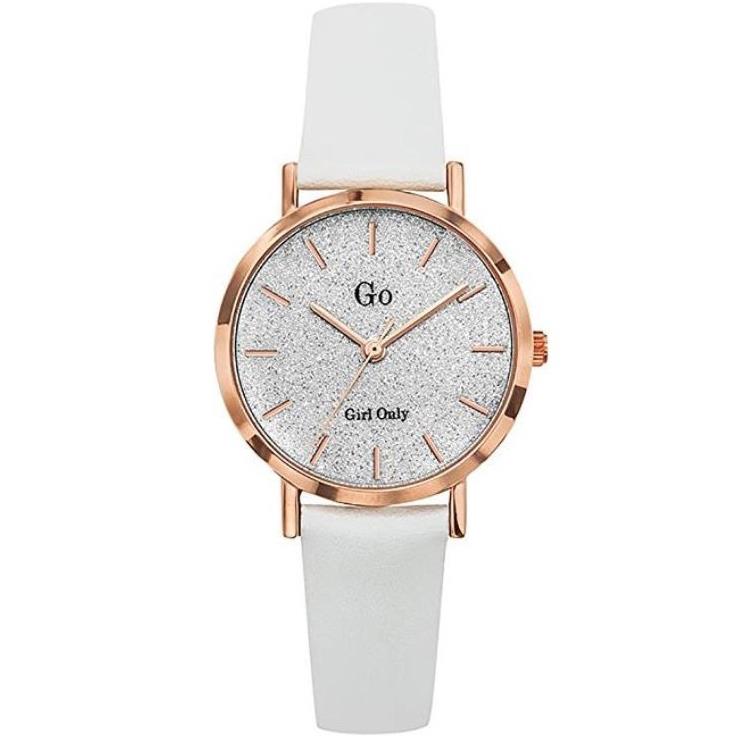 ساعت مچی زنانه جی او go با طراحی روزانه بند چرمی سفید و قاب فلزی مسی و صفحه گرد نقره ای با موتور ژاپنی و انرژی باتری و مقاومت در برابر آب تا عمق 30 متر به همراه دو سال گارانتی بین المللی