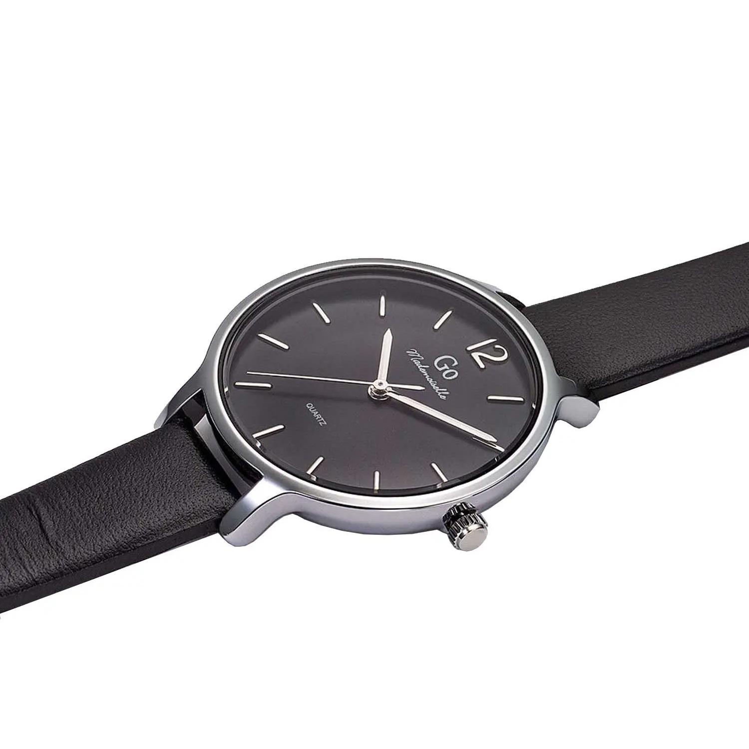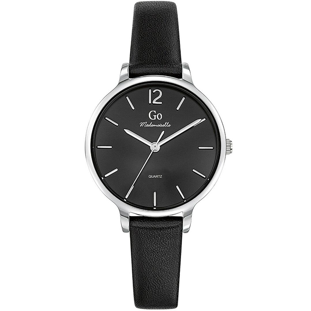 ساعت مچی زنانه جی او go با طراحی روزانه بند چرمی مشکی و قاب فلزی و صفحه گرد مشکی با موتور ژاپنی و انرژی باتری و مقاومت در برابر آب تا عمق 30 متر به همراه دو سال گارانتی بین المللی