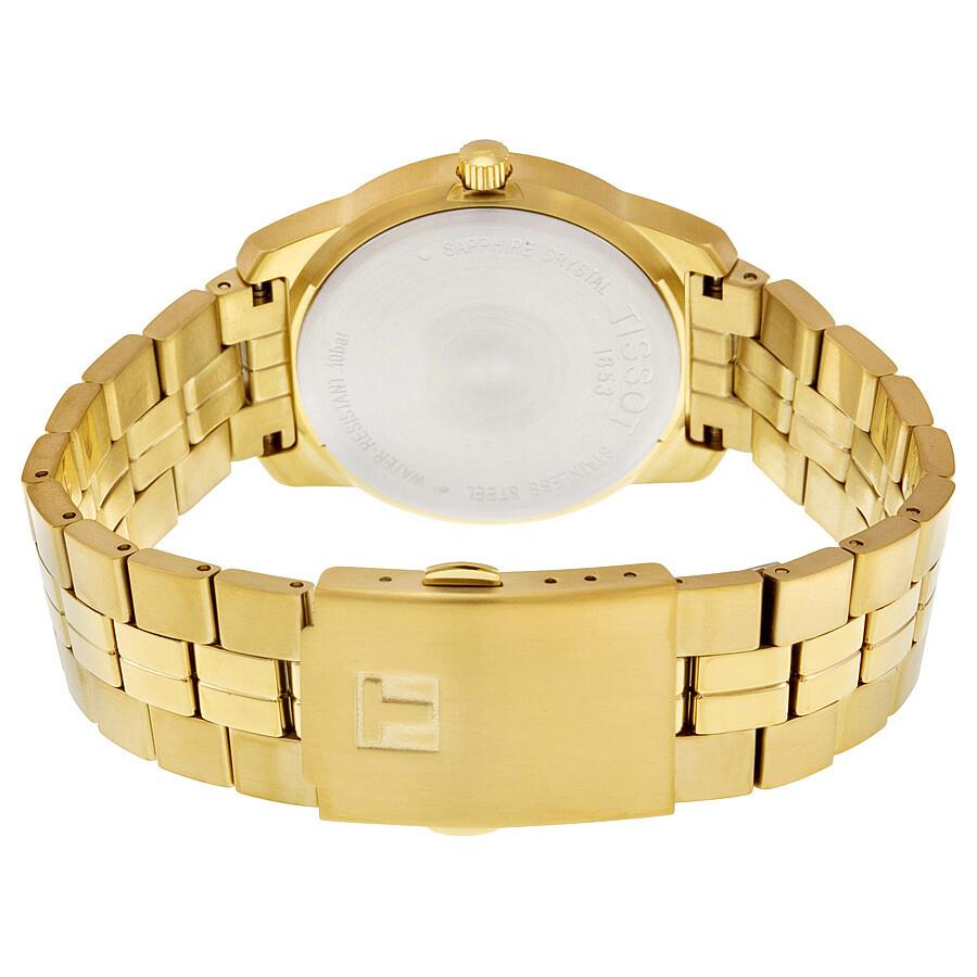 ساعت مچی زنانه TISSOT با طراحی اسپرت بند فلزی طلایی با قاب فلزی طلایی و صفحه نقره ای با شیشه ضد خراش و قابلیت داشتن شب نما / تقویم و موتور سوییسی با انرژی باتری و مقاوم در برابر آب تا عمق 100 متر به همراه گارانتی بین المللی