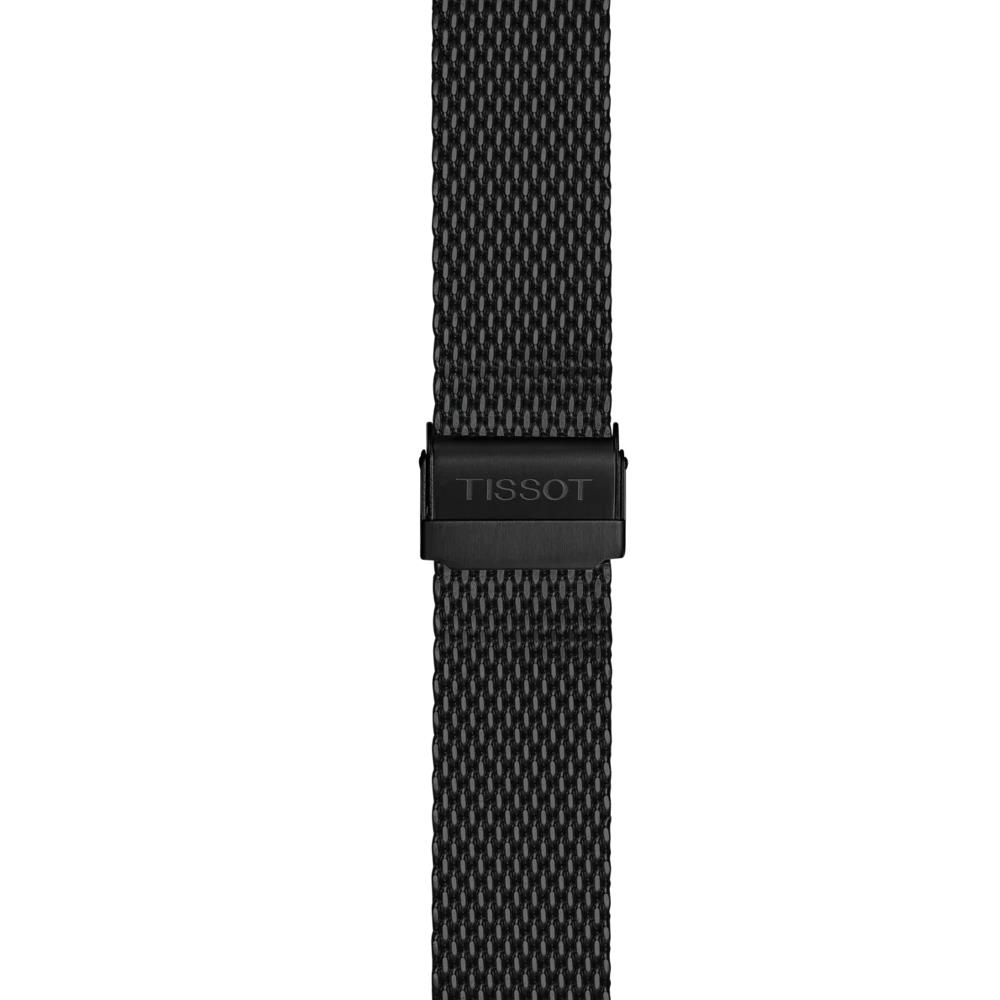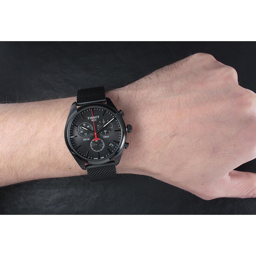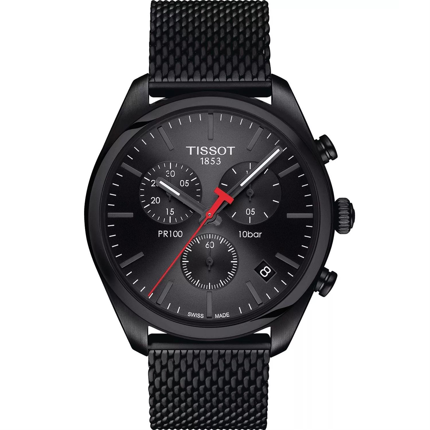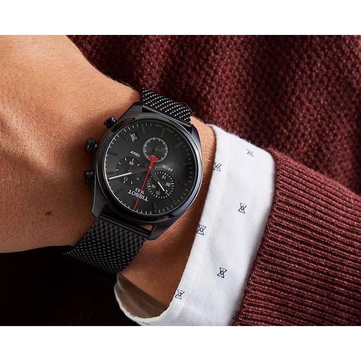 ساعت مچی مردانه TISSOT با طراحی روزانه بند حصیر بافت مشکی با قاب فلزی مشکی و صفحه گرد مشکی و نمایشگر عقربه ای با شیشه ضد خراش و موتورسوییسی با انرژی باتری و قابلیت داشتن تقویم شب نما کرنوگراف و مقاوم در برابر آب تا عمق 100 متر به همراه گارانتی بین المللی