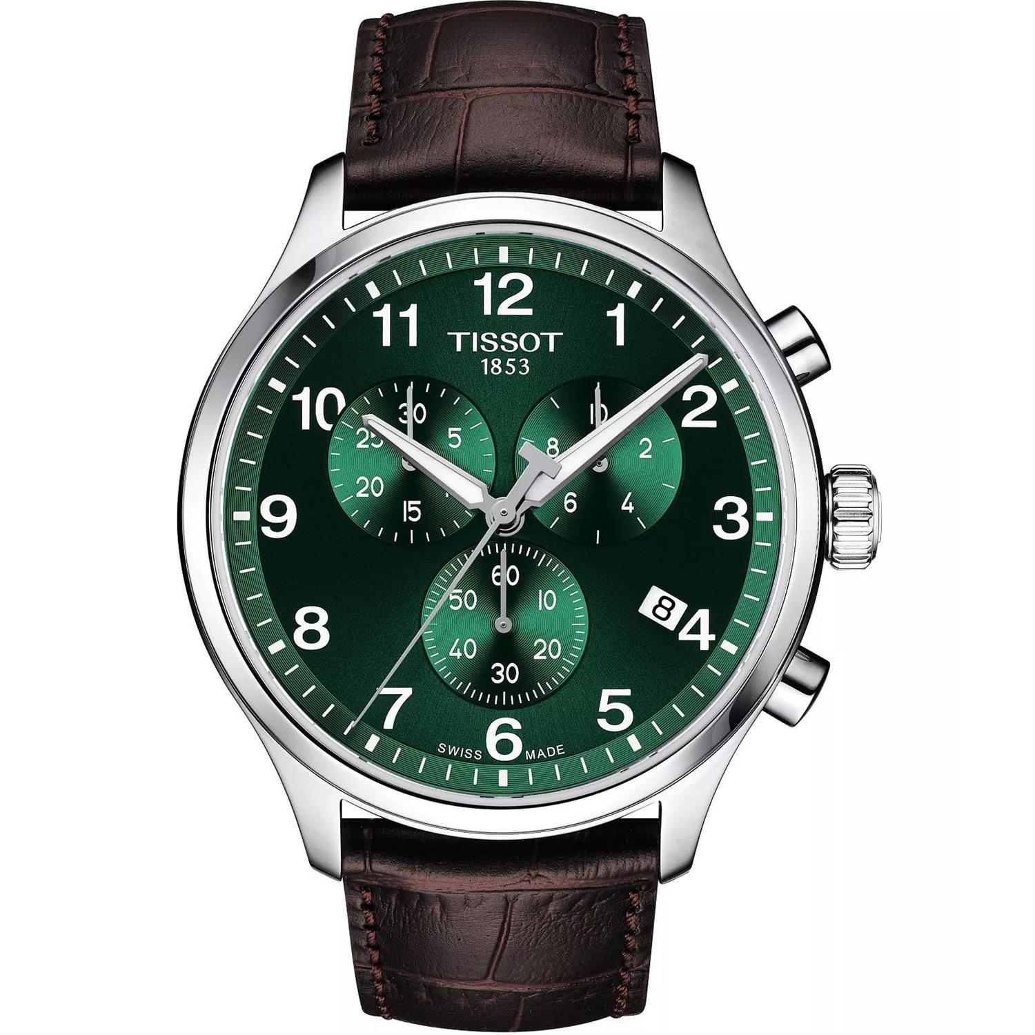 ساعت مچی مردانه TISSOT با طراحی روزانه بند چرمی قهوه ای با قاب استیل و صفحه  گرد سبز با نمایشگر عقربه ای با شیشه ضد خراش و موتور سوییسی با  انرژی باتری و قابلیت داشتن تقویم شب نما کرنوگراف و مقاوم در برابر آب تا عمق 100 متر به همراه گارانتی بین المللی