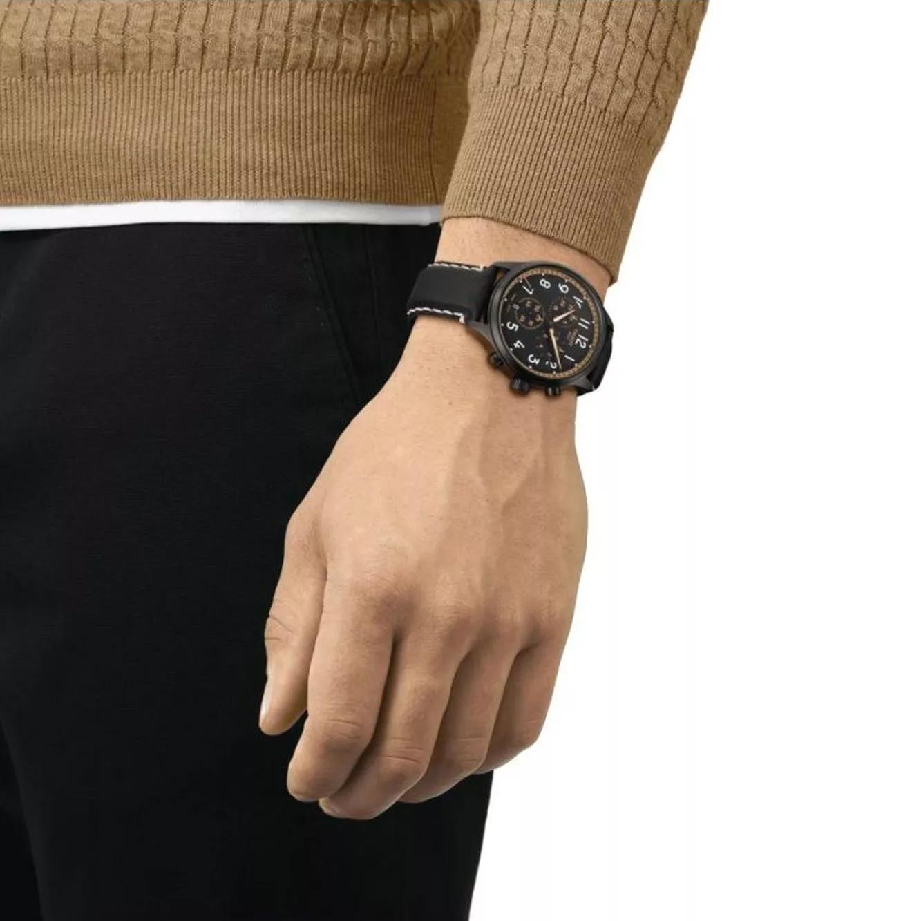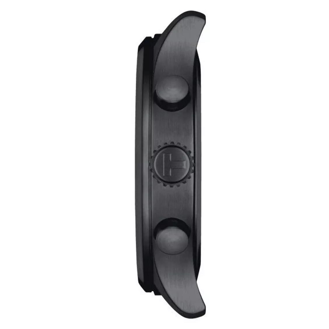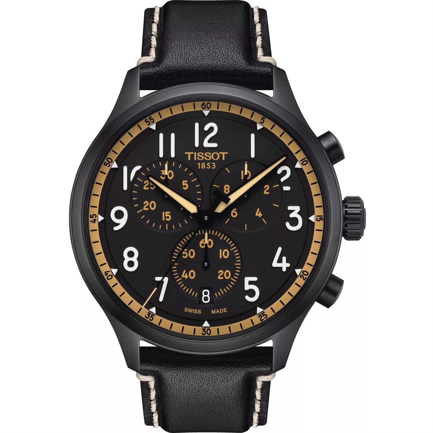 ساعت مچی مردانه TISSOT با طراحی روزانه بند چرمی مشکی با قاب فلزی مشکی و صفحه  گرد مشکی با نمایشگر عقربه ای با شیشه ضد خراش و موتور سوییسی با  انرژی باتری و قابلیت داشتن تقویم شب نما کرنوگراف و مقاوم در برابر آب تا عمق 100 متر به همراه گارانتی بین المللی