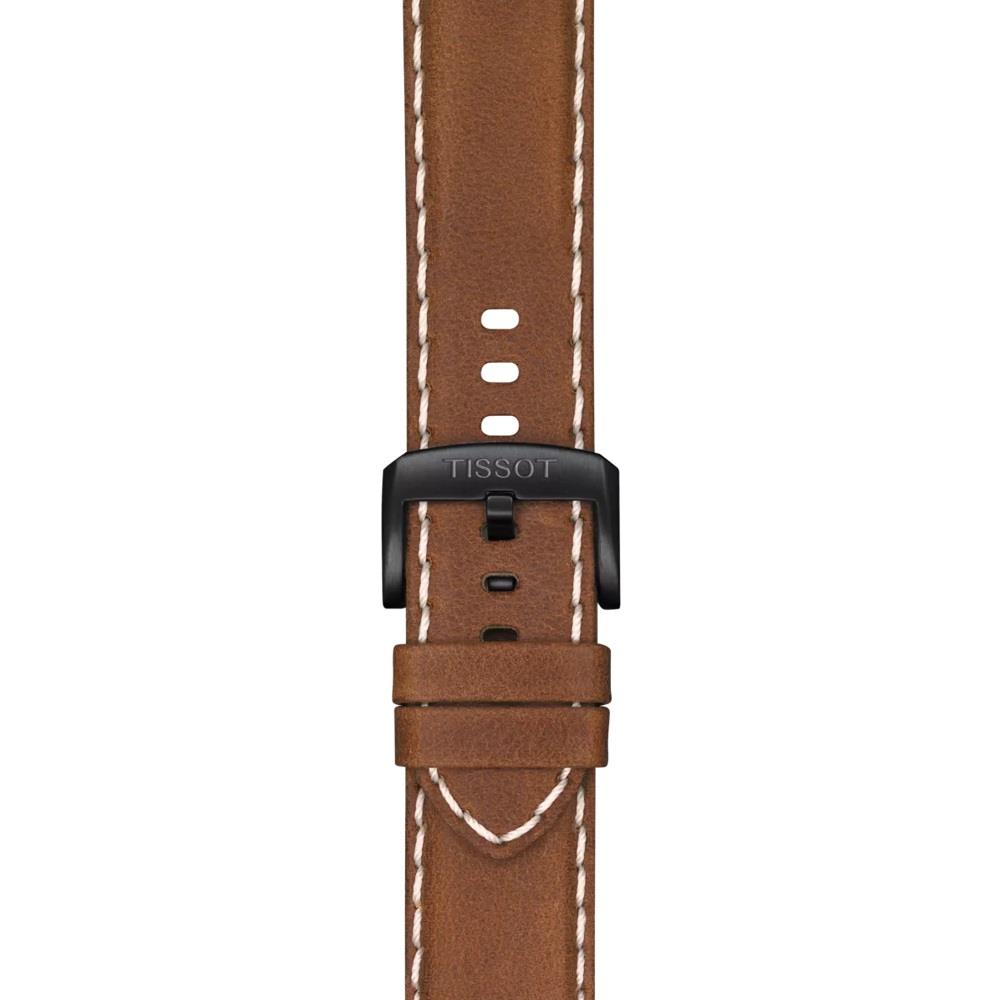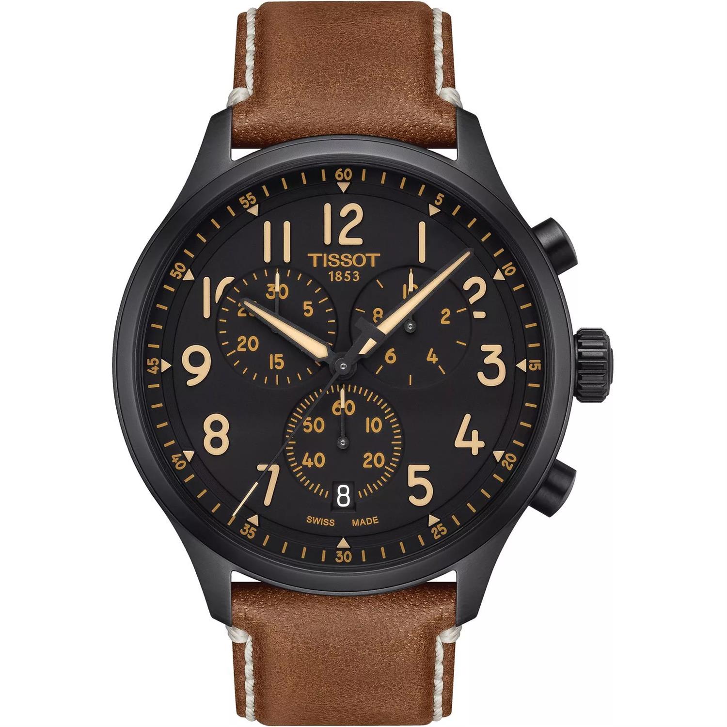 ساعت مچی مردانه TISSOT با طراحی روزانه بند چرمی  قهوه ای با قاب فلزی مشکی و صفحه  گرد مشکی با نمایشگر عقربه ای با شیشه ضد خراش و موتور سوییسی با  انرژی باتری و قابلیت داشتن تقویم شب نما کرنوگراف و مقاوم در برابر آب تا عمق 100 متر به همراه گارانتی بین المللی