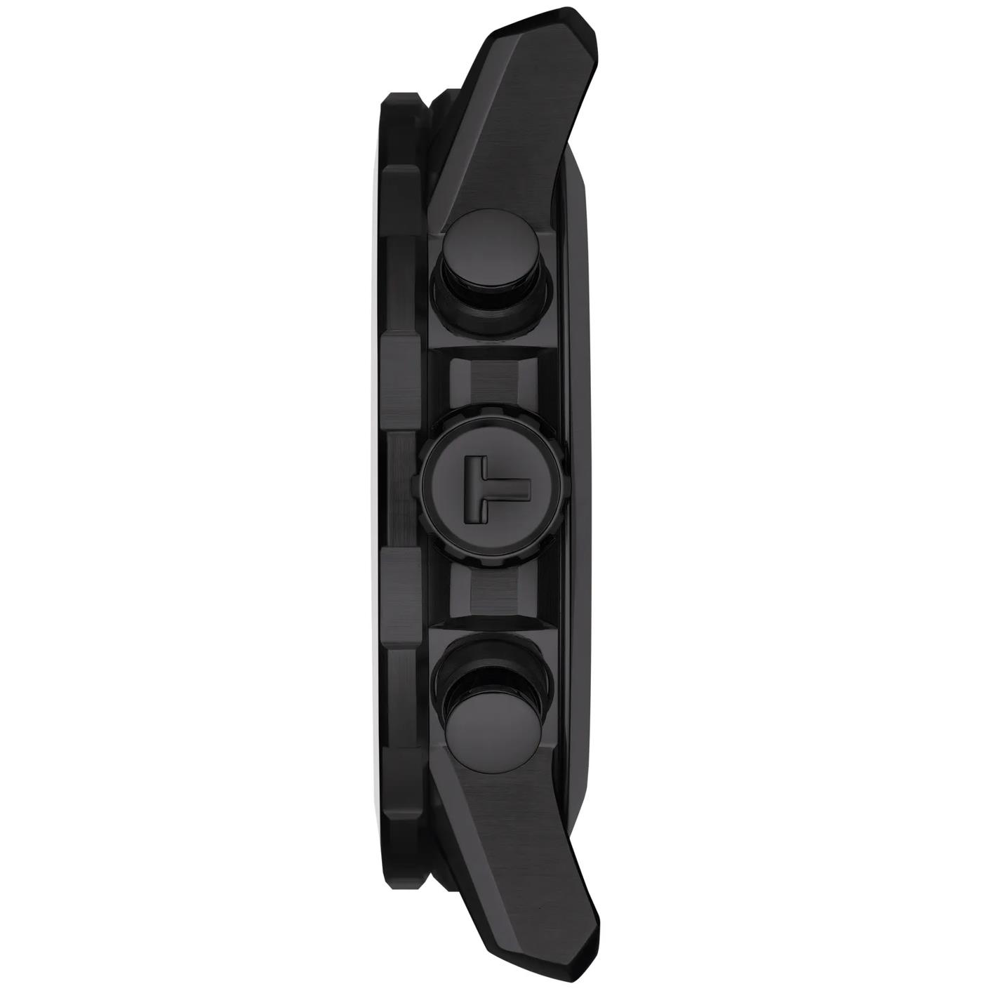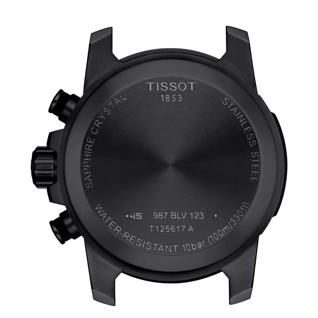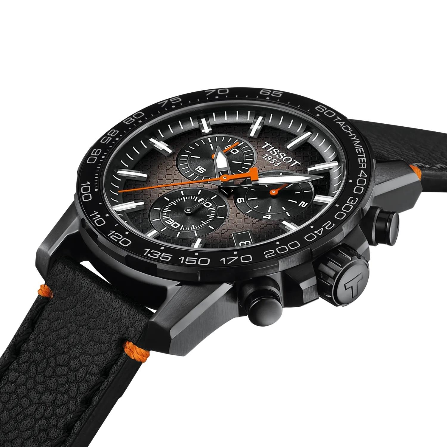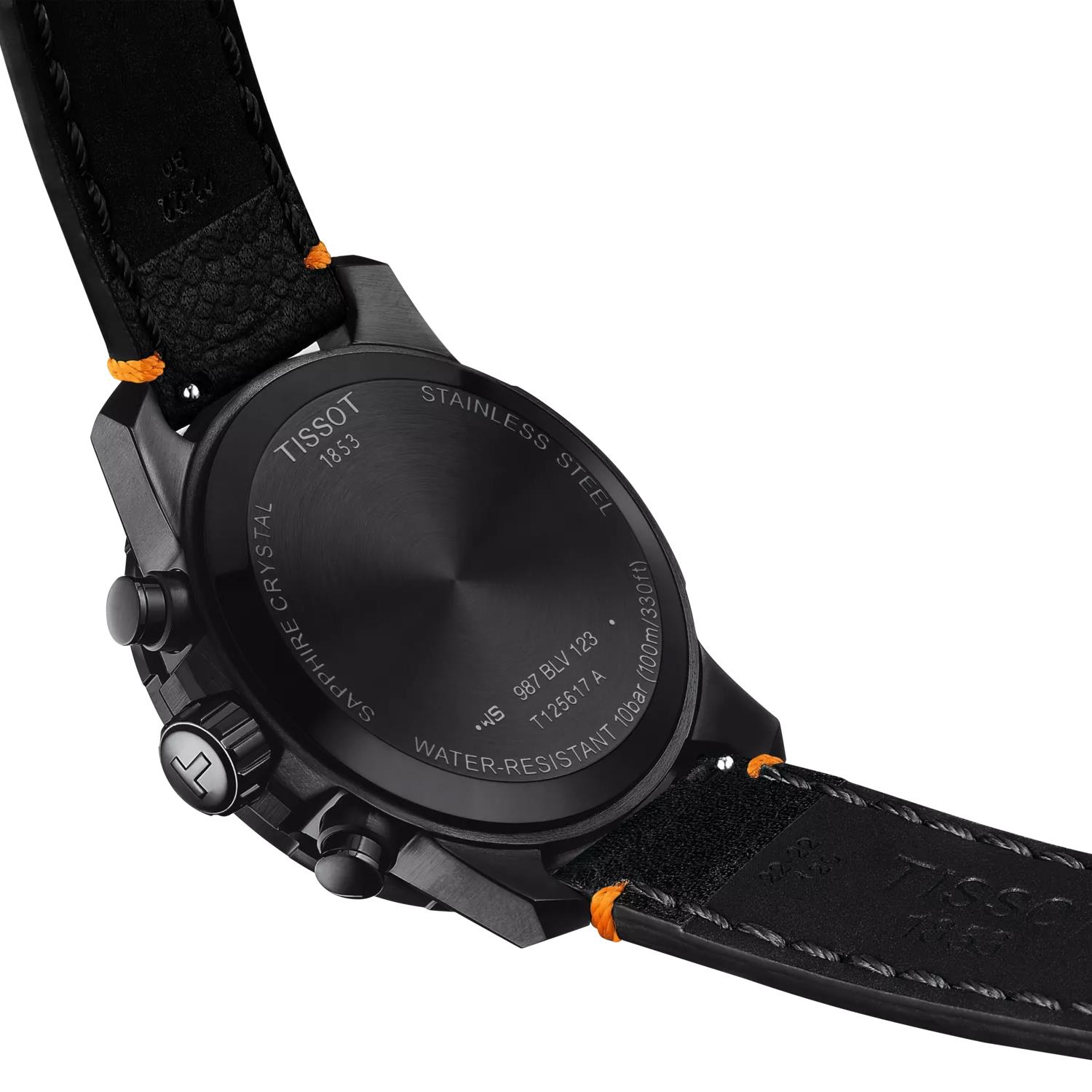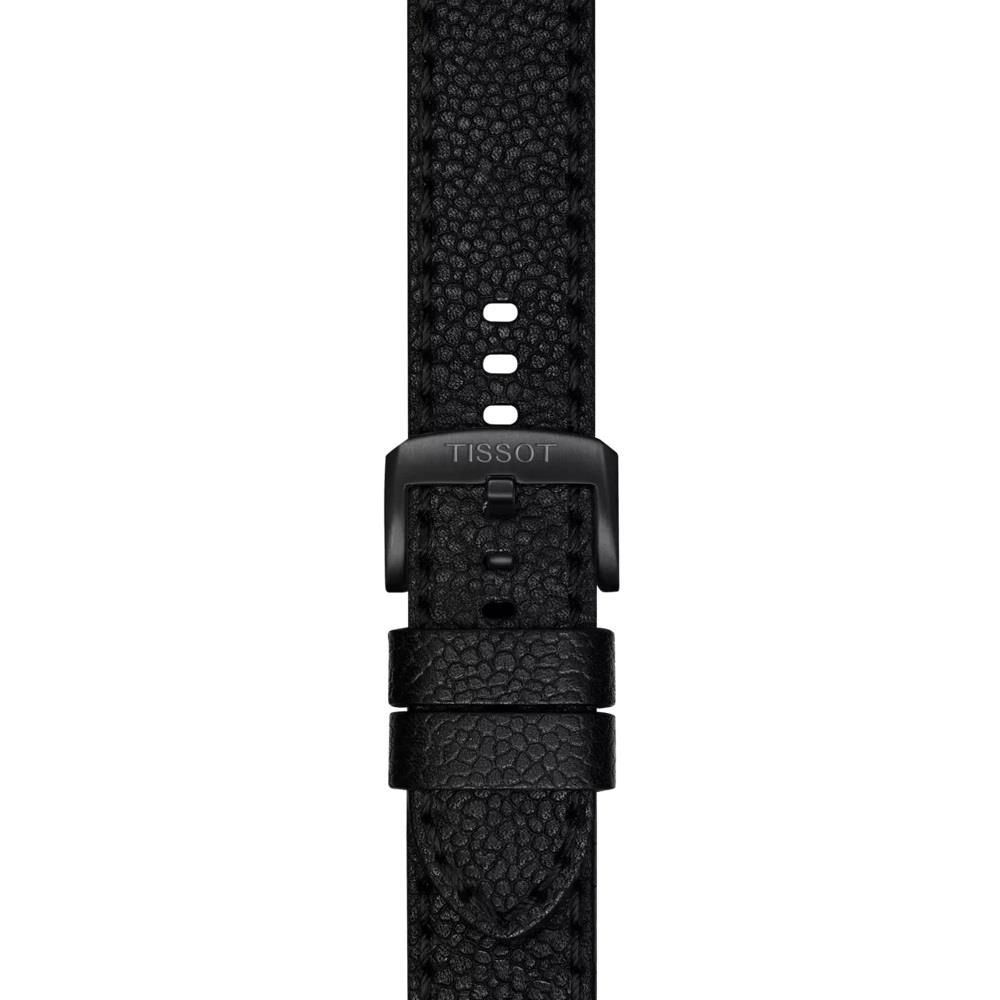 ساعت مچی مردانه TISSOT با طراحی روزانه بند چرمی مشکی با قاب فلزی مشکی و صفحه  گرد مشکی با نمایشگر عقربه ای با شیشه ضد خراش و موتور سوییسی با انرژی باتری و قابلیت داشتن تقویم شب نما کرنوگراف زه تاچی متر و مقاوم در برابر آب تا عمق 100 متر به همراه گارانتی بین المللی