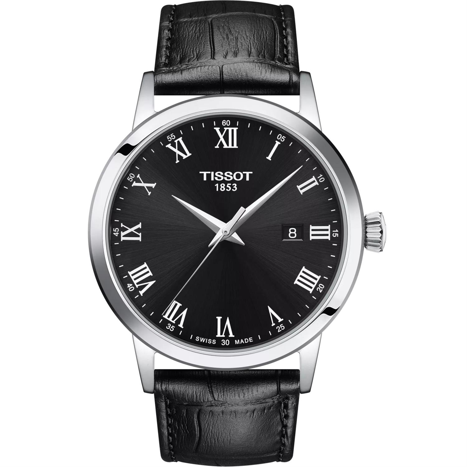 ساعت مچی مردانه TISSOT با طراحی روزانه بند چرمی با قاب استیل و صفحه گرد مشکی با نمایشگر عقربه ای با شیشه ضد خراش و موتور سوییسی با انرژی باتری و قابلیت داشتن تقویم مقاوم در برابر آب تا عمق 50 متر به همراه گارانتی بین المللی
