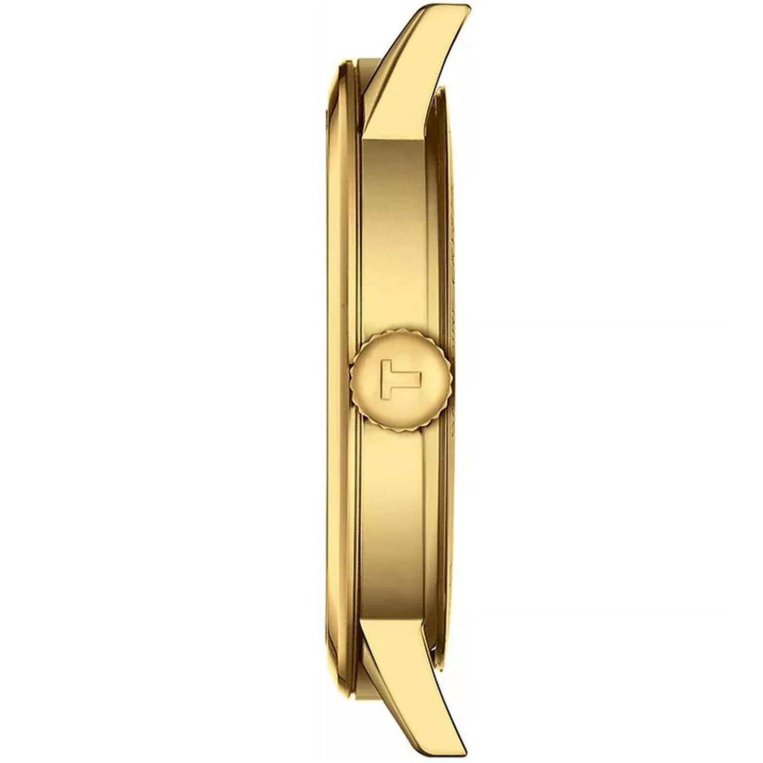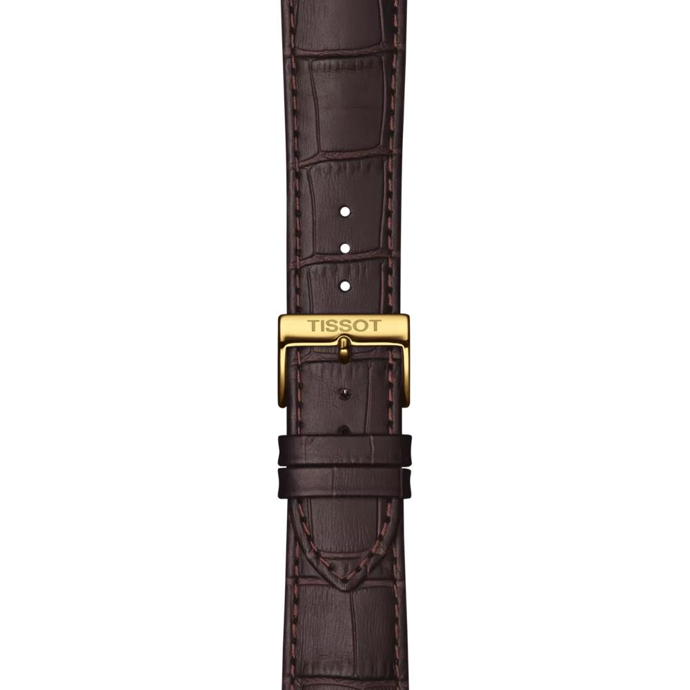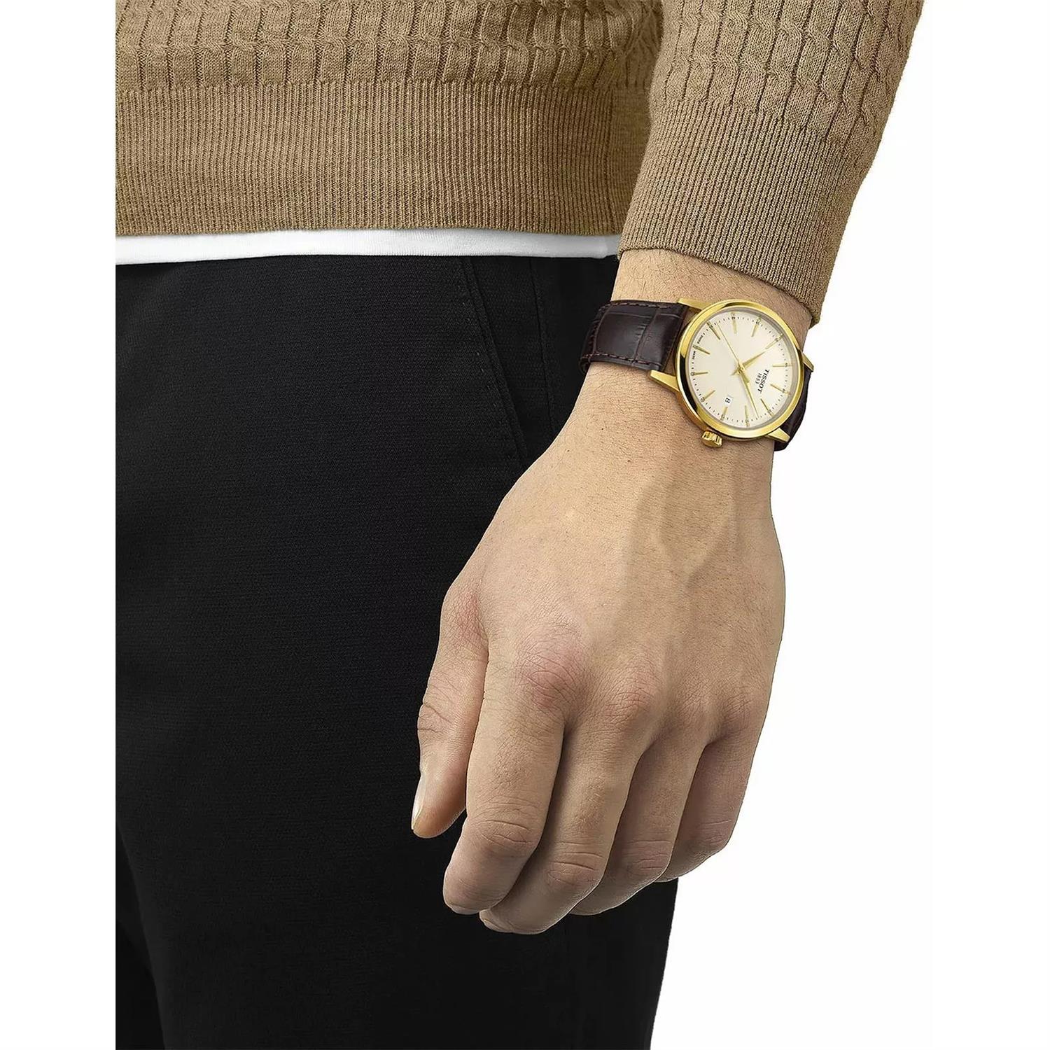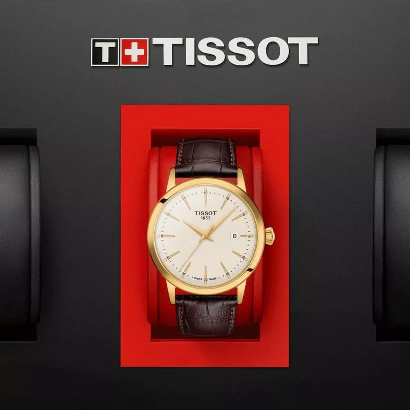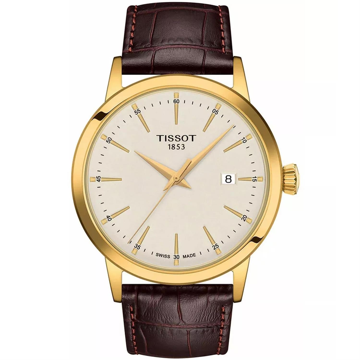 ساعت مچی مردانه TISSOT با طراحی روزانه بند چرمی قهوه ای با قاب فلزی طلایی و صفحه گرد کرم با نمایشگر عقربه ای با شیشه ضد خراش و موتور سوییسی با  انرژی باتری و قابلیت داشتن تقویم مقاوم در برابر آب تا عمق 50 متر به همراه گارانتی بین المللی