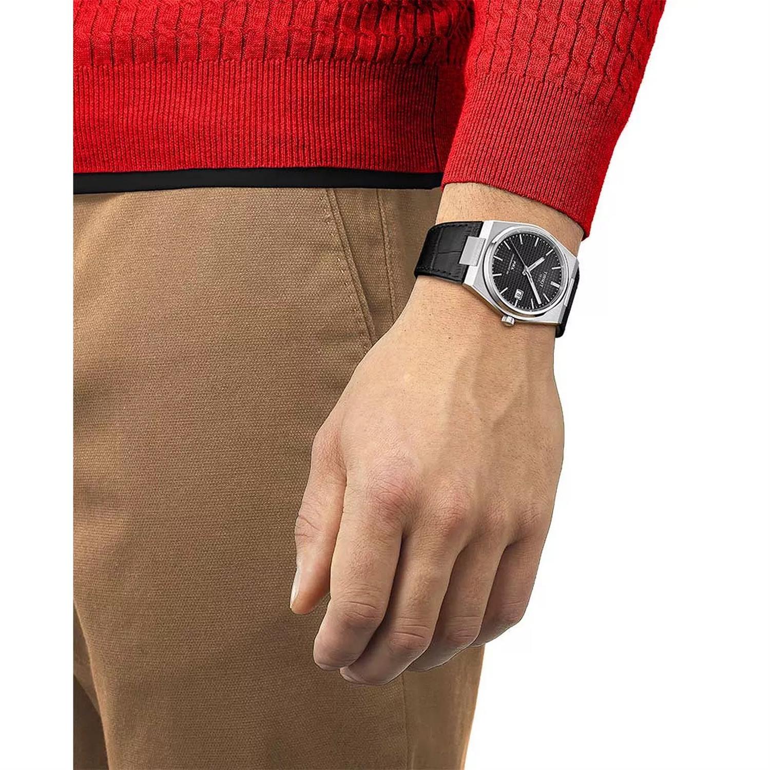 ساعت مچی مردانه TISSOT با طراحی روزانه بند چرمی و قاب گرد استیل با صفحه گرد مشکی و قابلیت داشتن تقویم / شب نما و شیشه ضد خراش و ضد انعکاس نور با موتوراتوماتیک سوییسی و انرژی مکانیکی و مقاوم در برابر آب تا عمق 100 متر به همراه گارانتی بین المللی
