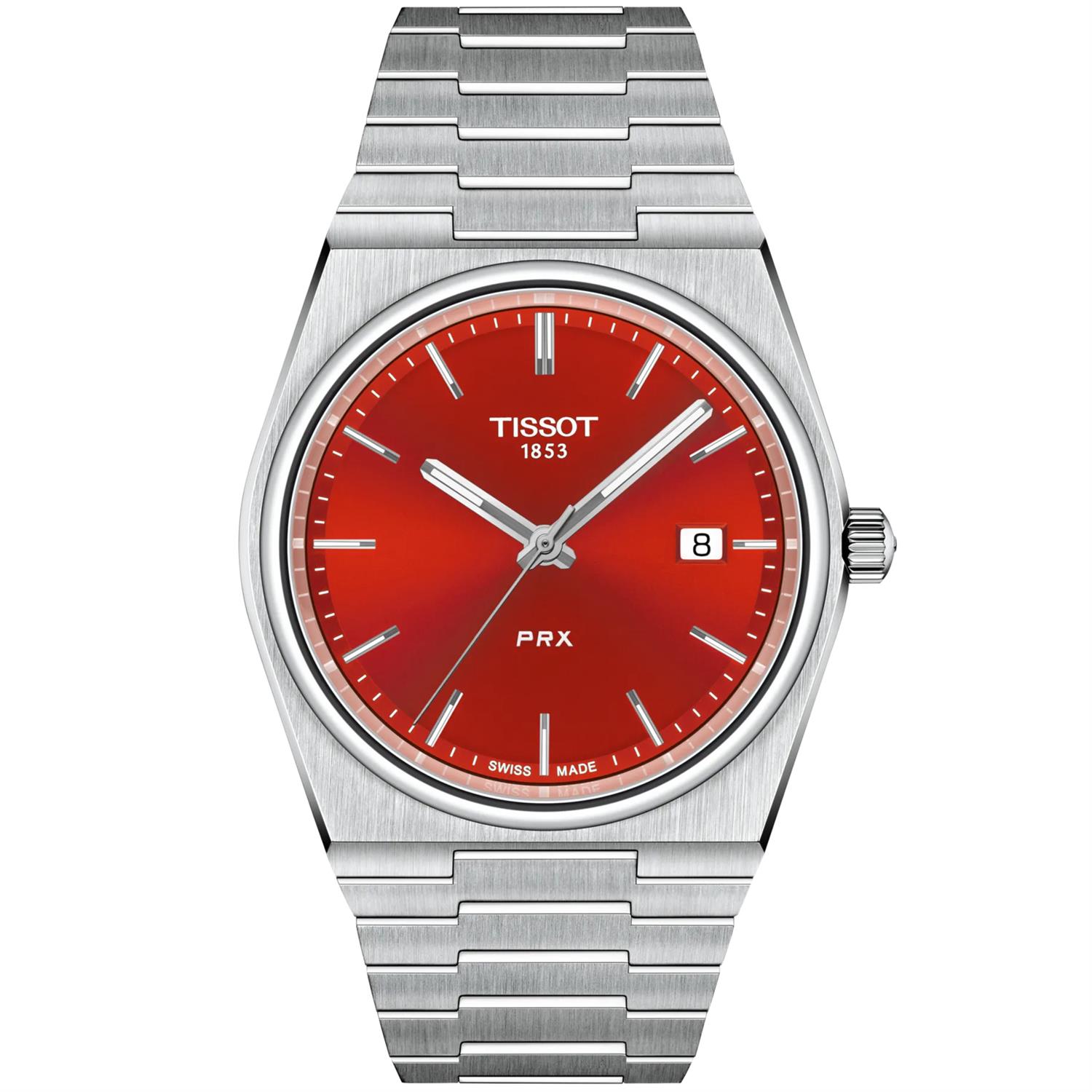 ساعت مچی مردانه TISSOT با طراحی روزانه بند استیل و قاب گرد استیل با صفحه گرد قرمز و قابلیت داشتن تقویم / شب نما و شیشه ضد خراش با موتور سوییسی و انرژی باتری و مقاوم در برابر آب تا عمق 100 متر به همراه گارانتی بین المللی
