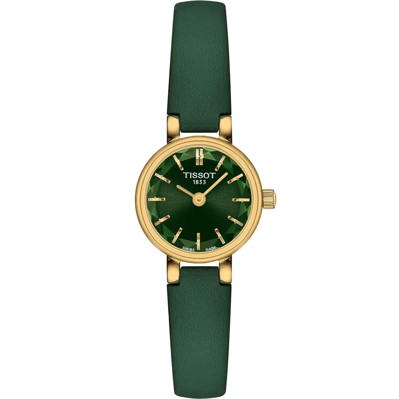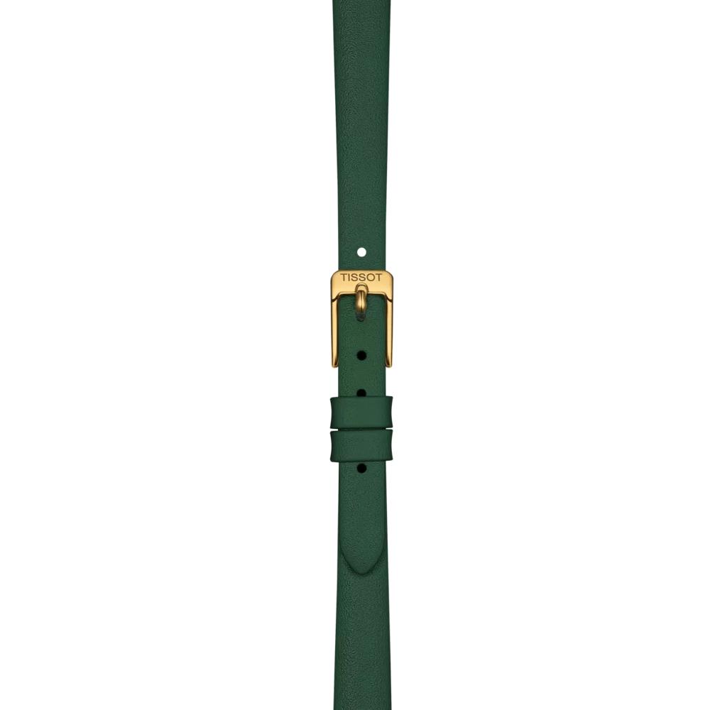 ساعت مچی زنانه TISSOT با طراحی کلاسیک بند چرمی سبز با قاب فلزی طلایی و صفحه گرد سبز با شیشه ضد خراش و موتورسوییسی با انرژی باتری و مقاوم در برابر آب تا عمق 30 متر به همراه گارانتی بین المللی