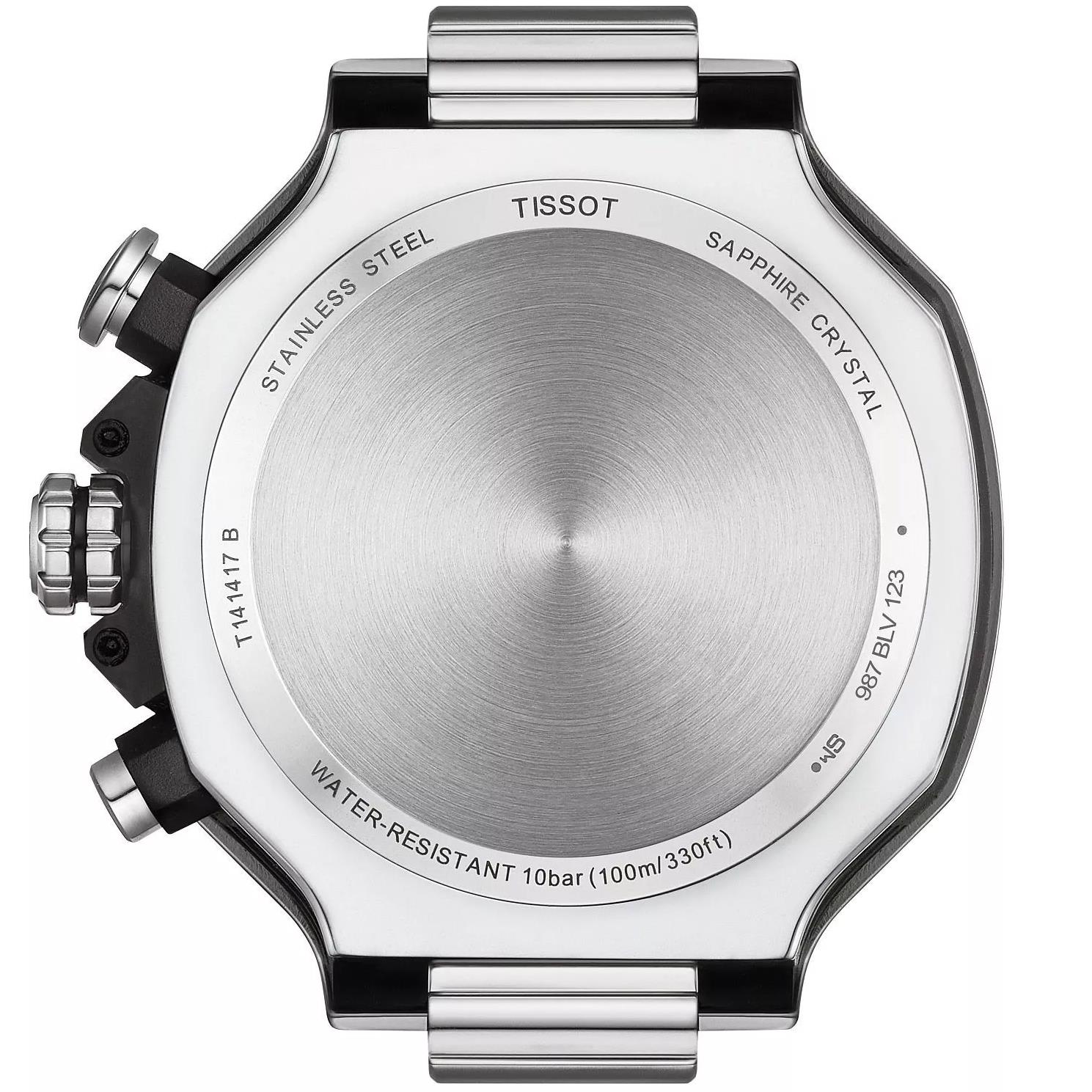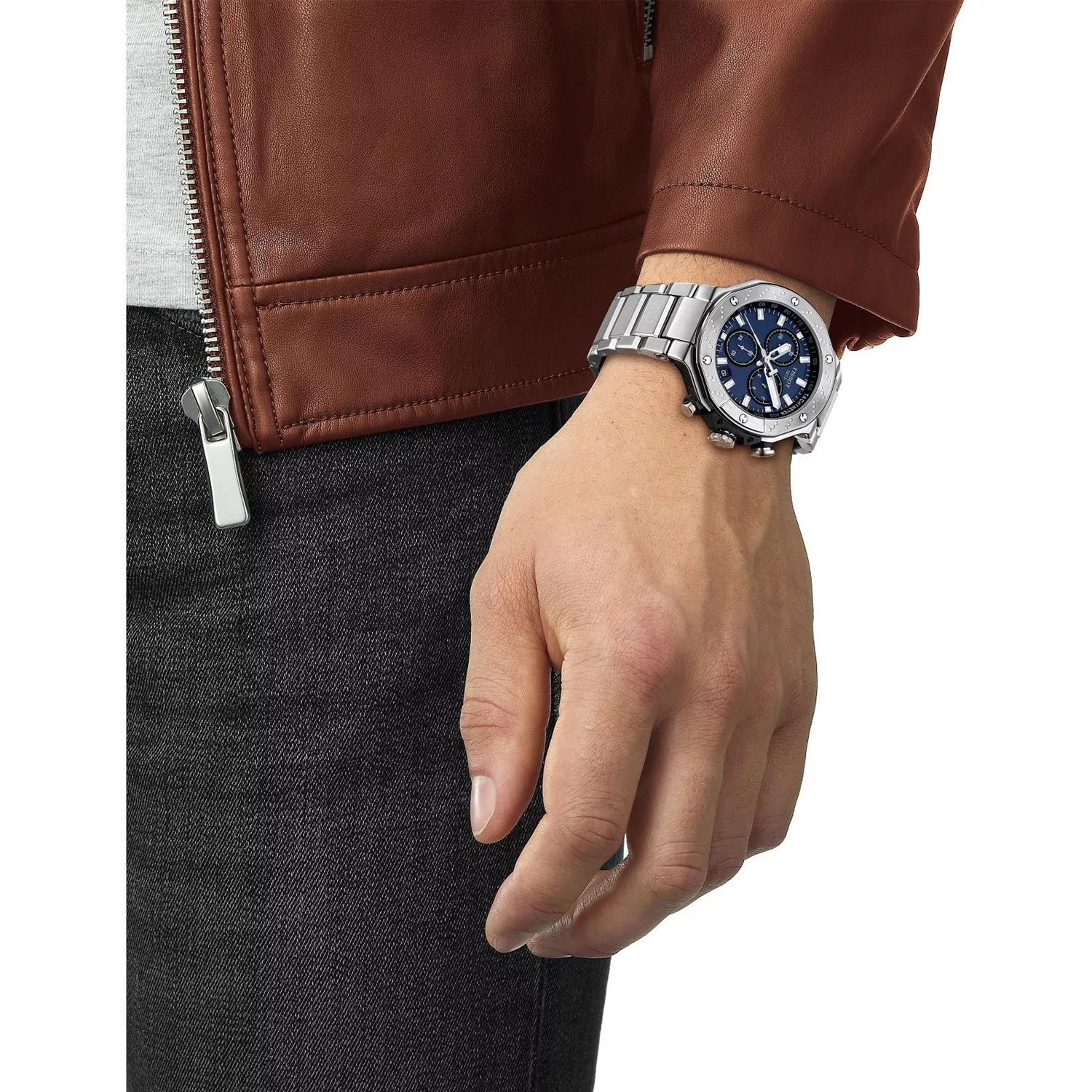 ساعت مچی مردانه TISSOT با طراحی اسپرت بند استیل با قاب متفاوت استیل و صفحه گرد سرمه ای با شیشه ضد خراش و ضد انعکاس نور و قابلیت داشتن تقویم / کرنوگراف/ زه تاچی متر/ شب نما و موتور سوییسی با انرژی  باتری و مقاوم در برابر آب تا عمق 100 متر به همراه گارانتی بین المللی