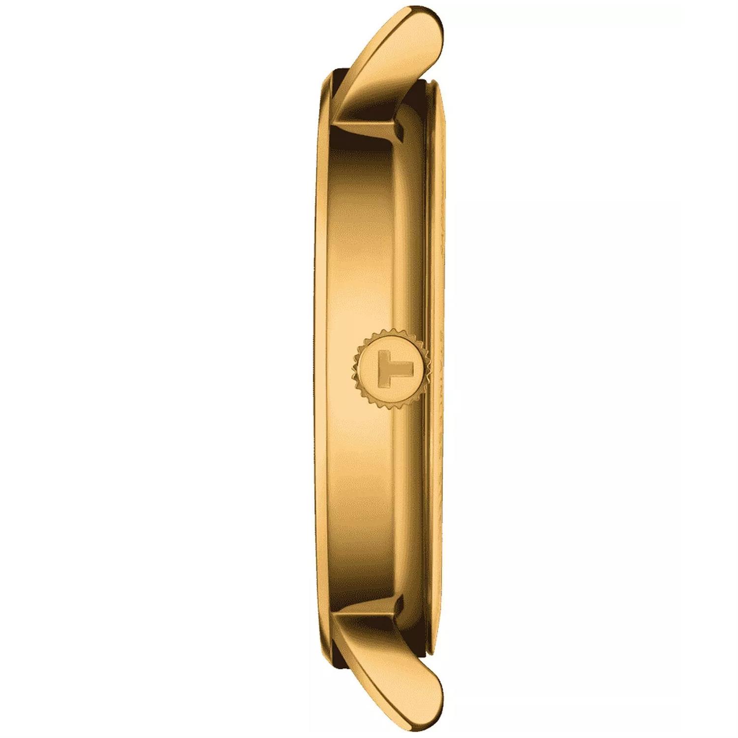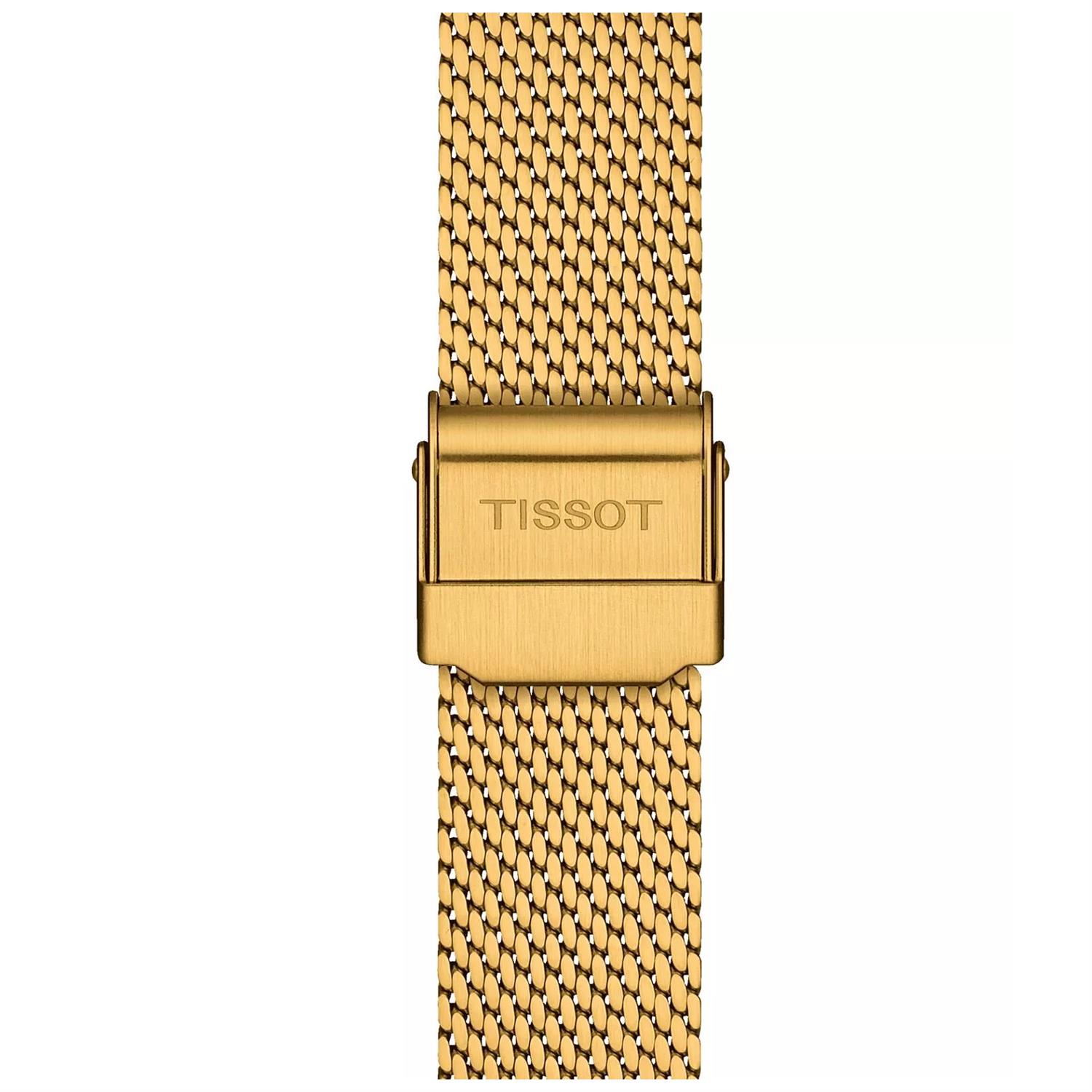 ساعت مچی زنانه TISSOT با طراحی اسپرت بند حصیر بافت طلایی با قاب گرد طلایی و صفحه طلایی با شیشه ضد خراش و موتور سوییسی با انرژی باتری و مقاوم در برابر آب تا عمق 50 متر به همراه گارانتی بین المللی