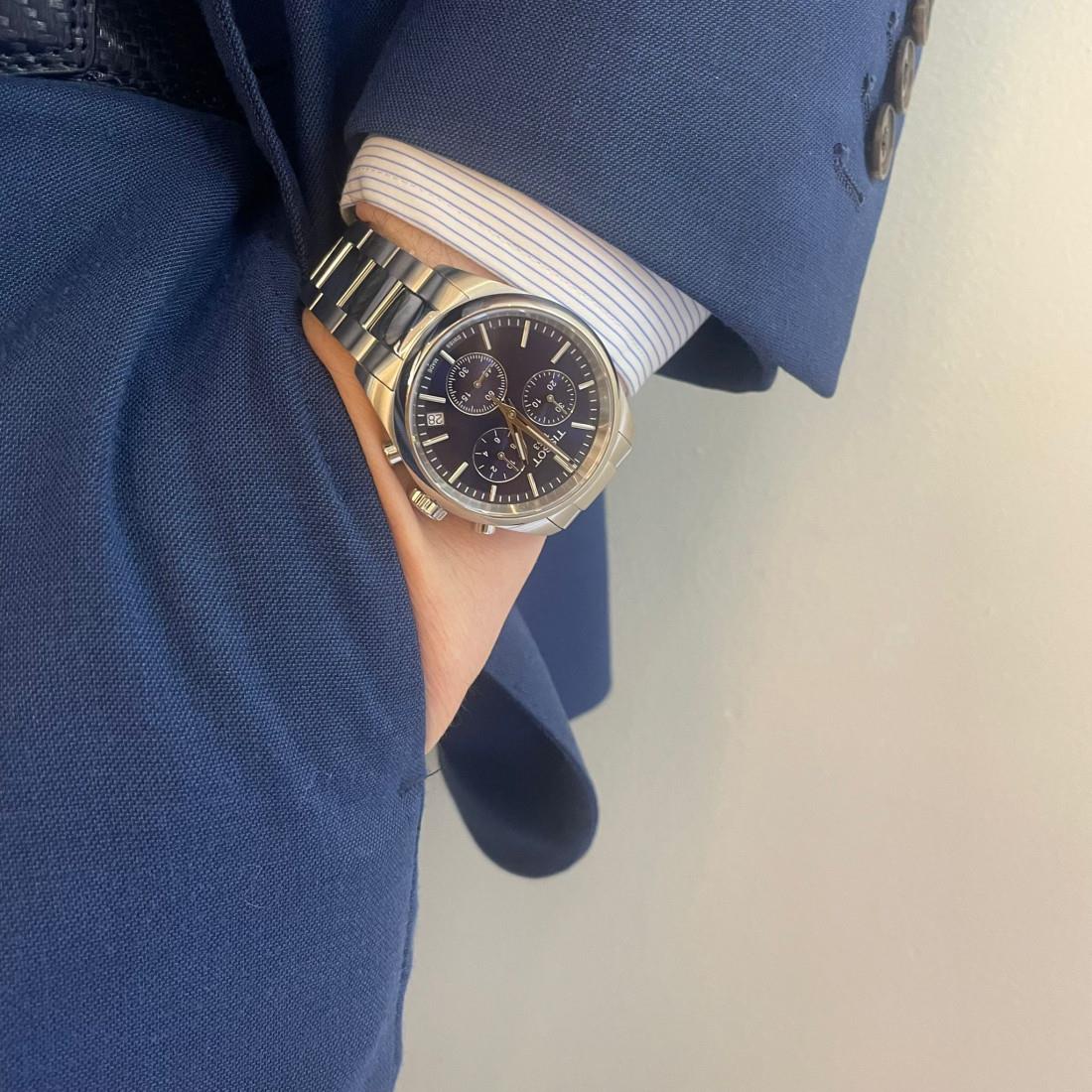 ساعت مچی مردانه TISSOT با طراحی روزانه بند استیل و قاب گرد استیل با صفحه گرد سرمه ای و شیشه ضد خراش و ضد انعکاس نور با موتور سوییسی با قابلیت تقویم / شب نما/ کرنوگراف و انرژی باطری و مقاوم در برابر آب تا عمق 100 متر به همراه گارانتی بین المللی