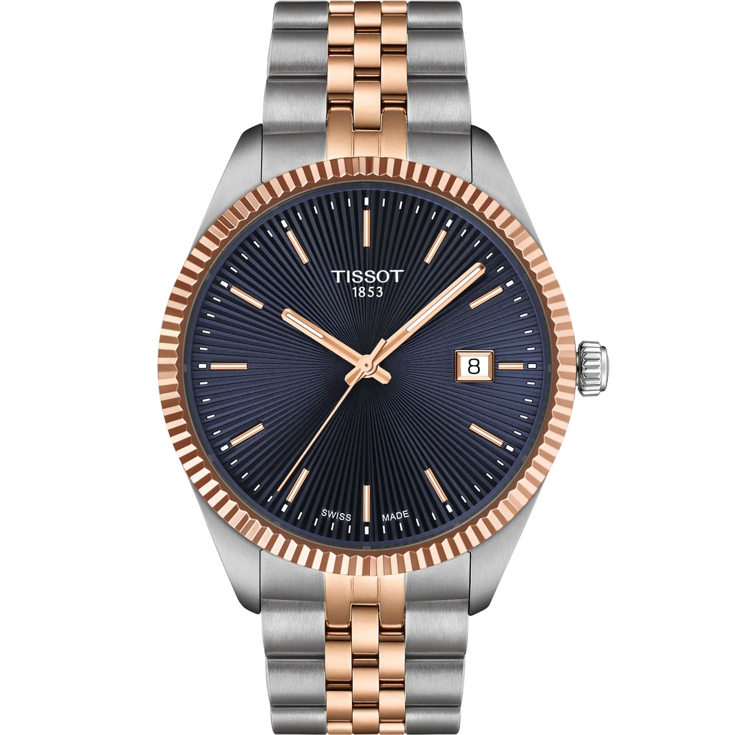 ساعت مچی مردانه TISSOT با طراحی روزانه بند استیل مسی و قاب گرد دورنگ با صفحه گرد سرمه ای و شیشه ضد خراش و ضد انعکاس نور با موتور سوییسی با قابلیت تقویم / شب نما و انرژی باطری و مقاوم در برابر آب تا عمق 100 متر به همراه گارانتی بین المللی