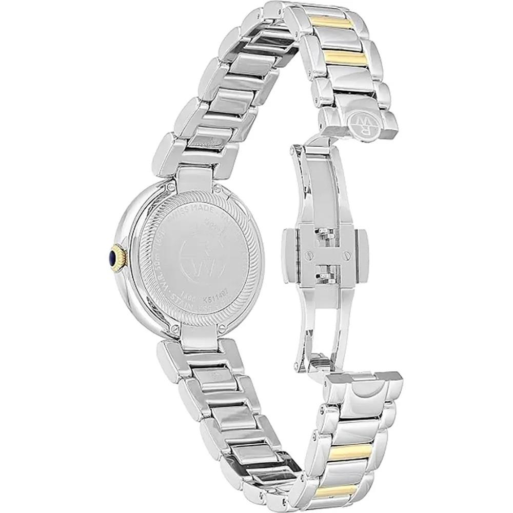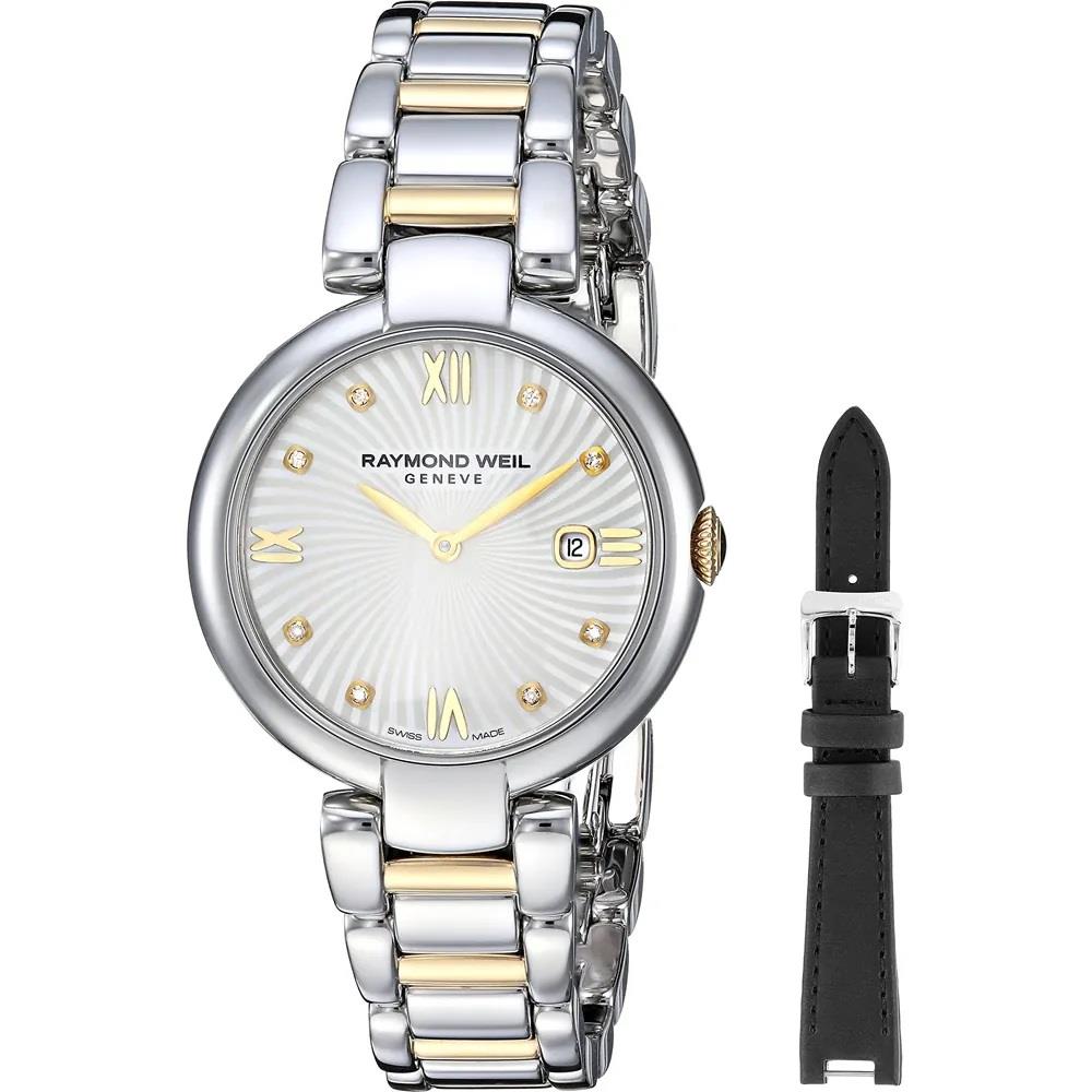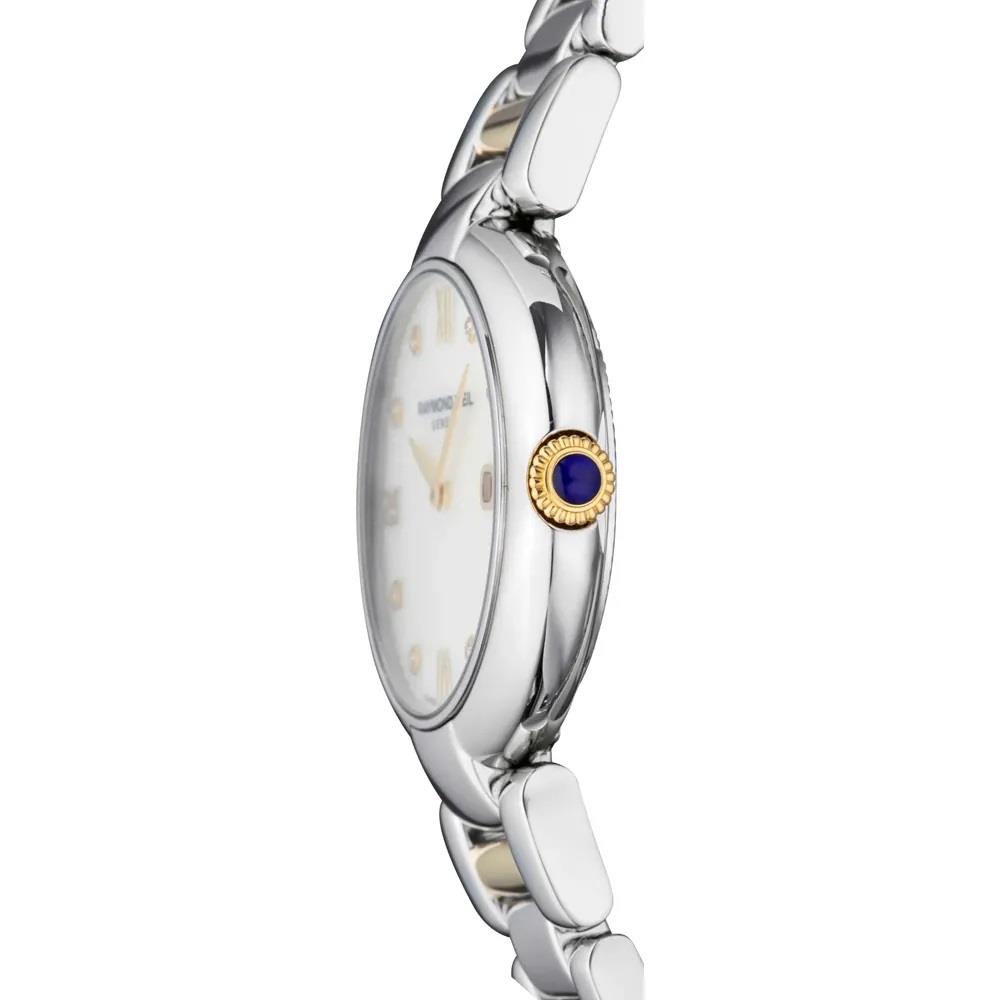 ساعت مچی زنانه ریموند ویل Raymon Weil با طراحی کلاسیک بند استیل طلایی/ قاب گرد استیل وصفحه مزین به نگین سفید صدفی با شیشه ضد خراش وقابلیت داشتن تقویم / بند یدکی چرمی و موتور سوییسی با انرژی باتری ومقاوم در برابرآب تا عمق 50 متر به همراه گارانتی بین المللی