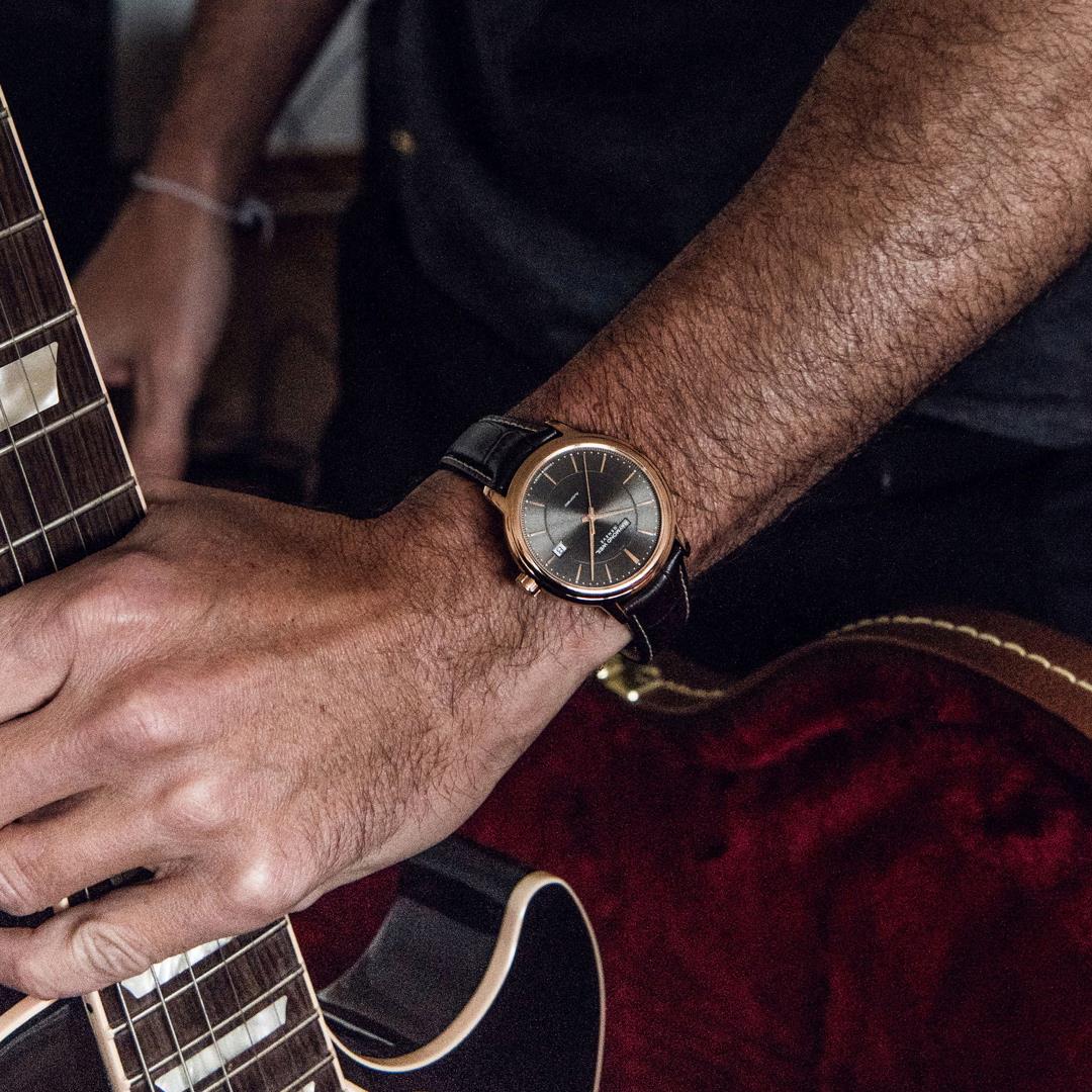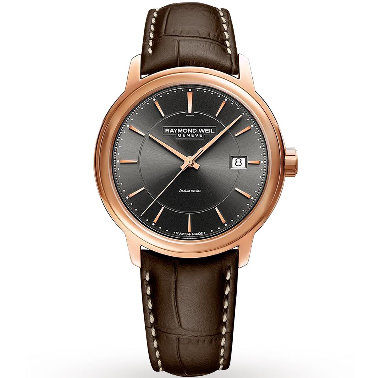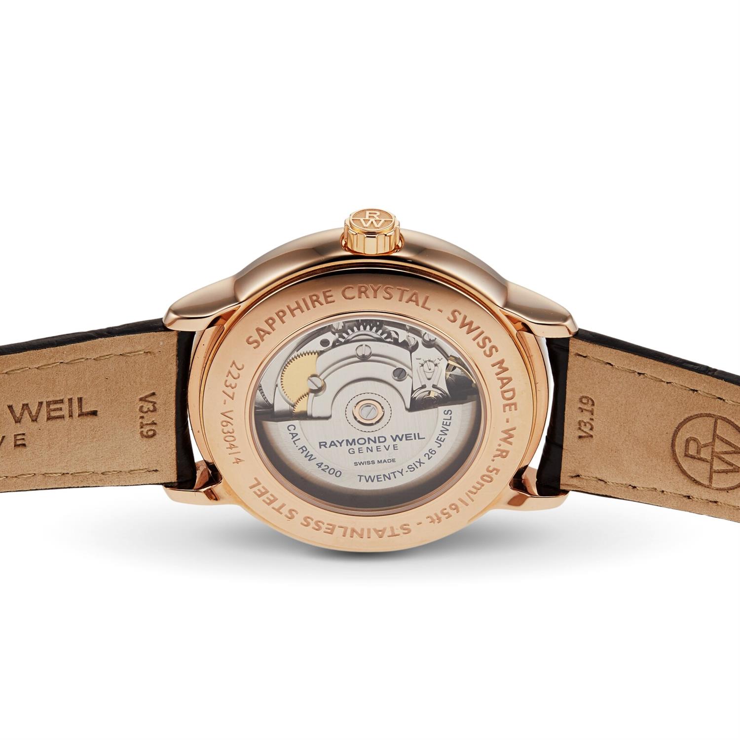 ساعت مچی مردانه ریموند ویل Raymon Weil با طراحی روزانه بند چرمی قهوه ای و قاب گرد مسی و صفحه  مشکی با شیشه ضد خراش و قابلیت داشتن تقویم و موتور اتوماتیک سوییسی با انرژی مکانیکی و مقاوم در برابر آب تا عمق 50 متر به همراه گارانتی بین الملی