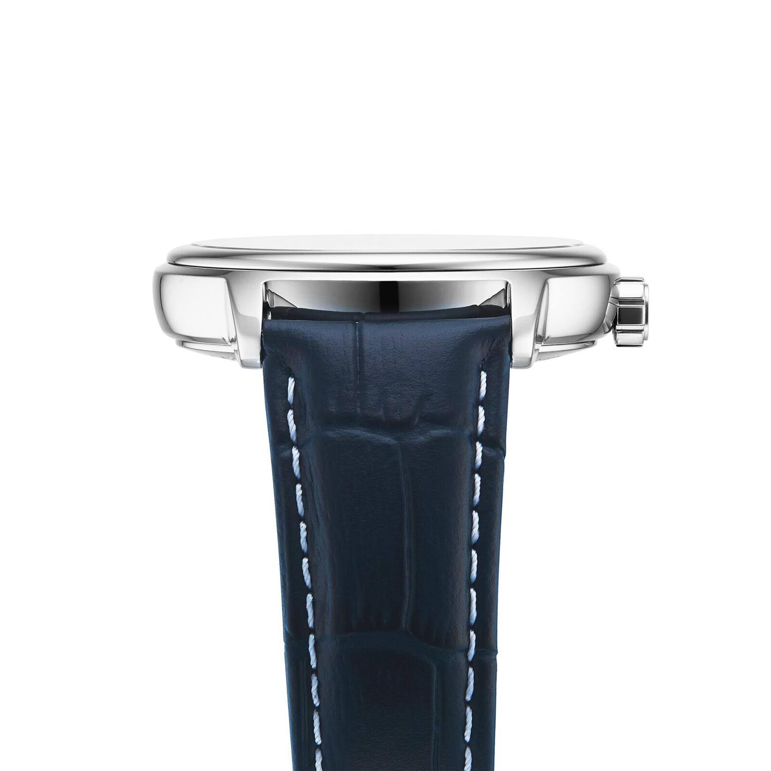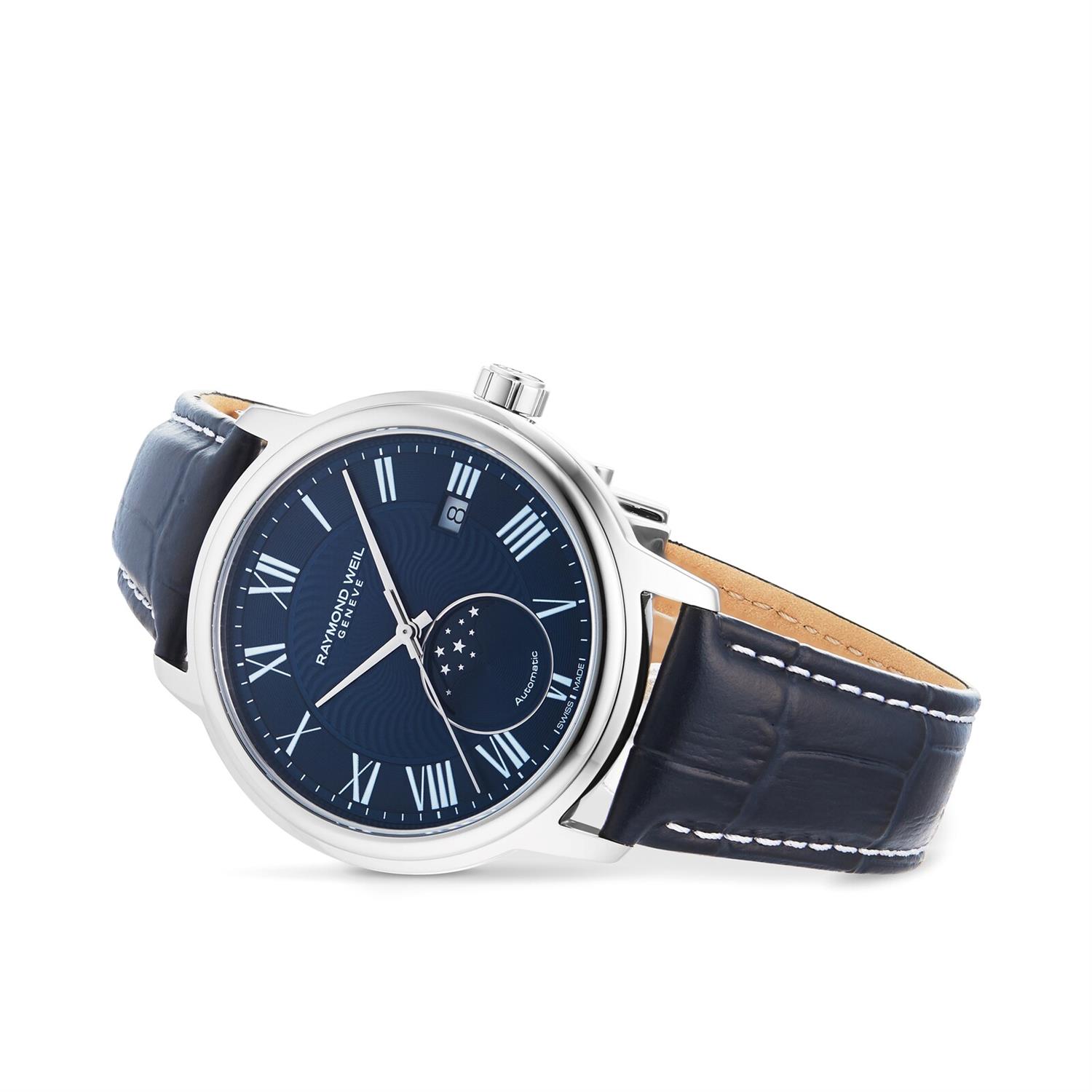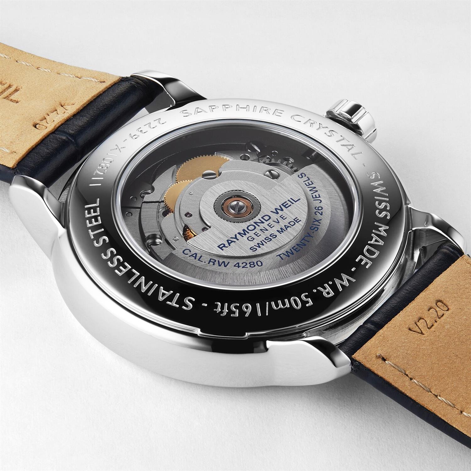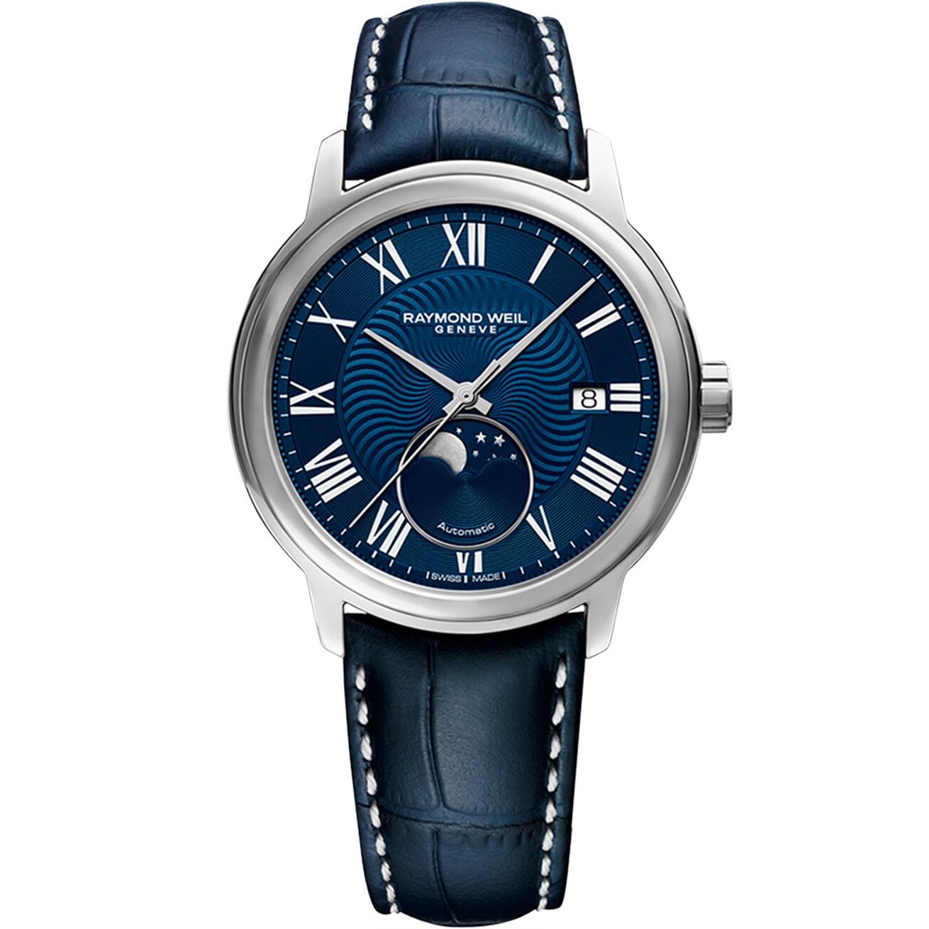 ساعت مچی مردانه ریموند ویل Raymon Weil با طراحی روزانه بند چرمی سرمه ای و قاب گرد استیل و صفحه  مشکی با شیشه ضد خراش و قابلیت داشتن تقویم / موقعیت کنونی ماه وستاره و موتور اتوماتیک سوییسی با انرژی مکانیکی و مقاوم در برابر آب تا عمق 50 متر به همراه گارانتی بین الملی