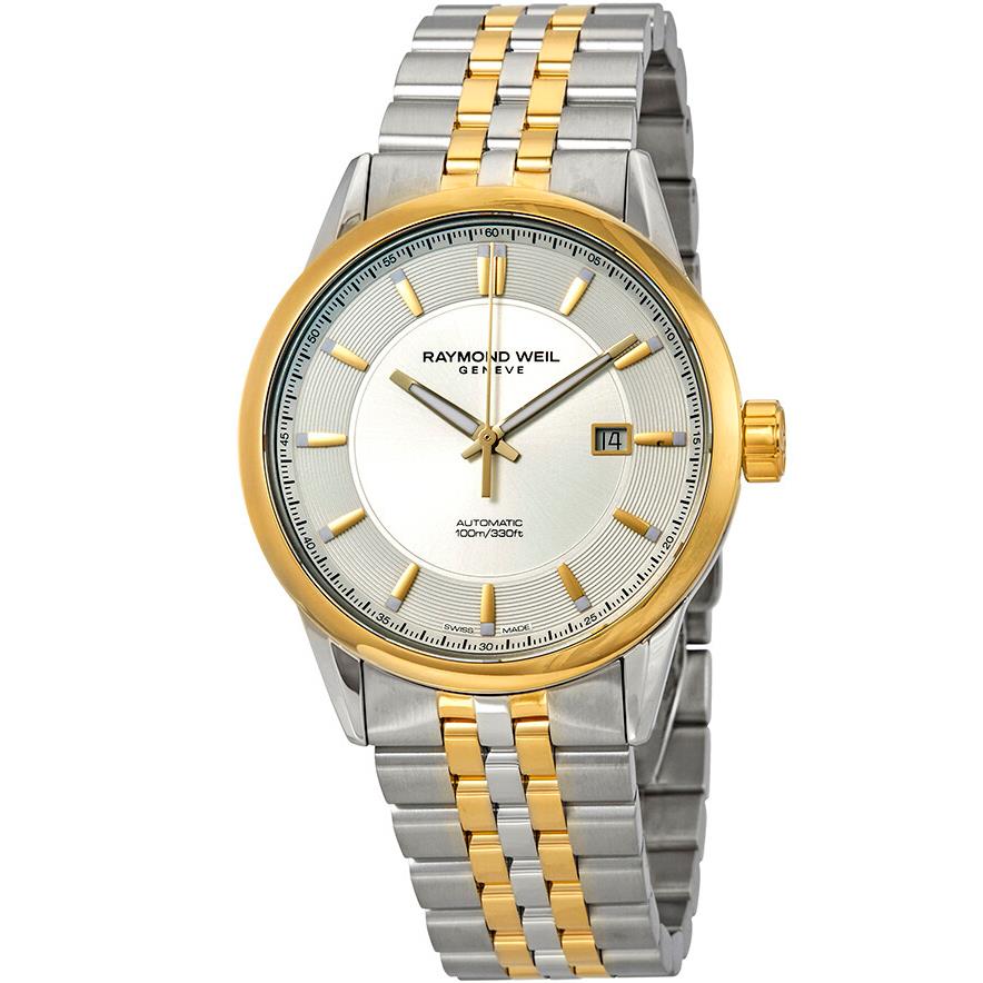 ساعت مچی مردانه ریموند ویل Raymon Weil با طراحی روزانه بند استیل طلایی و قاب گرد طلایی استیل و صفحه نقره ای با شیشه ضد خراش و قابلیت داشتن تقویم / شب نما و موتور اتوماتیک سوییسی با انرژی مکانیکی و مقاوم در برابر آب تا عمق 100 متر به همراه گارانتی بین الملی