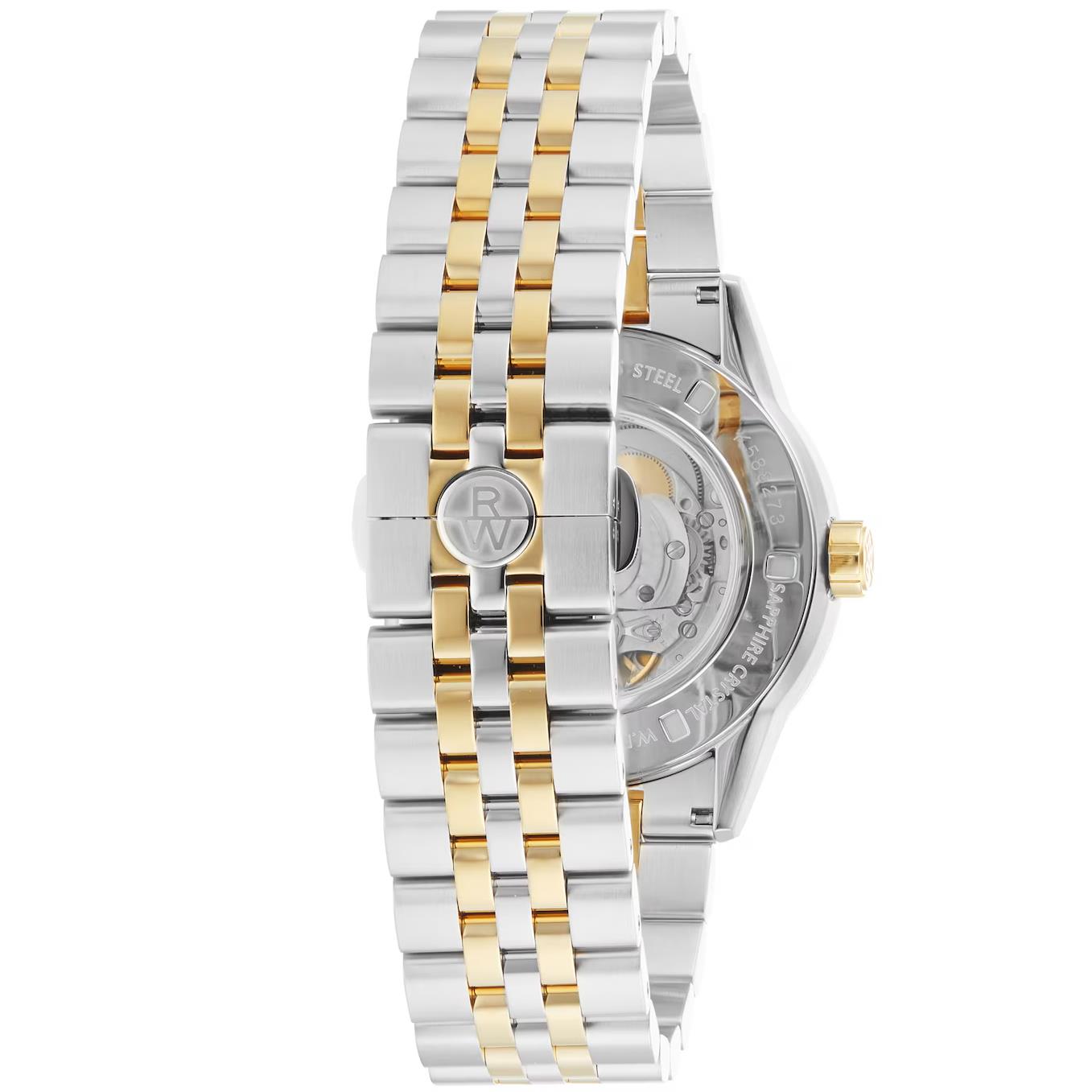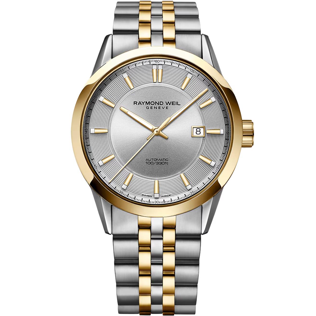 ساعت مچی مردانه ریموند ویل Raymon Weil با طراحی روزانه بند استیل طلایی و قاب گرد طلایی استیل و صفحه  نقره ای با شیشه ضد خراش و قابلیت داشتن تقویم / شب نما و موتور اتوماتیک سوییسی با انرژی مکانیکی و مقاوم در برابر آب تا عمق 100 متر به همراه گارانتی بین الملی