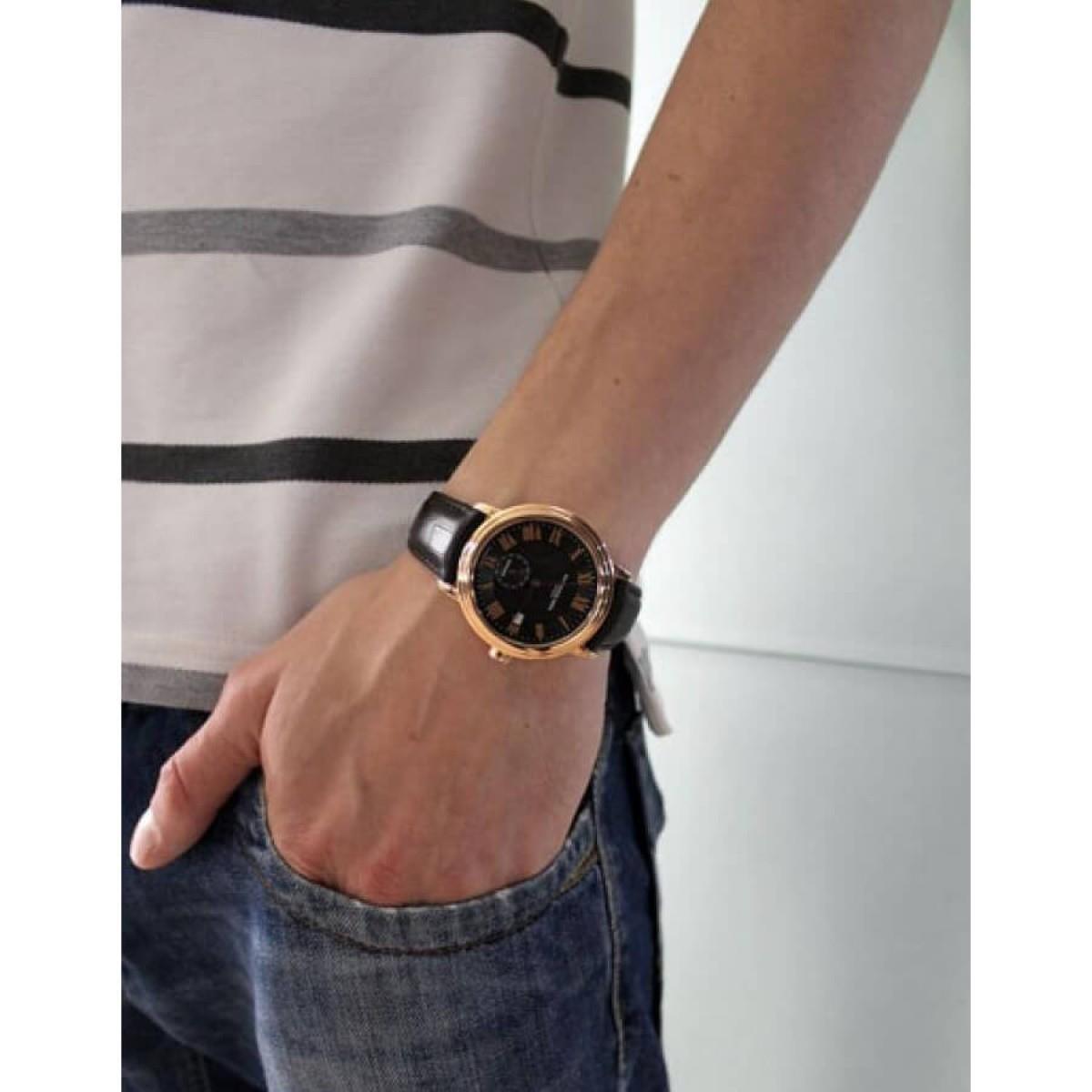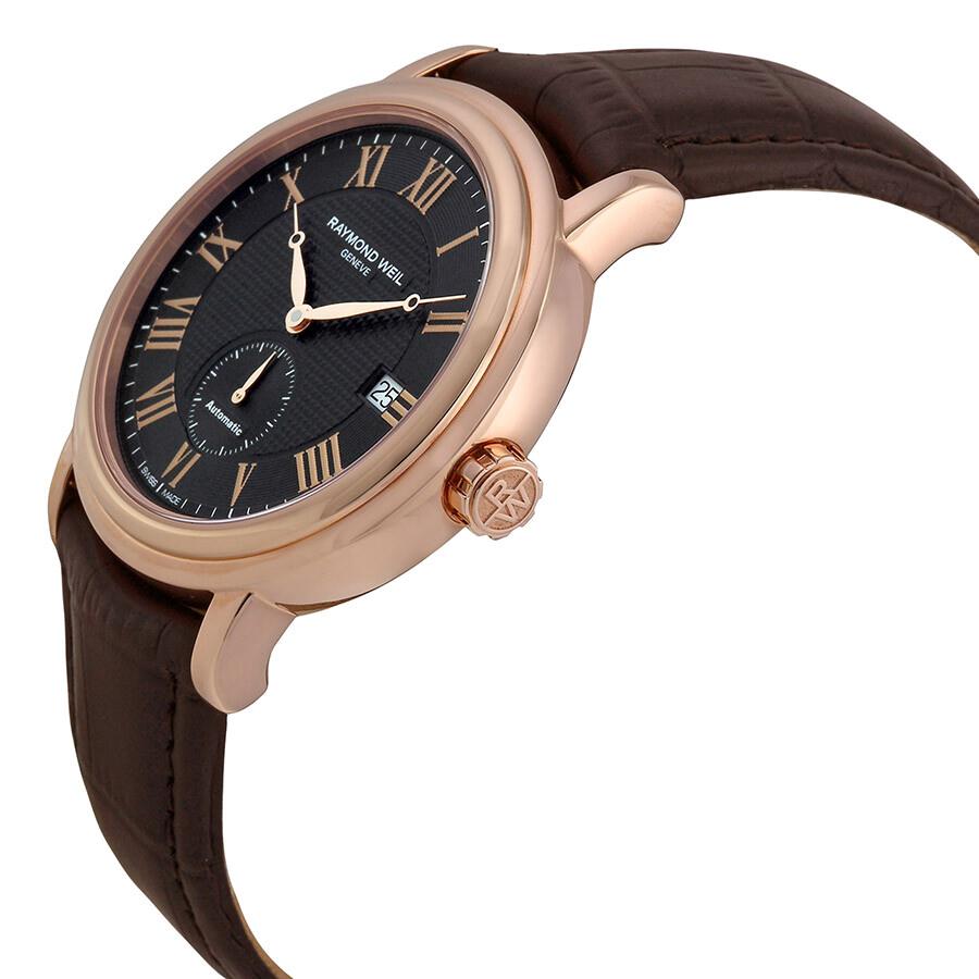 ساعت مچی مردانه ریموند ویل Raymon Weil با طراحی روزانه بند چرمی  قهوه ای و قاب فلزی مسی و صفحه گرد مشکی با شیشه ضد خراش و قابلیت داشتن تقویم / زیر ثانیه و موتوراتوماتیک سوییسی با انرژی مکانیکی و مقاوم در برابر آب تا عمق 50 متر به همراه گارانتی بین الملی