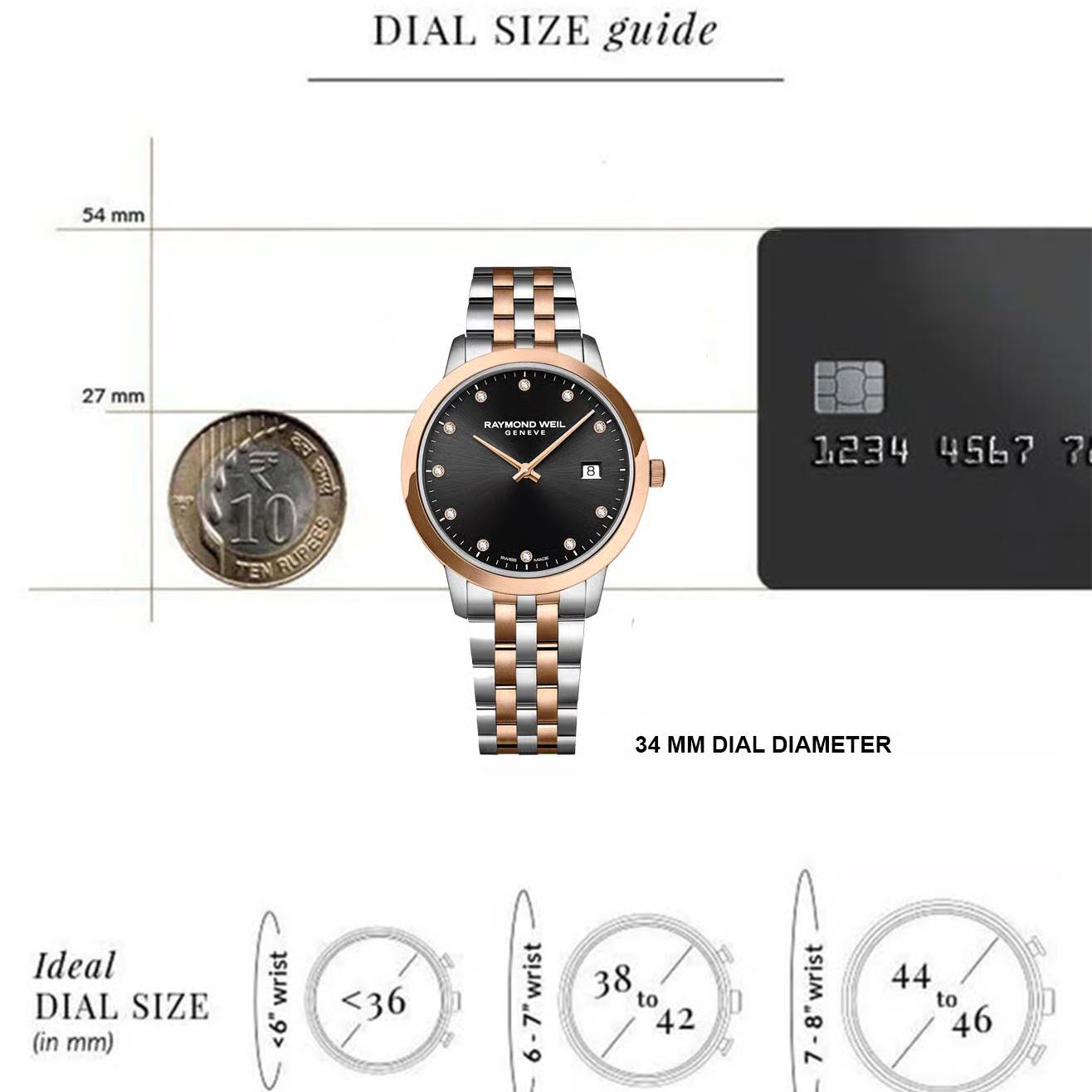 ساعت مچی زنانه ریموند ویل Raymon Weil با طراحی کلاسیک بند استیل مسی / قاب گرد مسی استیل و صفحه مزین به نگین مشکی با شیشه ضد خراش و قابلیت داشتن تقویم و موتور سوییسی با انرژی باتری و مقاوم در برابرآب تا عمق 50 متر به همراه گارانتی بین المللی