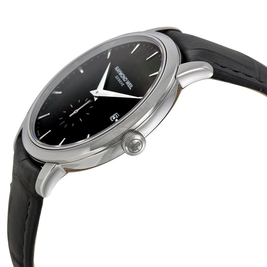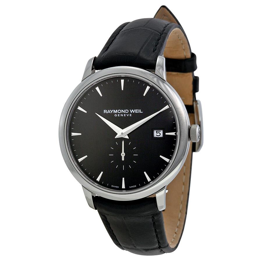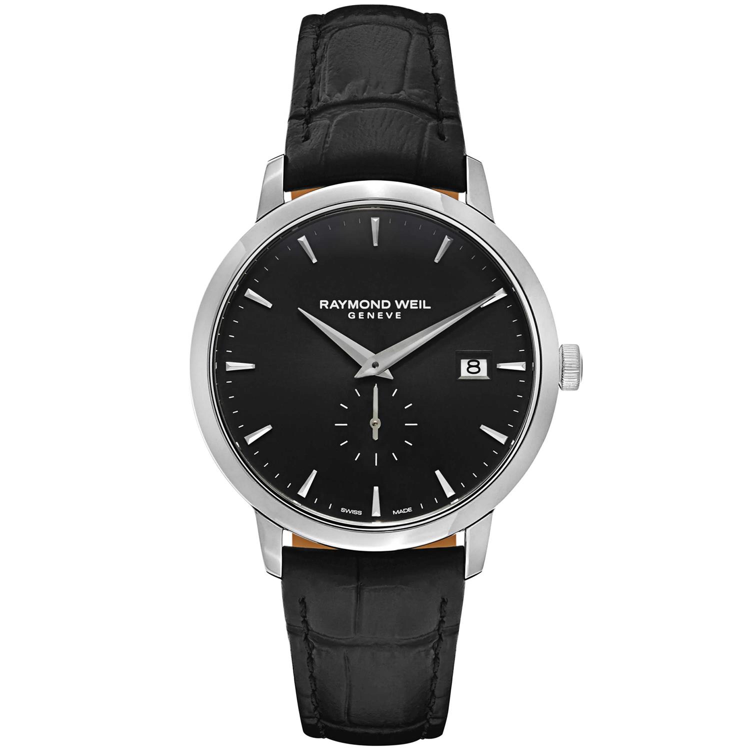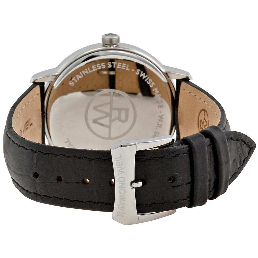 ساعت مچی مردانه ریموند ویل Raymon Weil با طراحی روزانه بند چرمی و قاب گرد استیل و صفحه گرد مشکی با شیشه ضد خراش و قابلیت داشتن تقویم / زیر ثانیه و موتور سوییسی با انرژی باتری و مقاوم در برابر آب تا عمق 50 متر به همراه گارانتی بین الملی