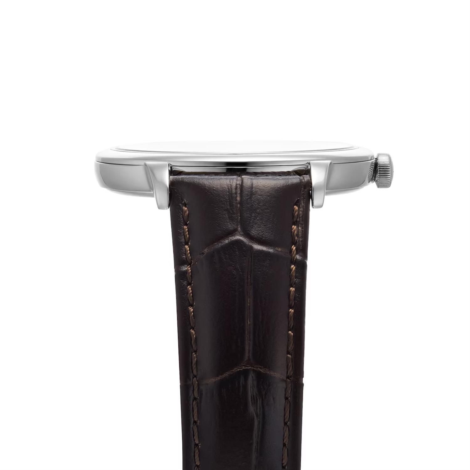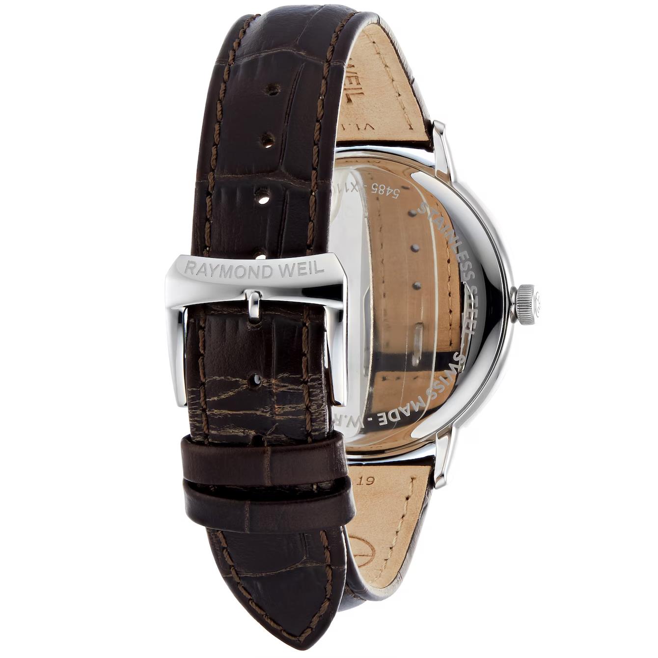 ساعت مچی مردانه ریموند ویل Raymon Weil با طراحی روزانه بند چرمی قهوه ای و قاب گرد استیل و صفحه گرد طوسی با شیشه ضد خراش و قابلیت داشتن تقویم و موتور سوییسی با انرژی باتری و مقاوم در برابر آب تا عمق 50 متر به همراه گارانتی بین الملی