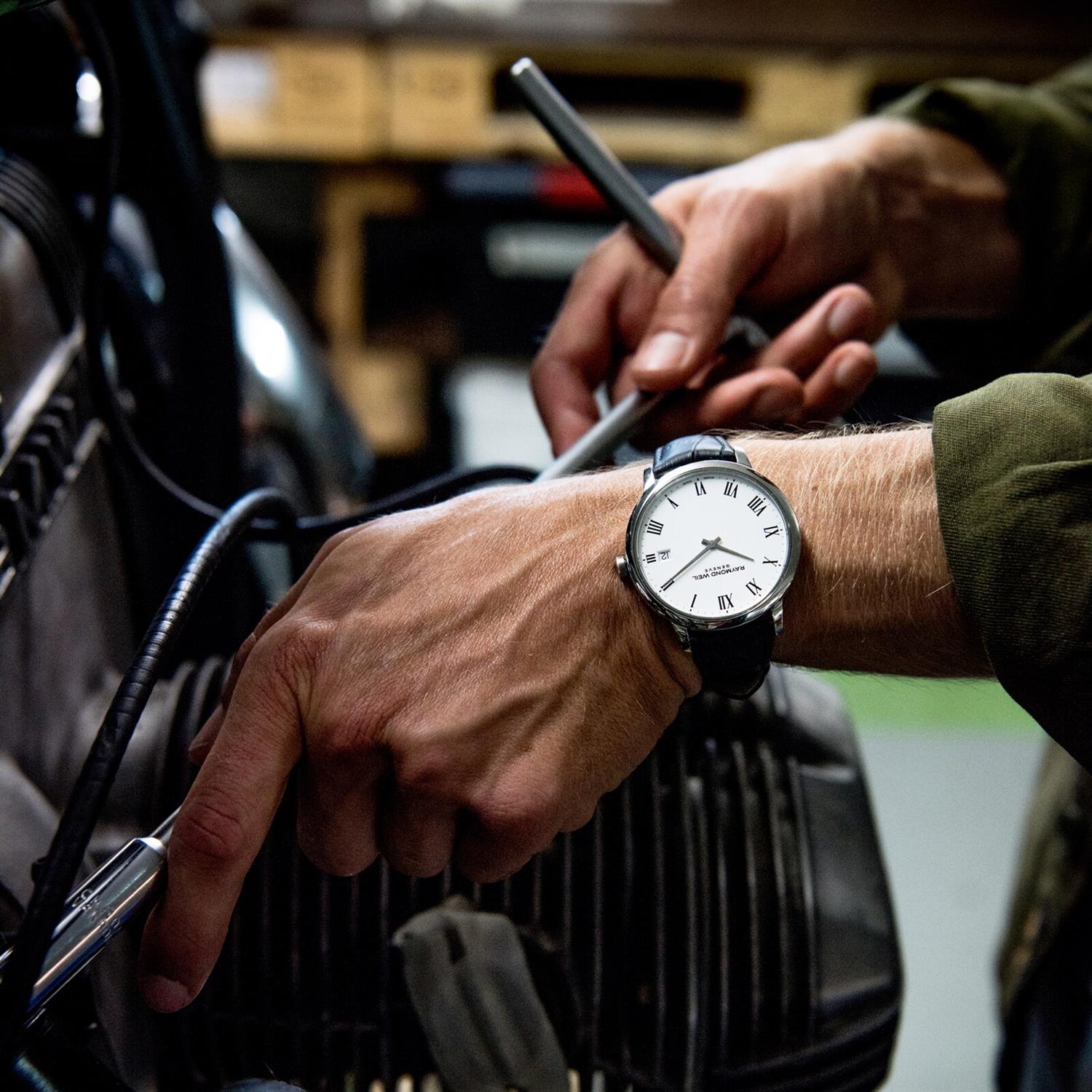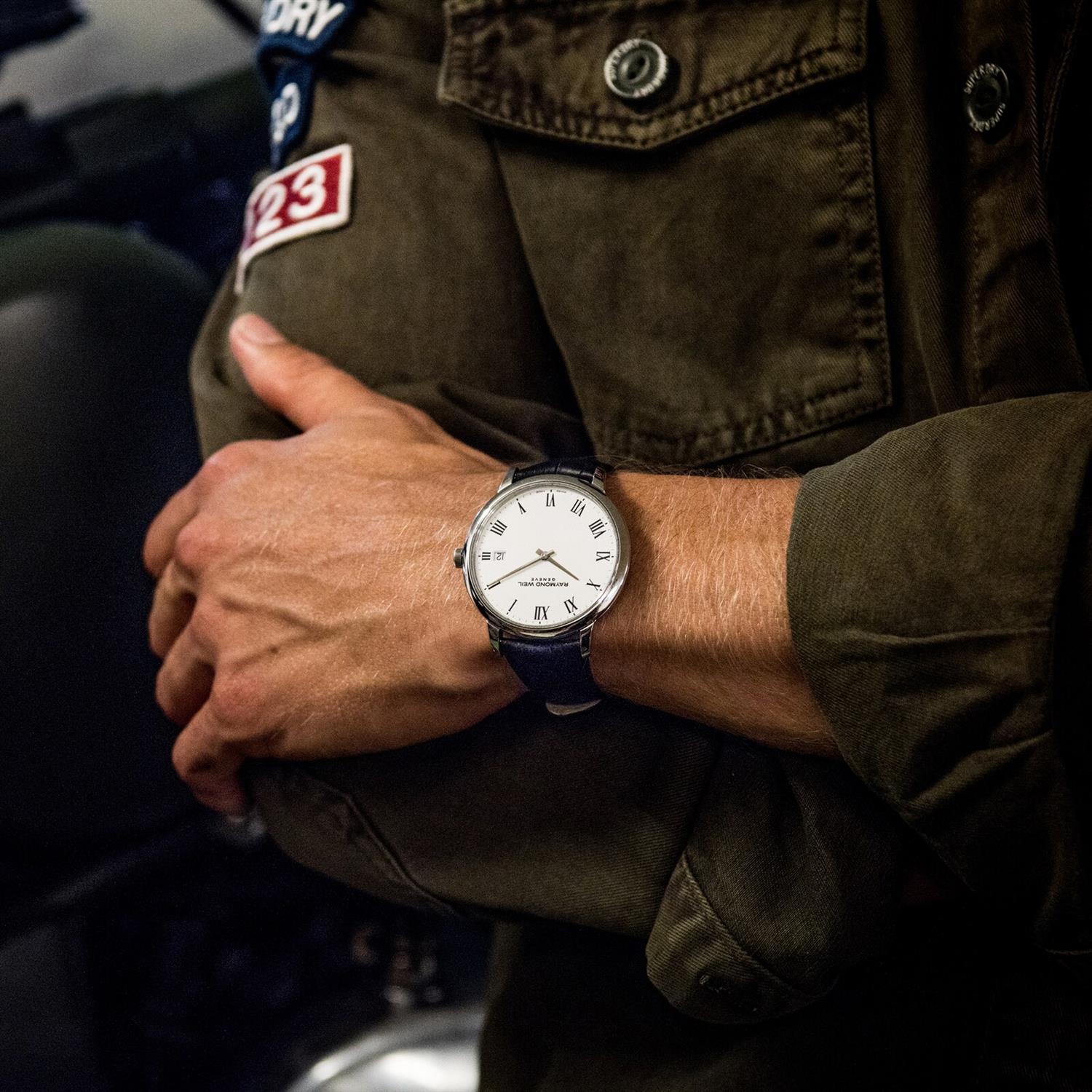 ساعت مچی مردانه ریموند ویل Raymon Weil با طراحی روزانه بند چرمی و قاب گرد استیل و صفحه گرد سفید با شیشه ضد خراش و قابلیت داشتن تقویم و موتور سوییسی با انرژی باتری و مقاوم در برابر آب تا عمق 50 متر به همراه گارانتی بین الملی