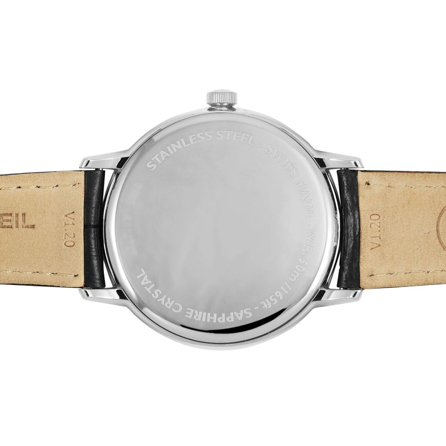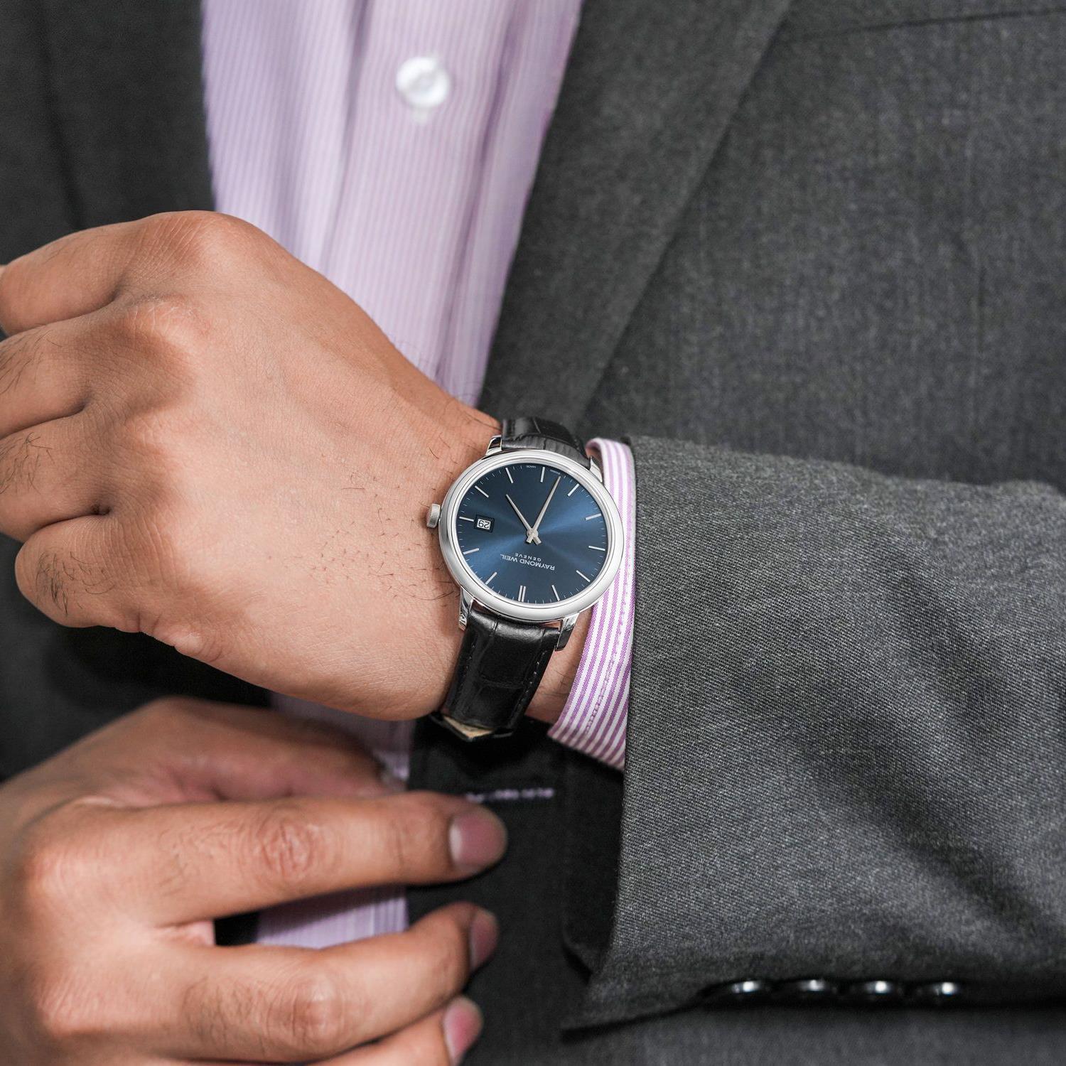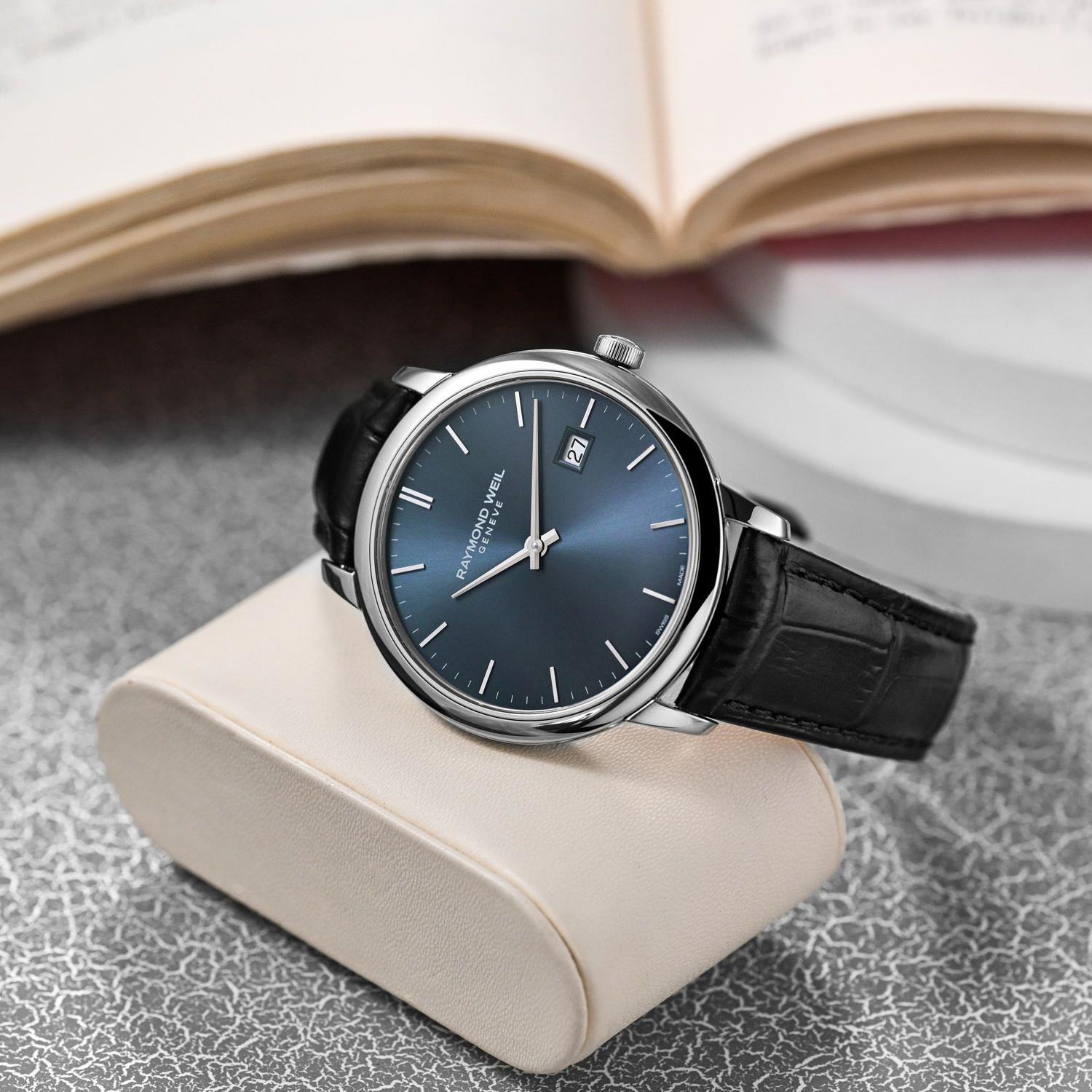 ساعت مچی مردانه ریموند ویل Raymon Weil با طراحی روزانه بند چرمی و قاب گرد استیل و صفحه گرد سرمه ای با شیشه ضد خراش و قابلیت داشتن تقویم و موتور سوییسی با انرژی باتری و مقاوم در برابر آب تا عمق 50 متر به همراه گارانتی بین الملی