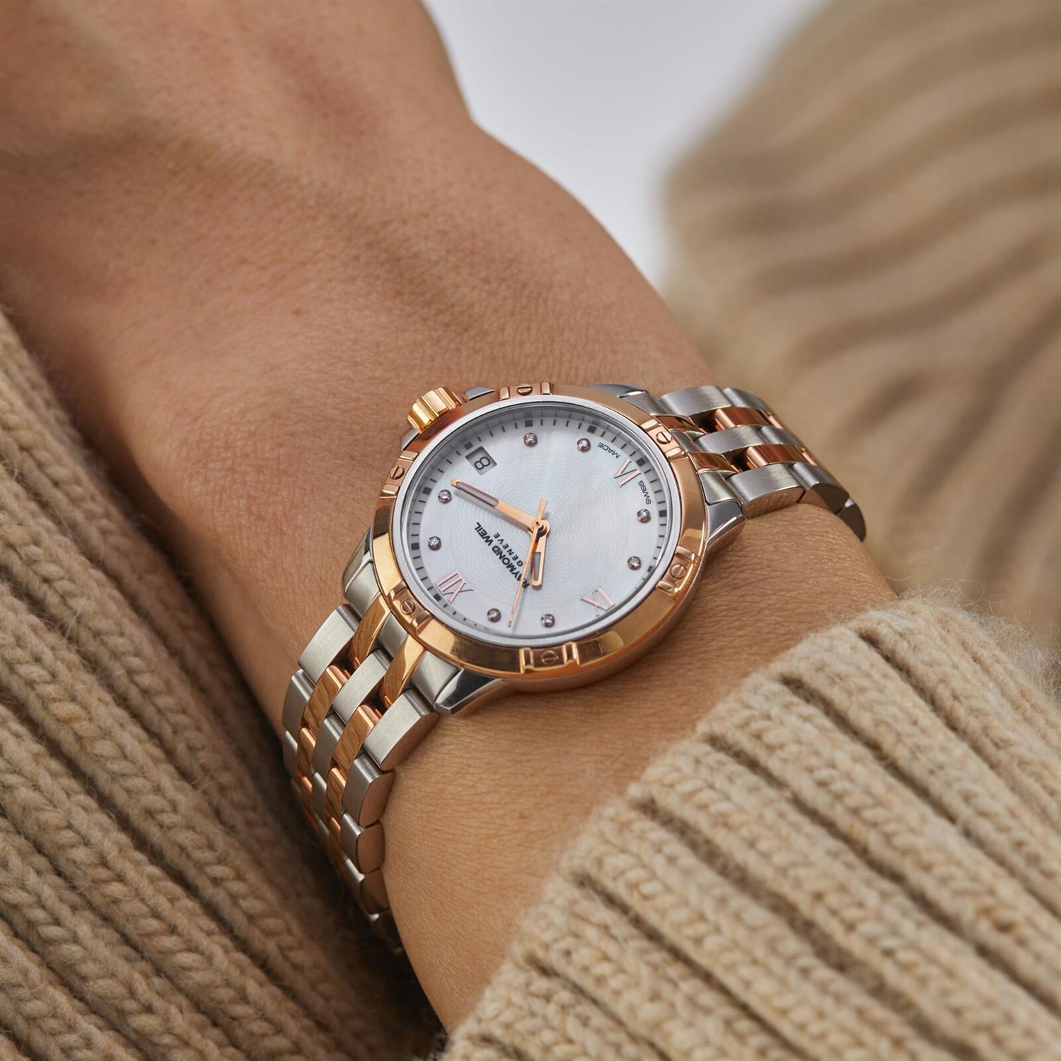 ساعت مچی زنانه ریموند ویل Raymon Weil با طراحی کلاسیک بند استیل مسی و قاب گرد مسی استیل و صفحه مزین به نگین سفید صدفی با شیشه ضد خراش و قابلیت داشتن تقویم/ شبنما و موتور سوییسی با انرژی باتری و مقاوم در برابرآب تا عمق 100 متر به همراه گارانتی بین المللی