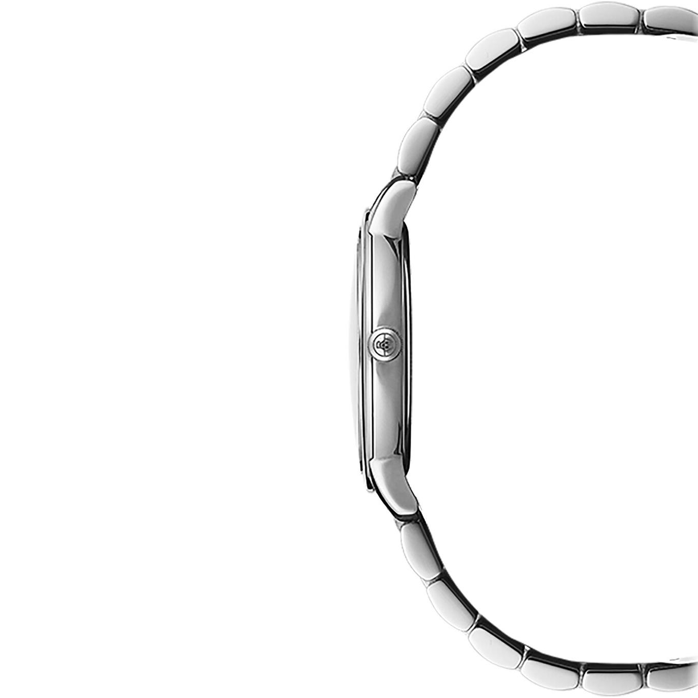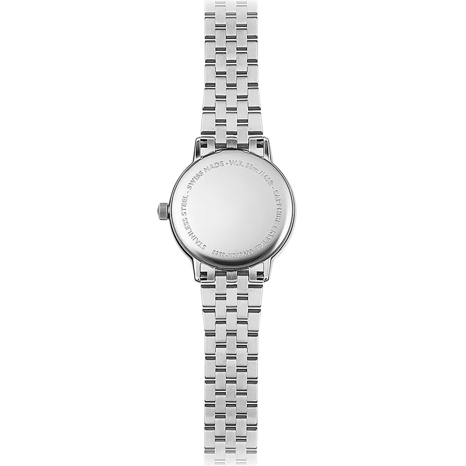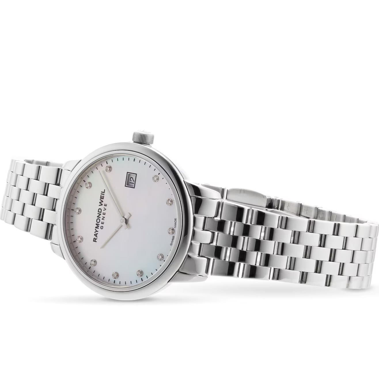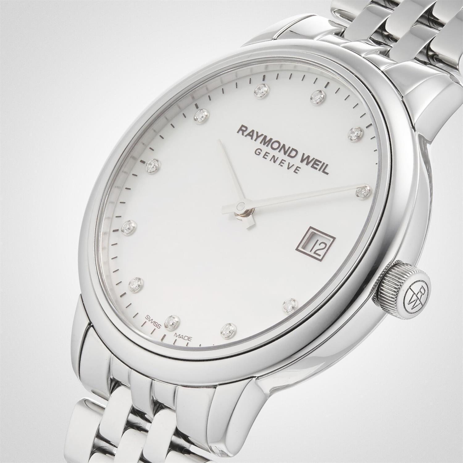 ساعت مچی زنانه ریموند ویل Raymon Weil با طراحی کلاسیک بند استیل قاب گرد استیل و صفحه مزین به نگین سفید صدفی با شیشه ضد خراش وقابلیت داشتن تقویم و موتور سوییسی با انرژی باتری و مقاوم در برابرآب تا عمق 50 متر به همراه گارانتی بین المللی
