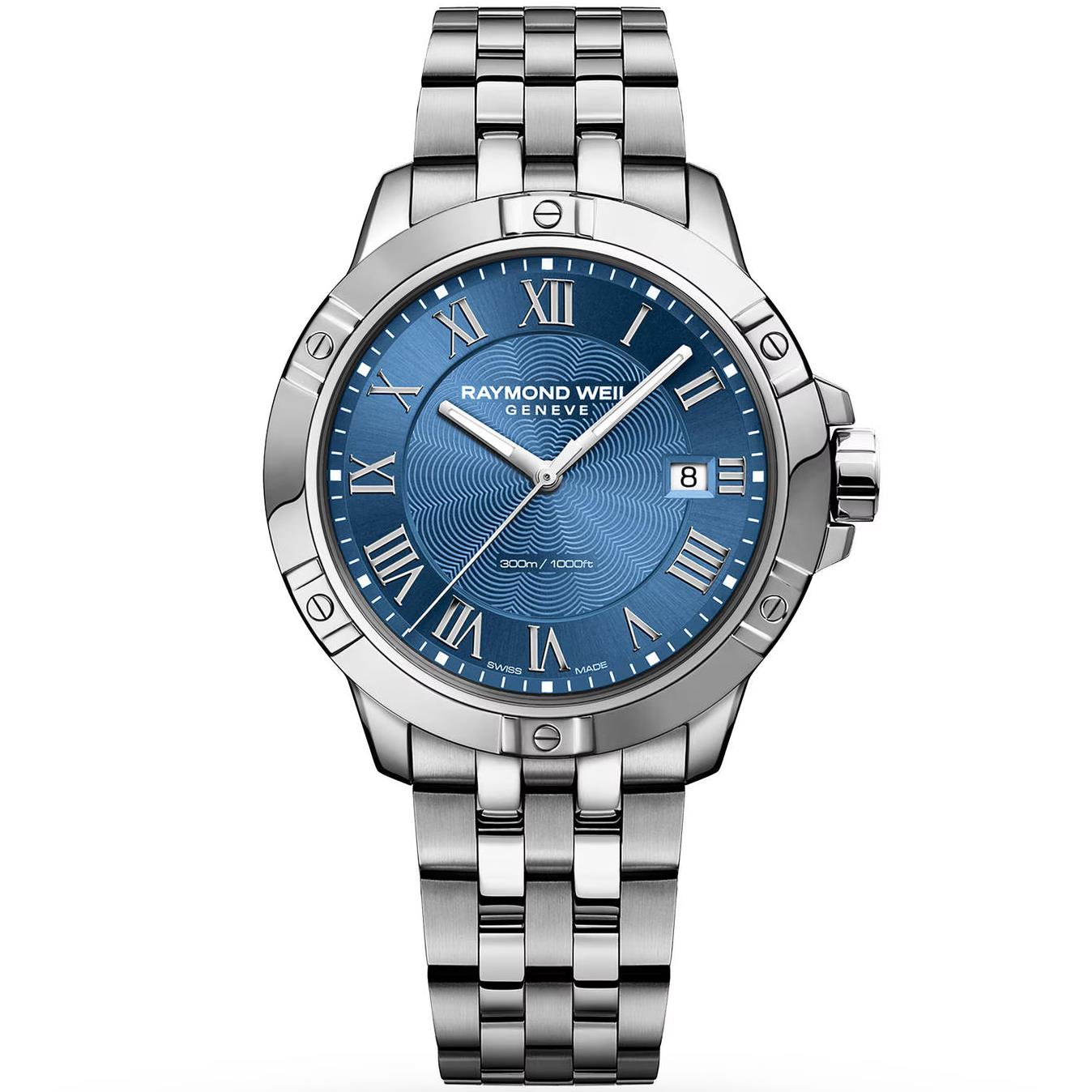 ساعت مچی مردانه ریموند ویل Raymon Weil با طراحی روزانه بند استیل و قاب گرد استیل و صفحه سرمه ای با شیشه ضد خراش وقابلیت داشتن تقویم / شب نما و موتور سوییسی وانرژی باتری و مقاوم در برابر آب تا عمق 300 متر به همراه گارانتی بین الملی