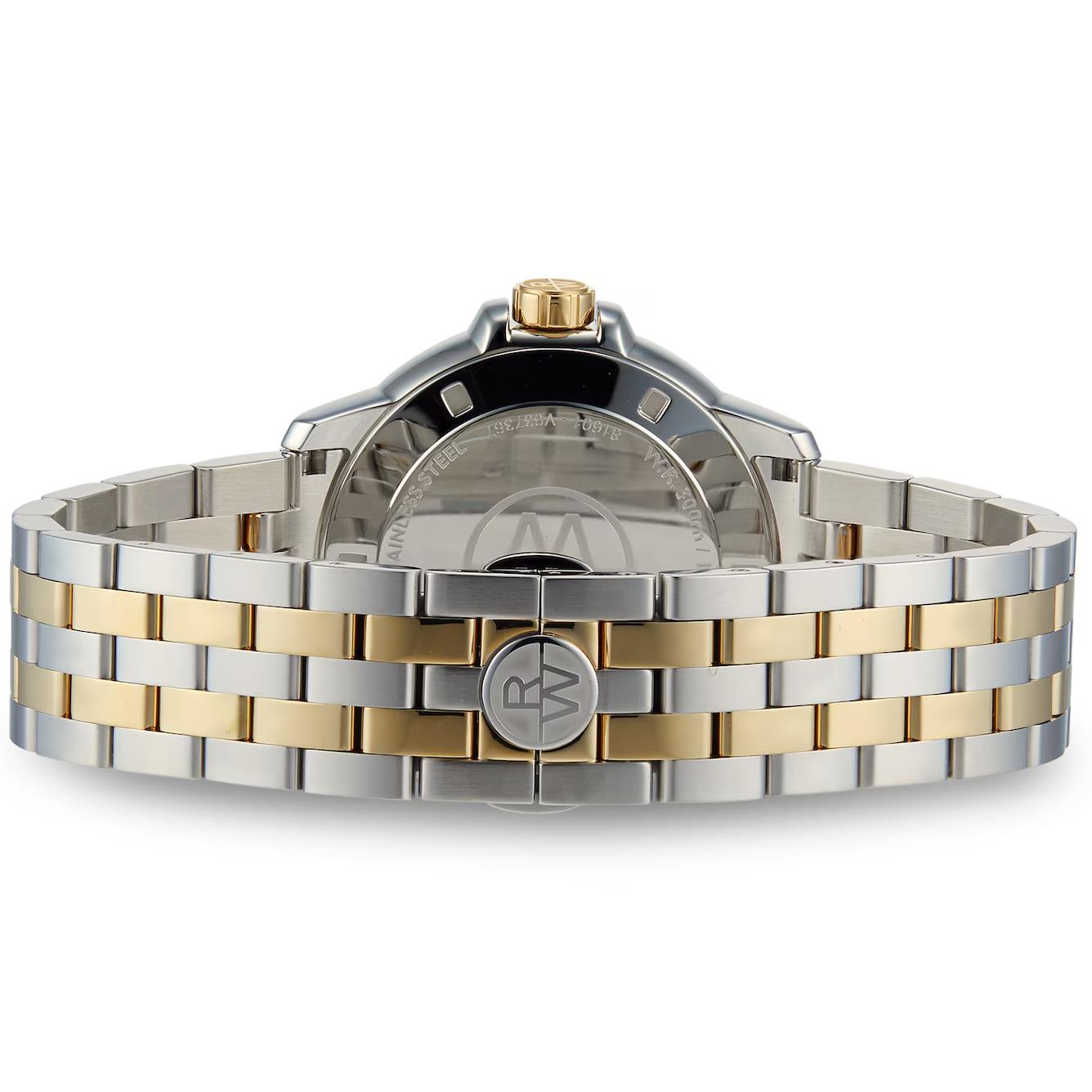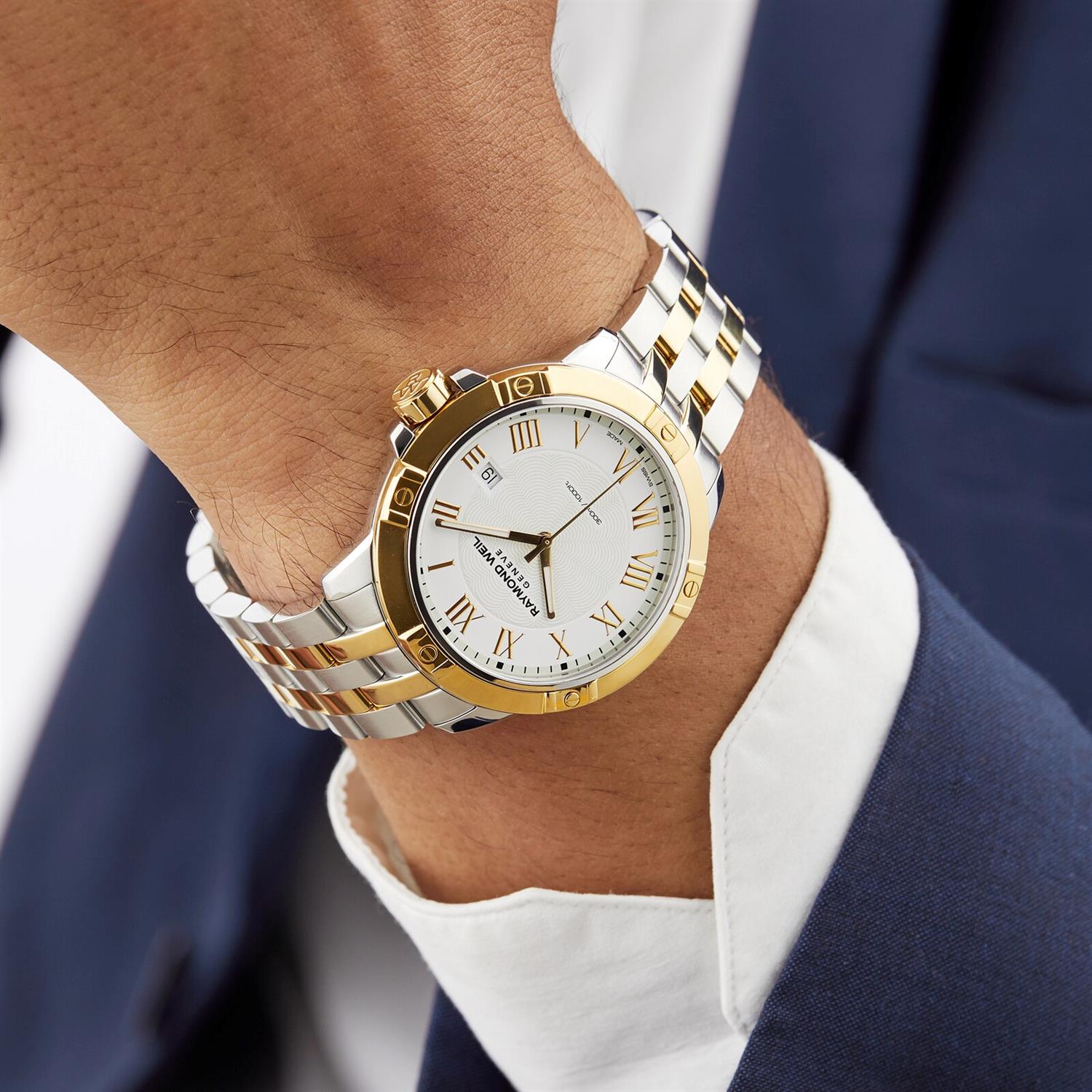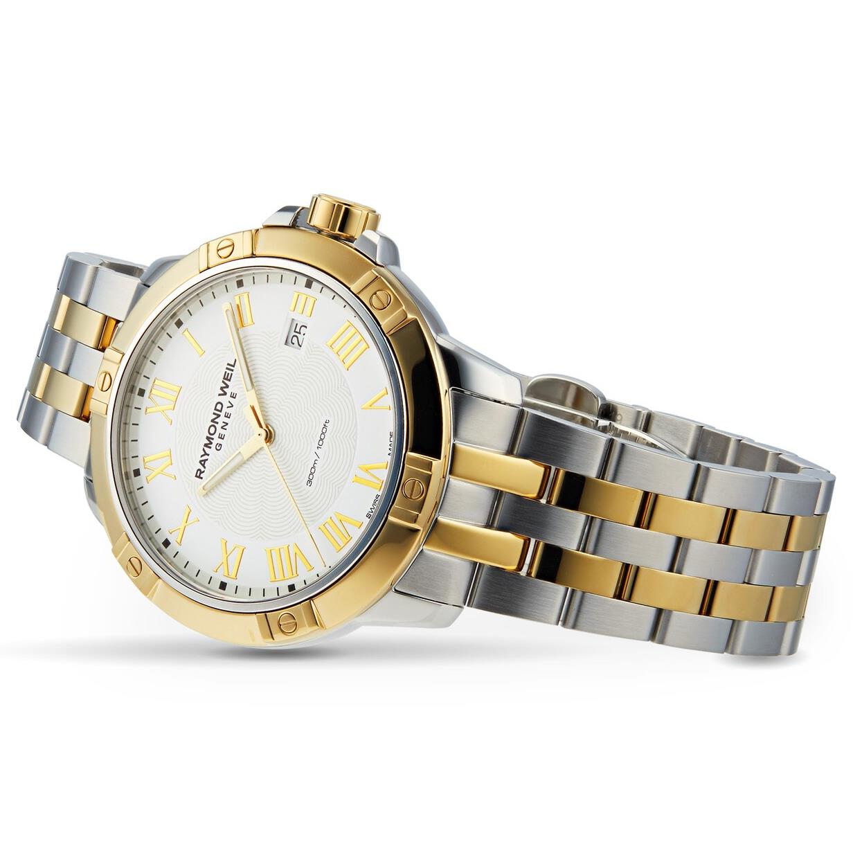 ساعت مچی مردانه ریموند ویل Raymon Weil با طراحی روزانه بند استیل طلایی و قاب گرد استیل طلایی و صفحه سفید با شیشه ضد خراش و قابلیت داشتن تقویم / شب نما و موتور سوییسی و انرژی باتری و مقاوم در برابر آب تا عمق 300 متر به همراه گارانتی بین الملی