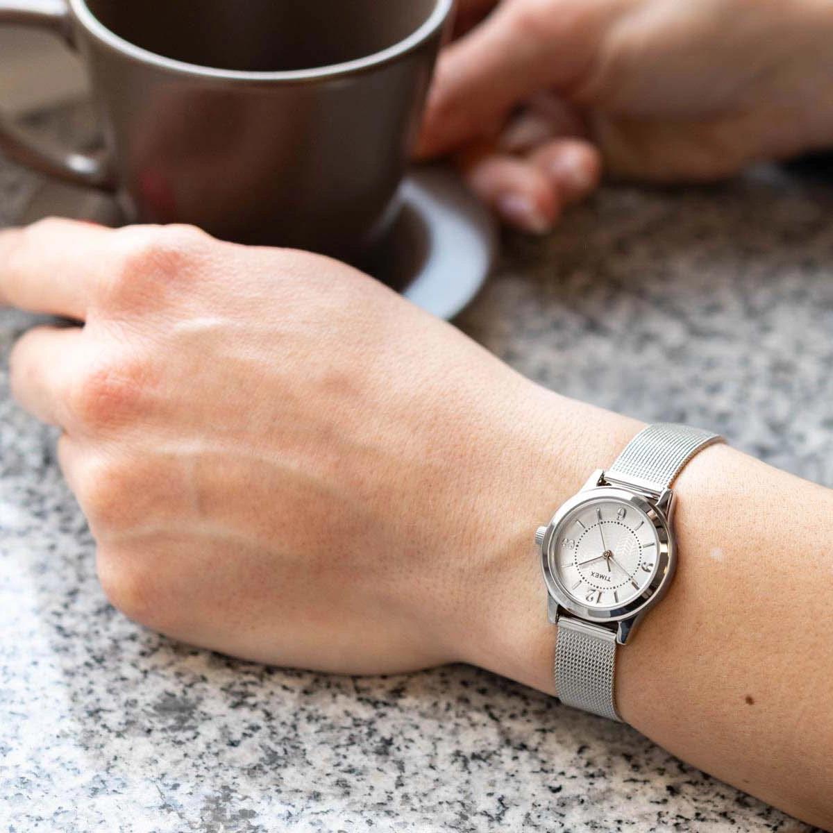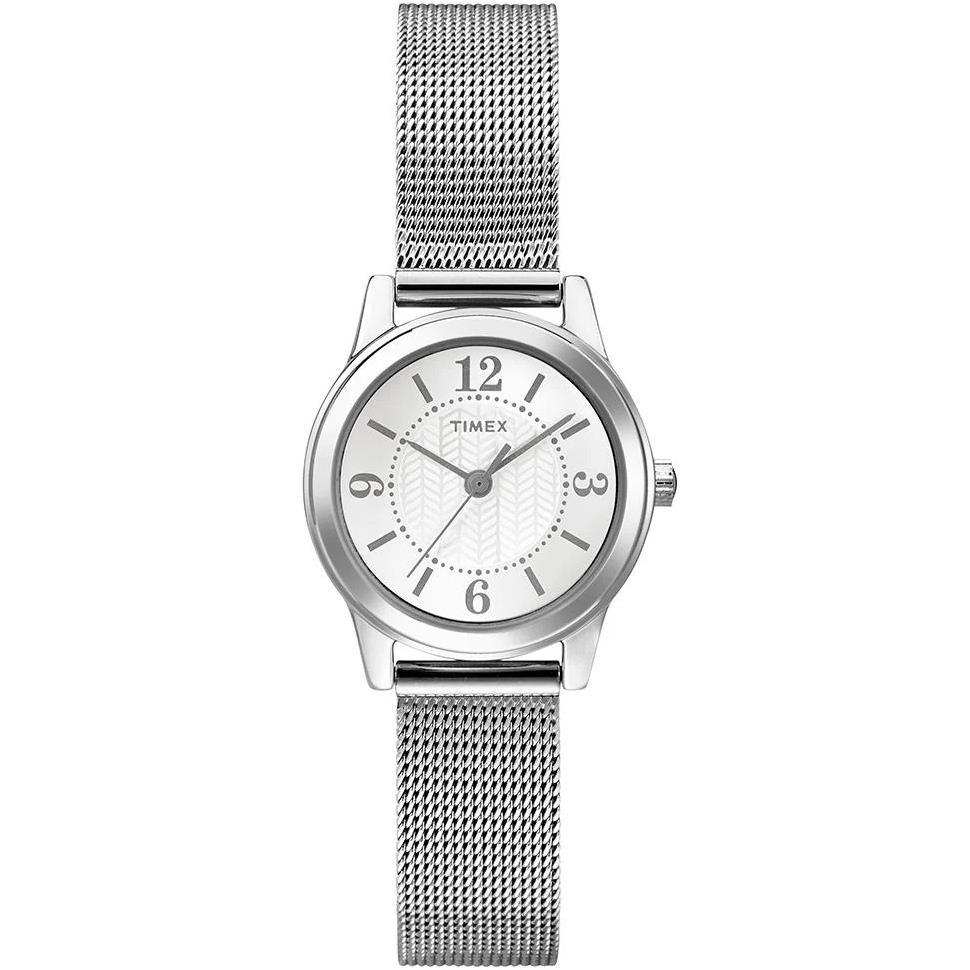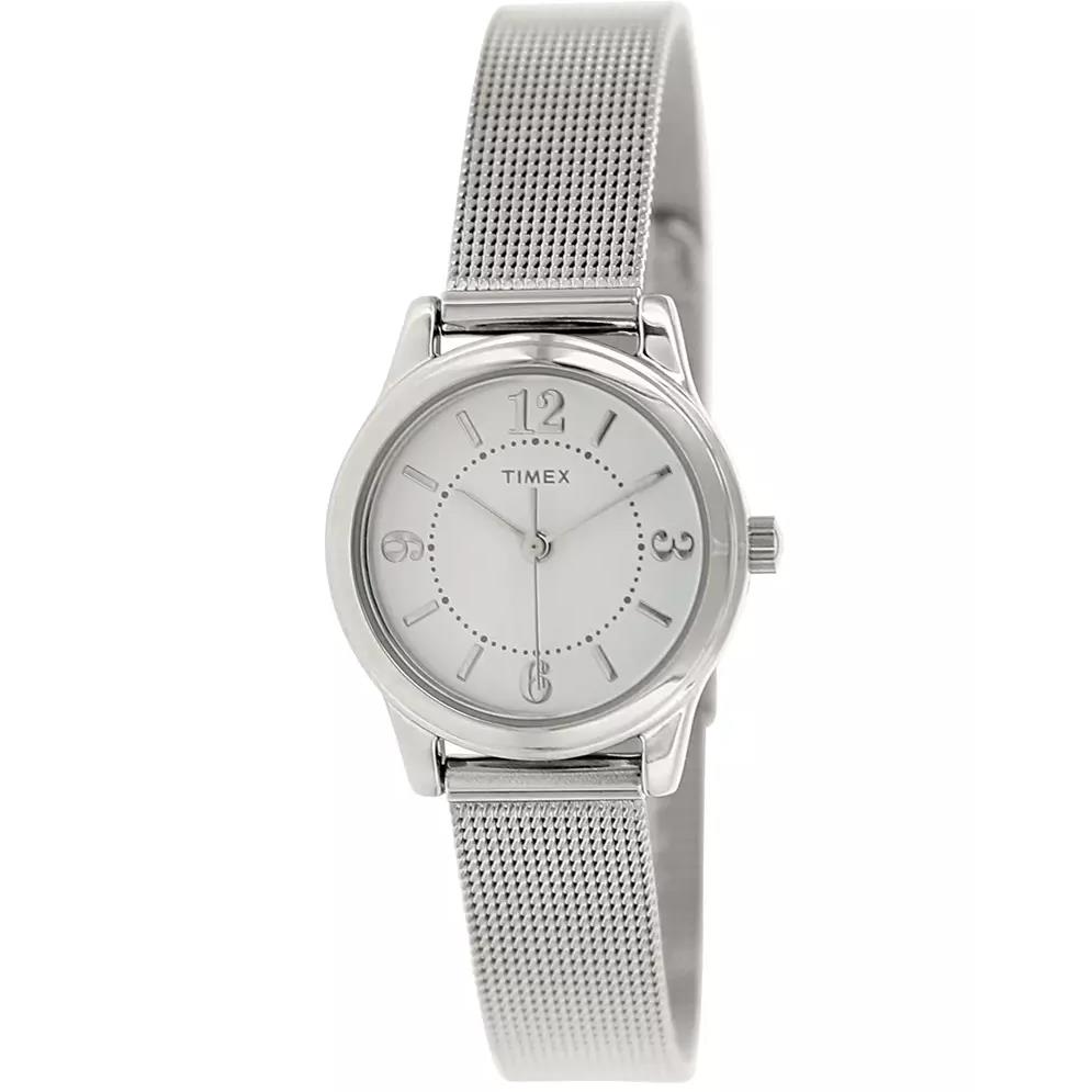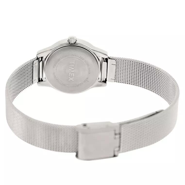 ساعت مچی زنانه تایمکس timex با طراحی کلاسیک بند حصیر بافت استیل و قاب گرد فلزی با صفحه گرد نقره ای و موتور ژاپنی با انرژی باطری و مقاوم در برابر آب تا عمق 30 متر به همراه گارانتی بین المللی