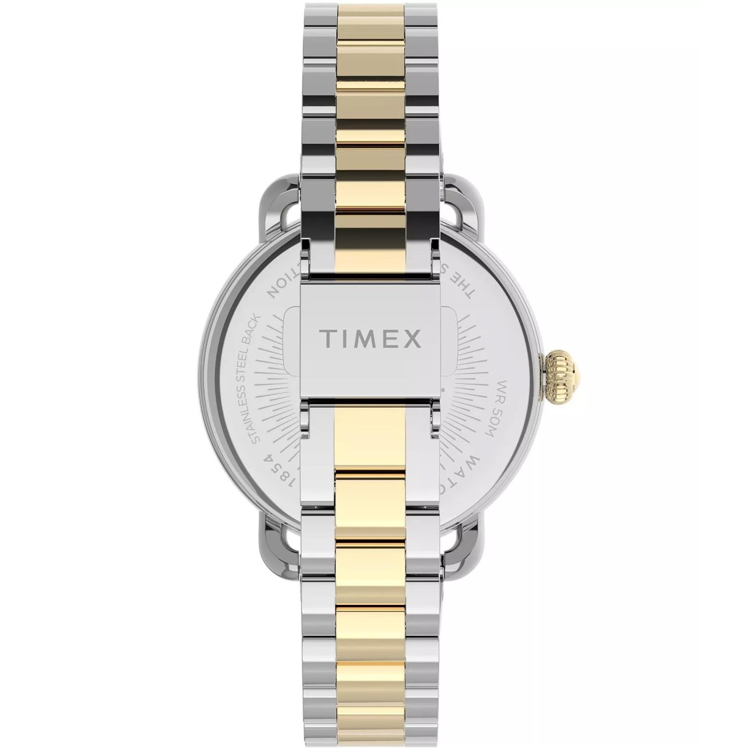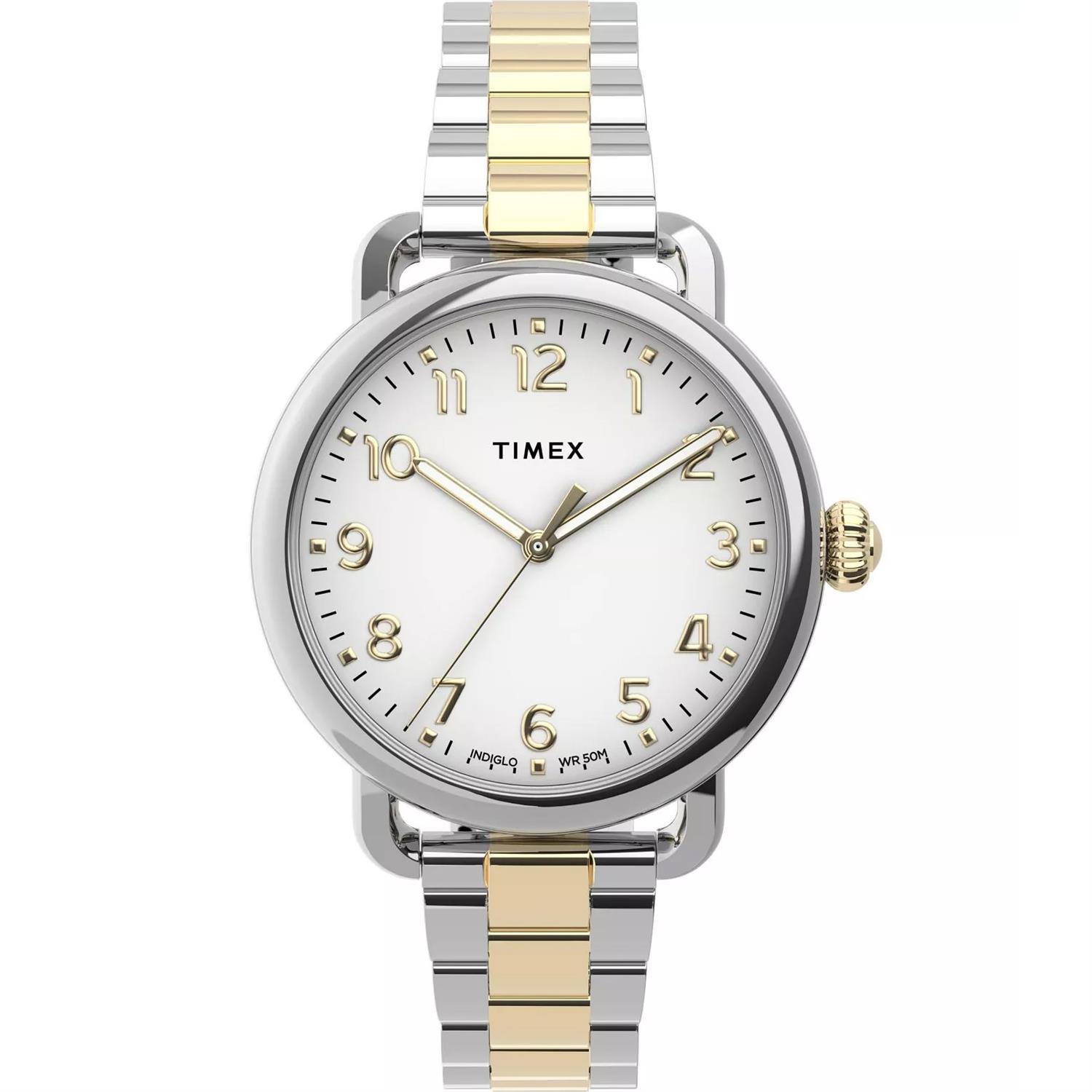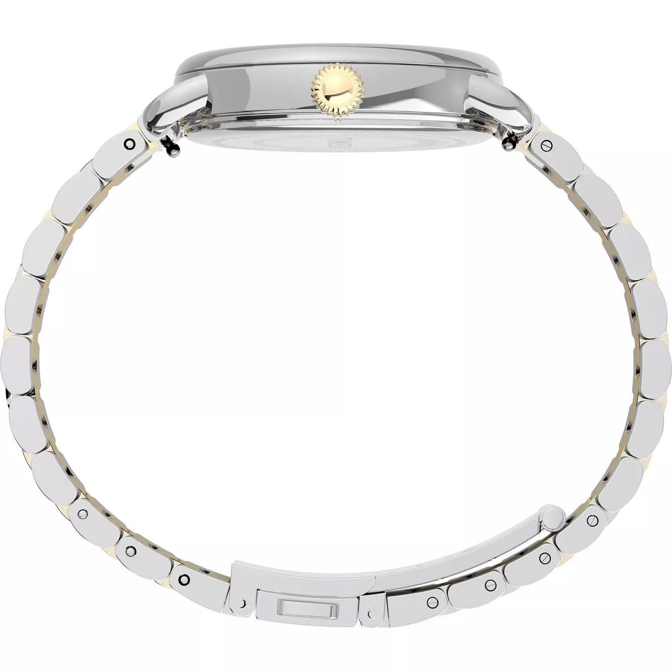 ساعت مچی زنانه تایمکس timex با طراحی کلاسیک بند استیل طلایی و قاب برنج با روکش استیل با صفحه گرد سفید و قابلیت داشتن شب نما و موتور ژاپنی با انرژی باطری و مقاوم در برابر آب تا عمق 50 متر به همراه گارانتی بین المللی