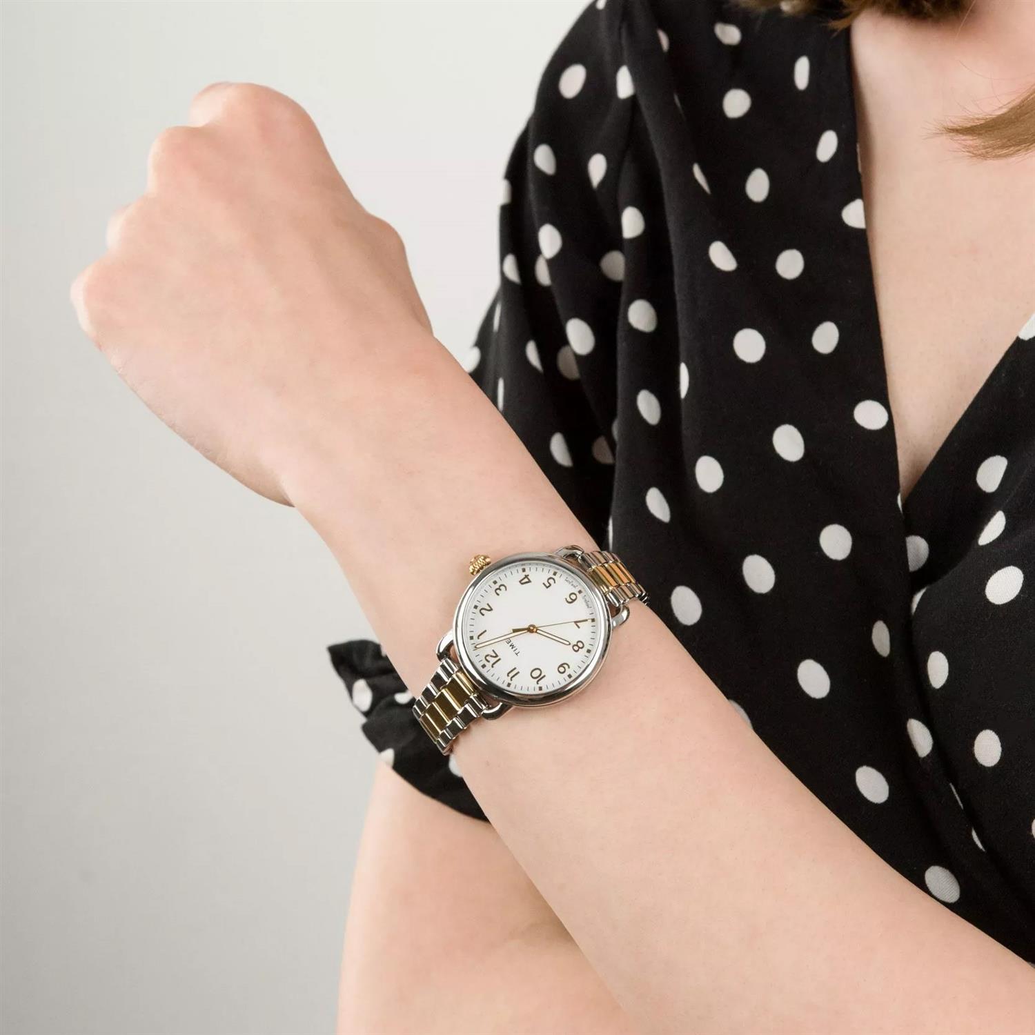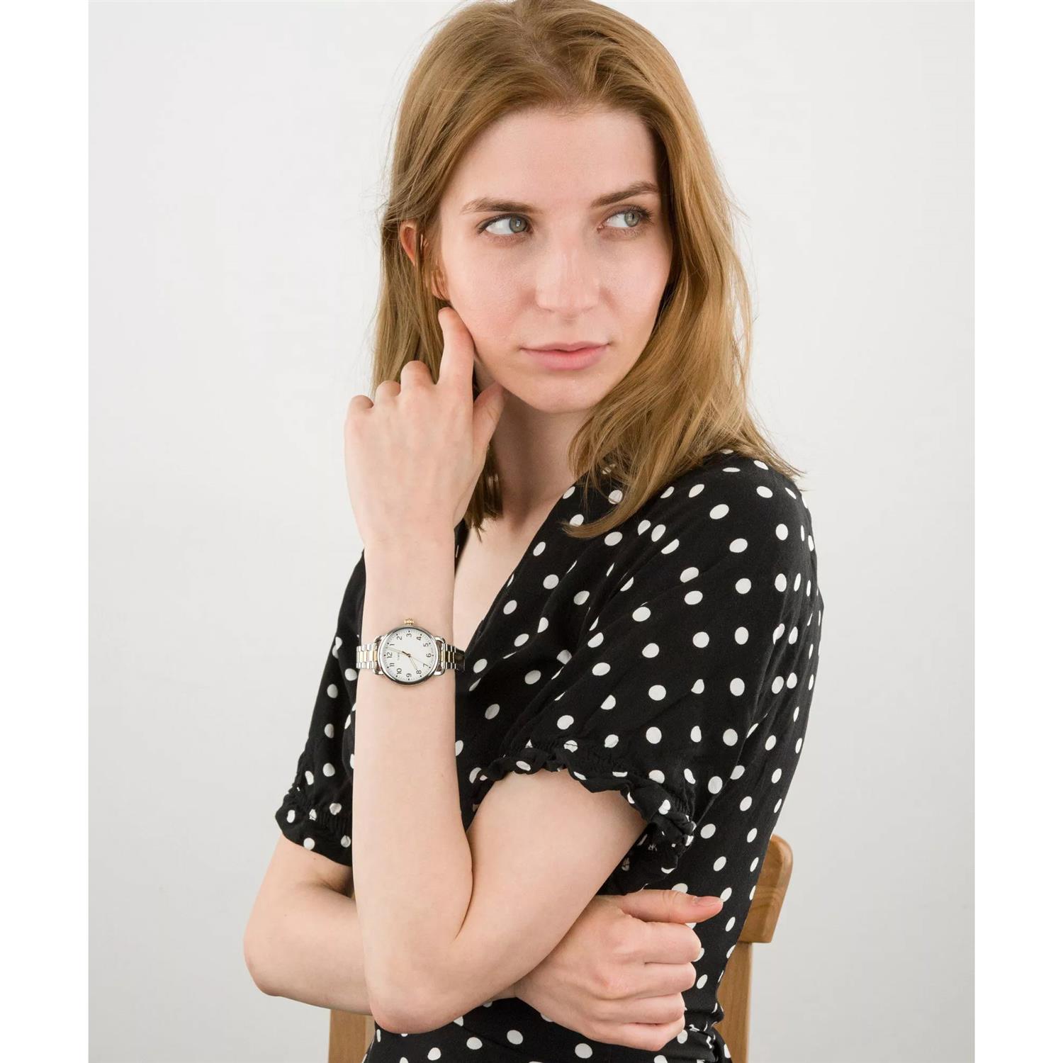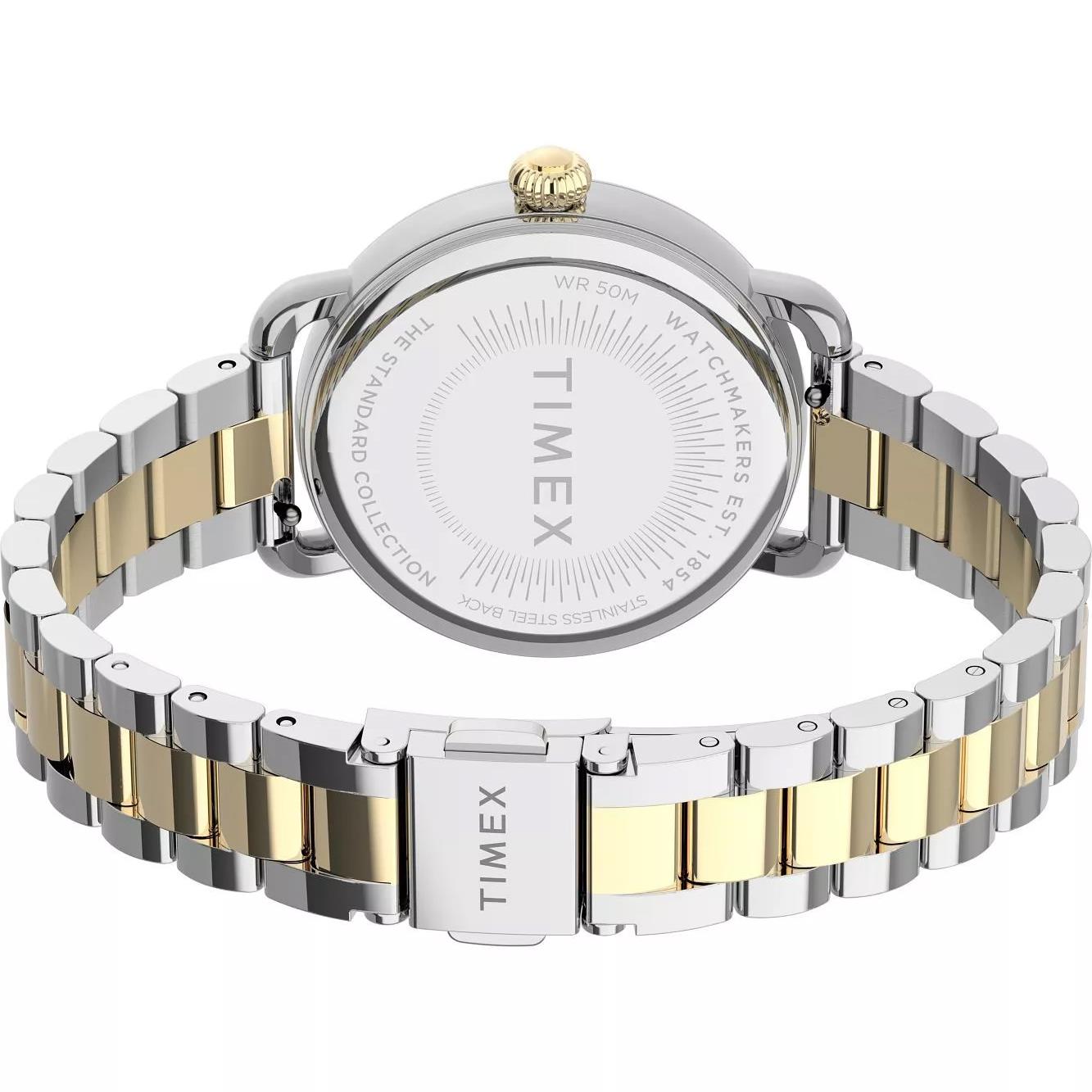 ساعت مچی زنانه تایمکس timex با طراحی کلاسیک بند استیل طلایی و قاب برنج با روکش استیل با صفحه گرد سفید و قابلیت داشتن شب نما و موتور ژاپنی با انرژی باطری و مقاوم در برابر آب تا عمق 50 متر به همراه گارانتی بین المللی