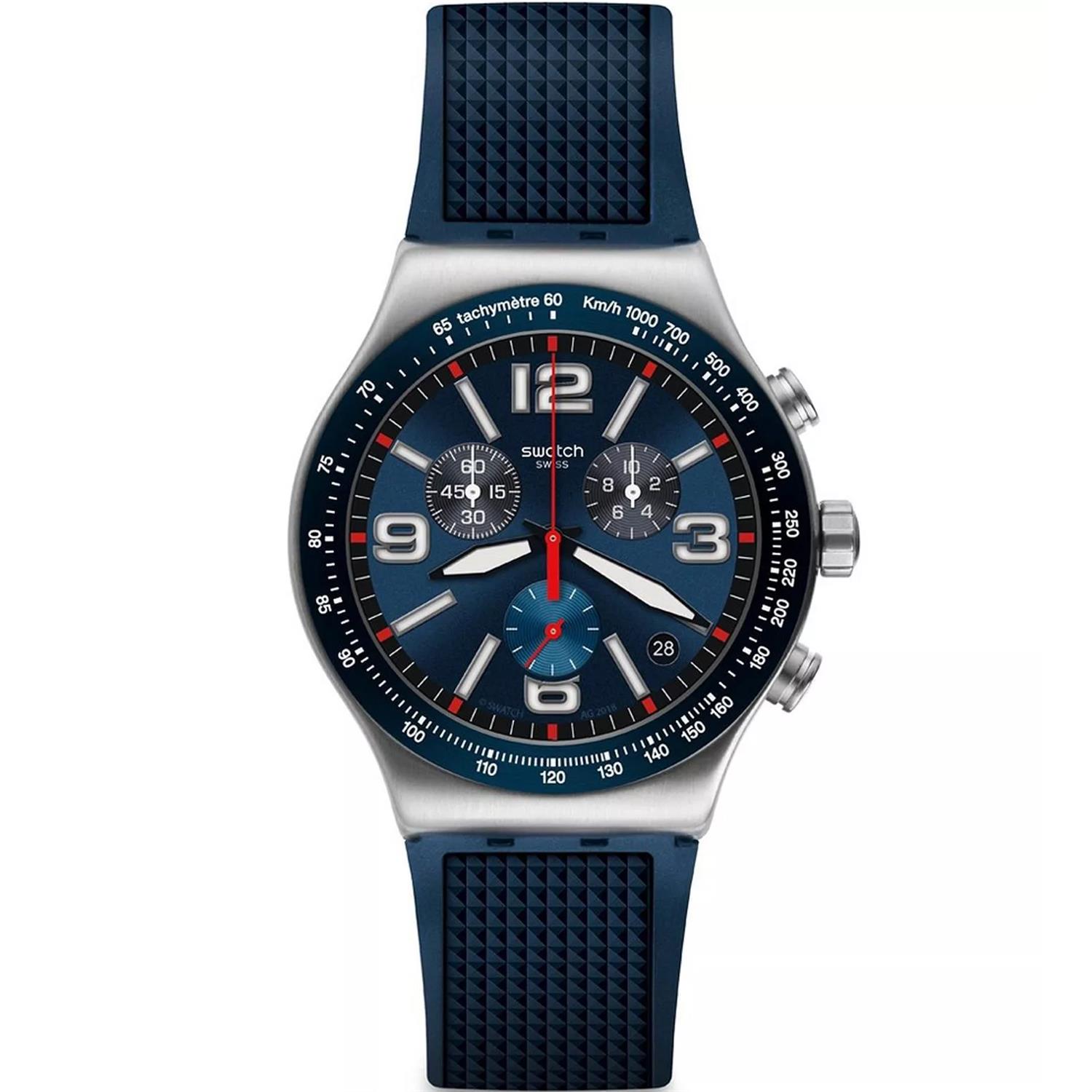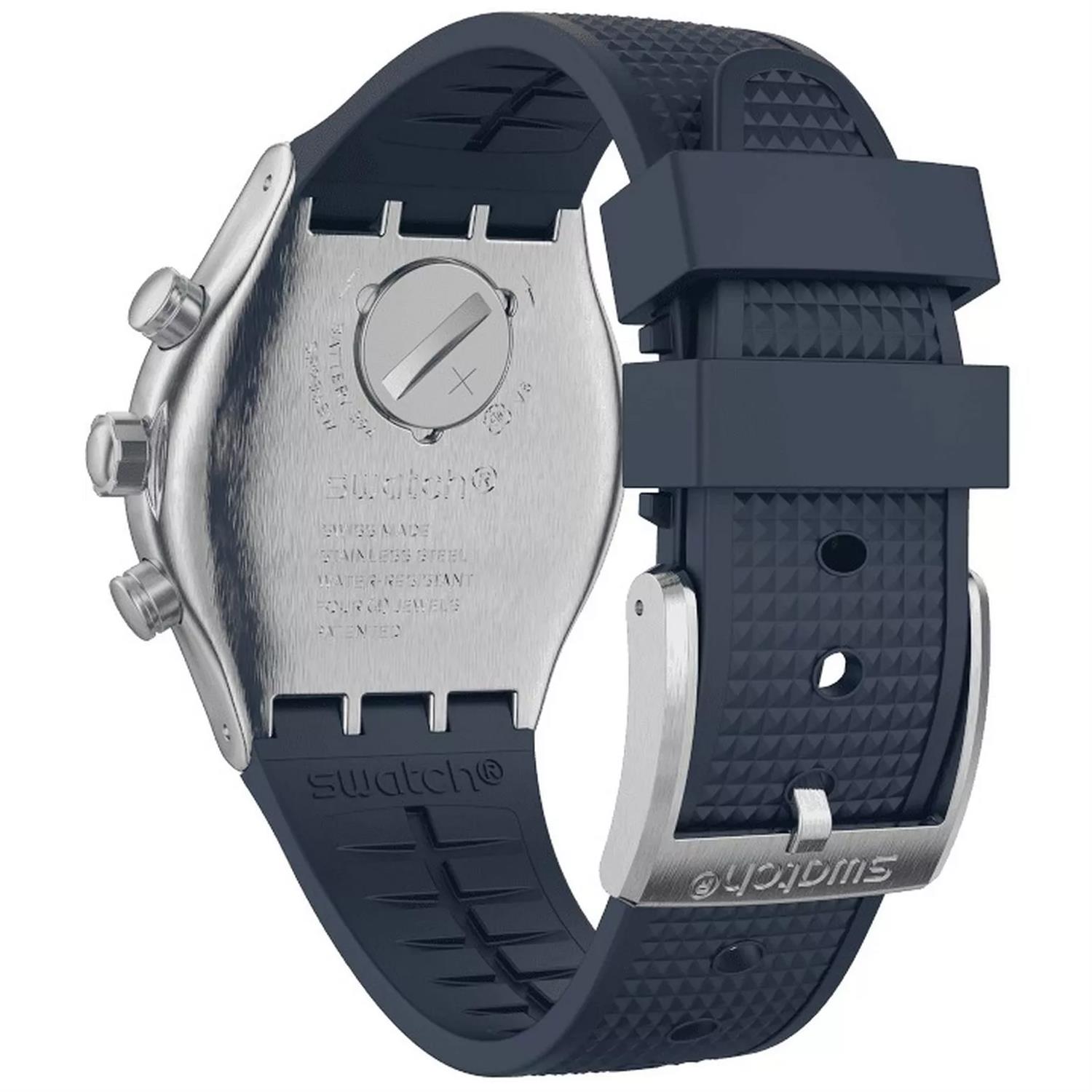 ساعت مچی مردانه سواچ SWATCH با طراحی روزانه بند سیلیکونی سرمه ای  و قاب گرد دو رنگ و صفحه گرد سرمه ای و موتور سوییسی با انرژی باتری و قابلیت داشتن شب نما / کرنوگراف / تقویم / زه تاچی متر و مقاوم در برابر آب تا عمق 30 متر به همراه دو سال گارانتی بین المللی